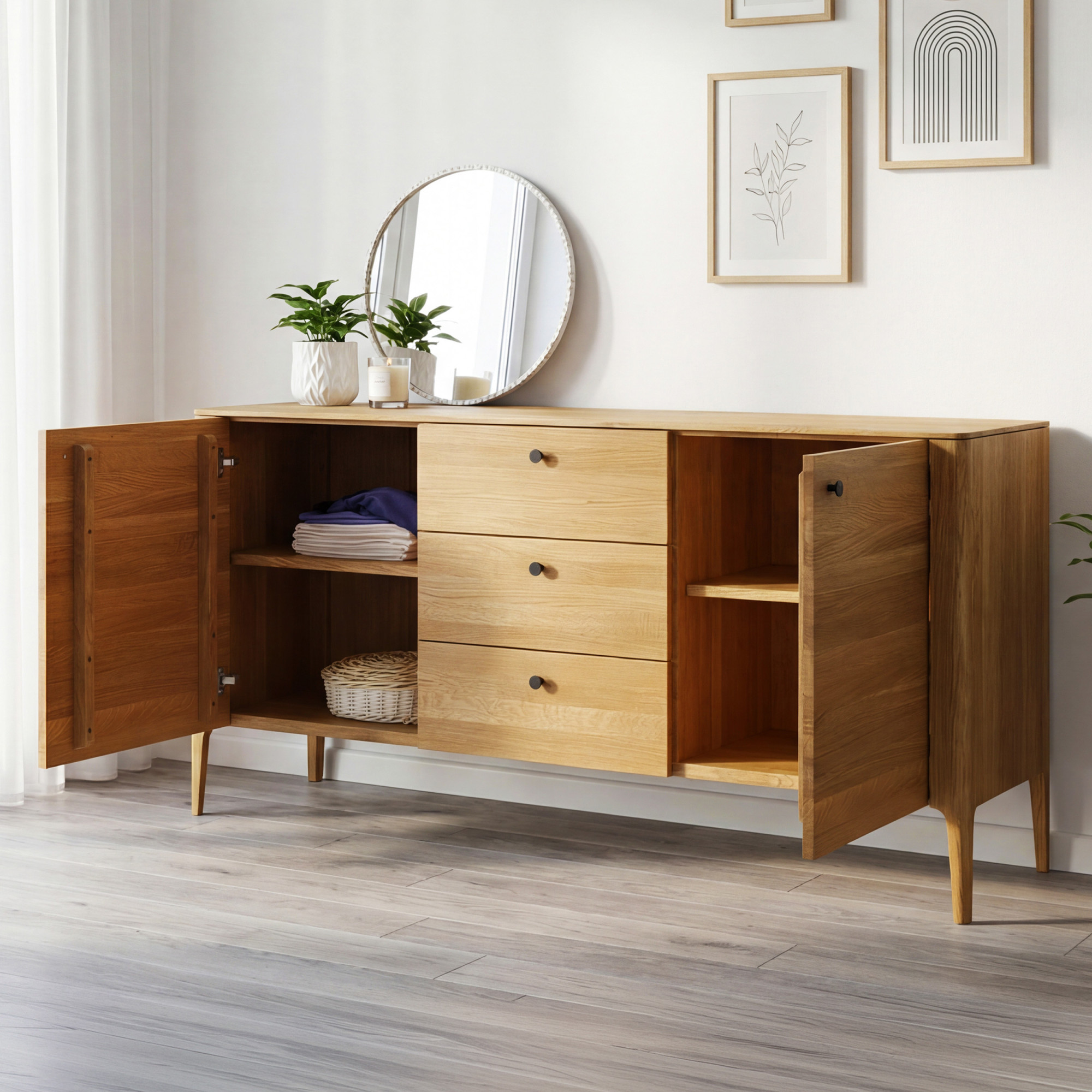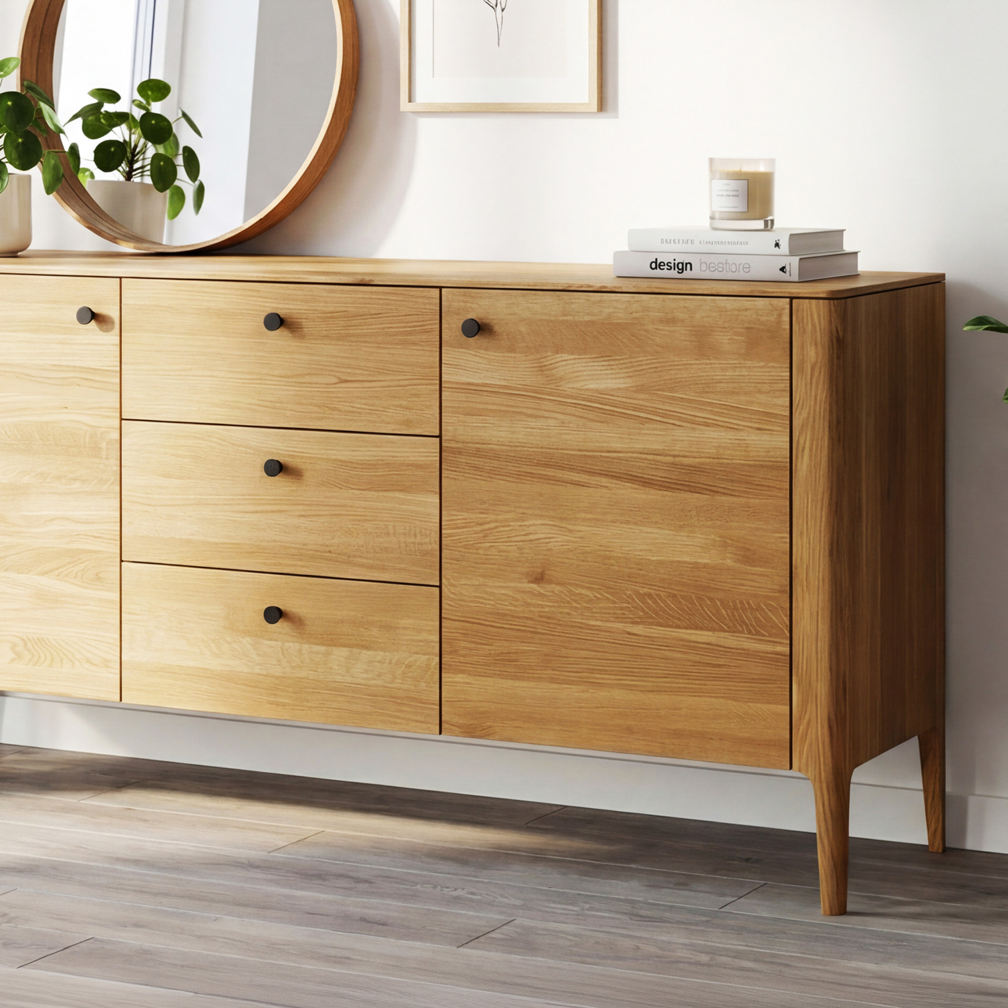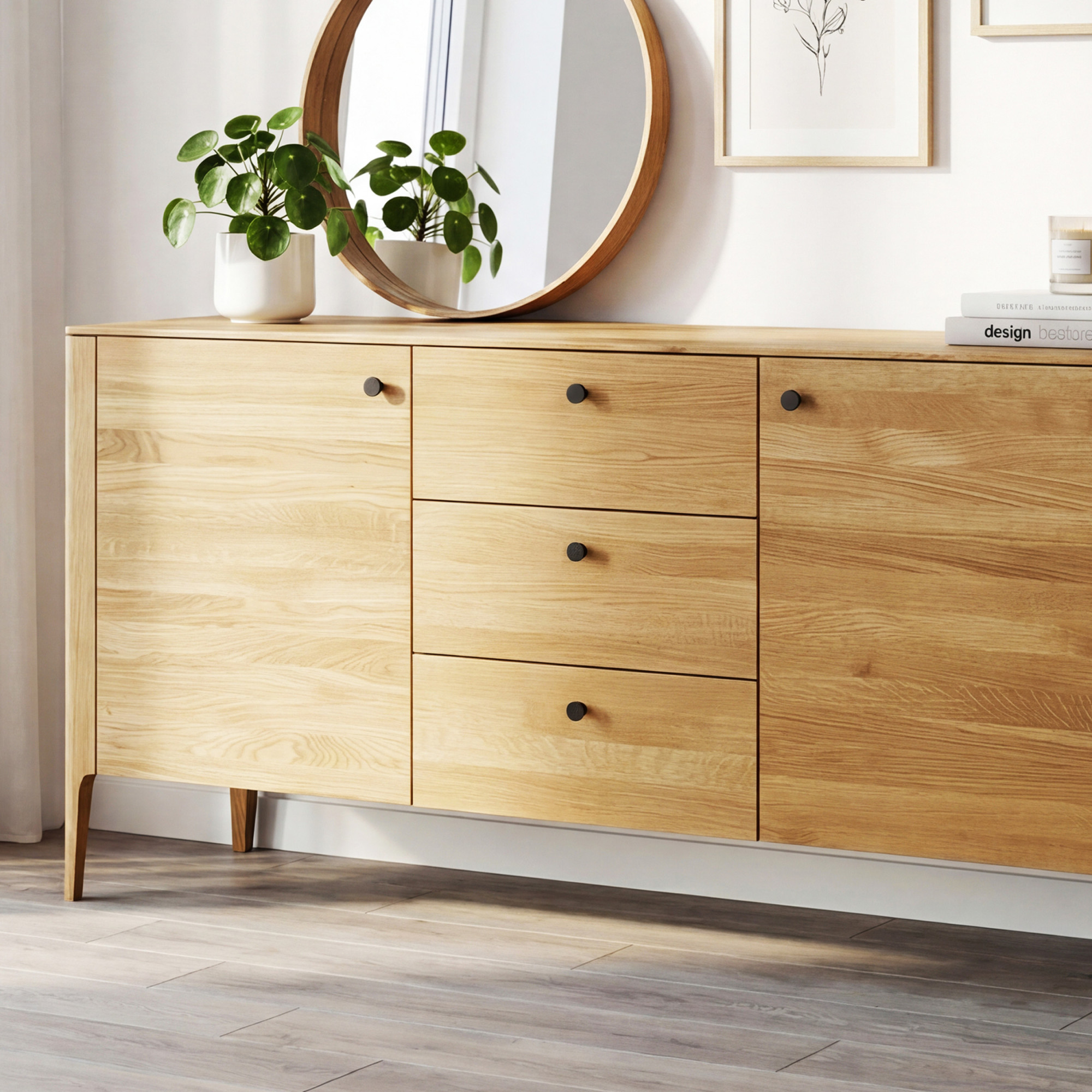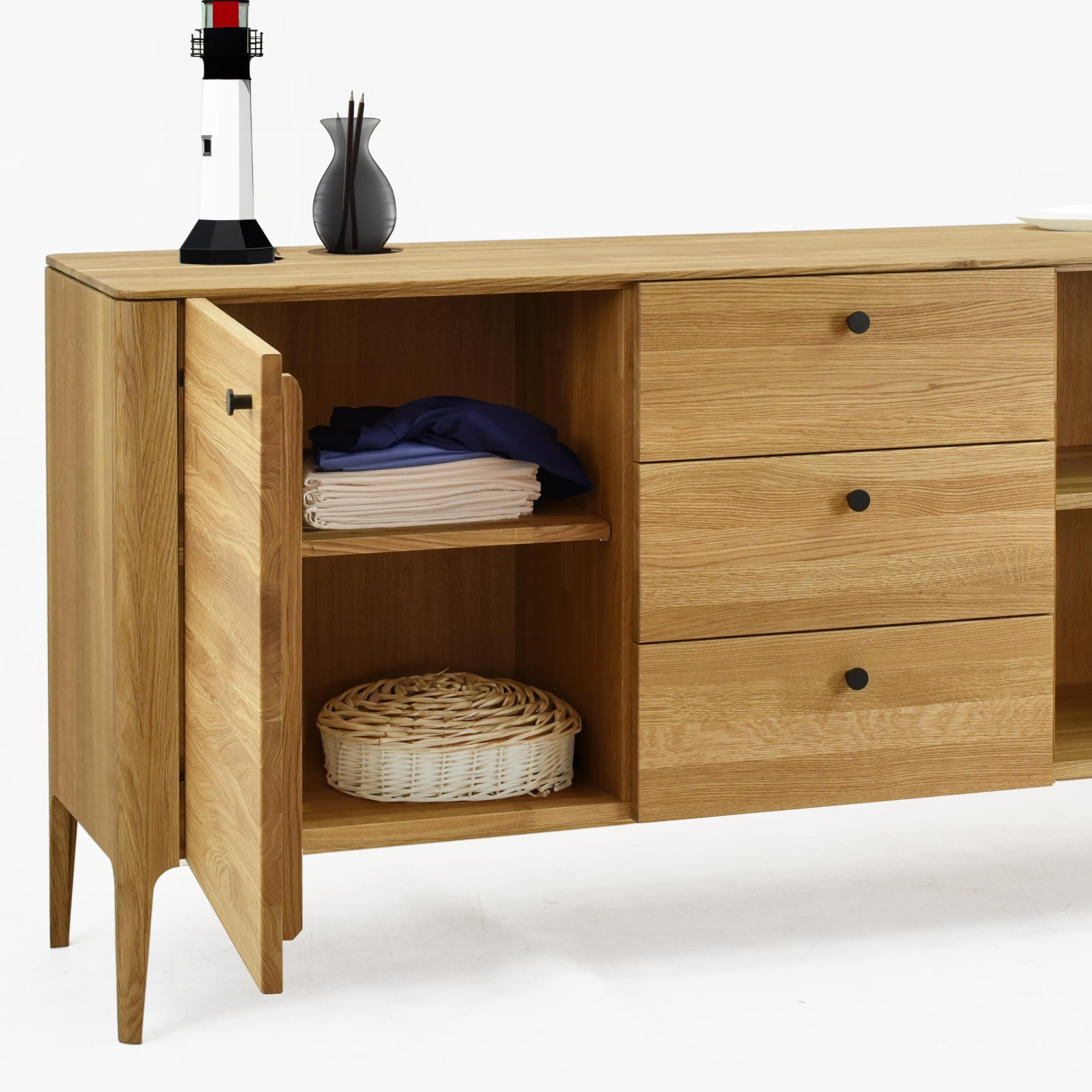 TV komoda je veľmi praktická vďaka svojmu usporiadaniu. Disponuje dvomi dvierkami a tromi priestrannými zásuvkami, ktoré poskytujú dostatok úložného priestoru pre vaše elektronické zariadenia, knihy, dekorácie a ďalšie nevyhnutnosti. Všetky zásuvky a dvierka sú vybavené tichým zatváraním soft-close, čo zaisťuje hladký a tichý chod, a tým predlžuje životnosť nábytku. Povrch komody je ošetrený kvalitným talianskym olejom Borma Wachs v farbe dub natural, čo zvýrazňuje prirodzenú štruktúru dreva a poskytuje ochranu proti vonkajším vplyvom.