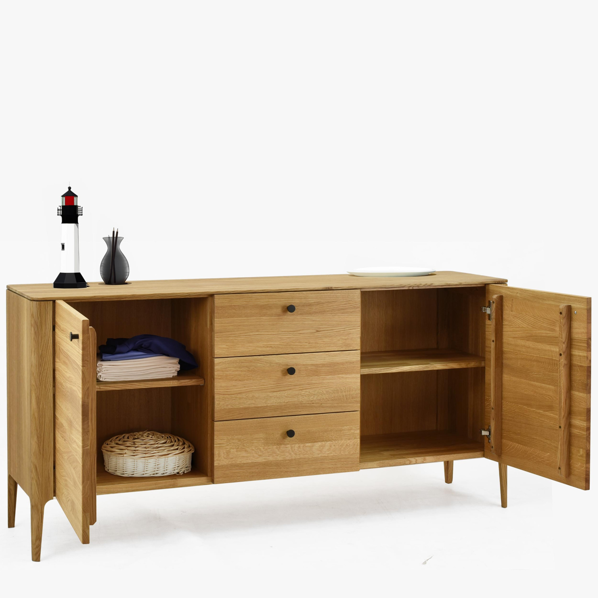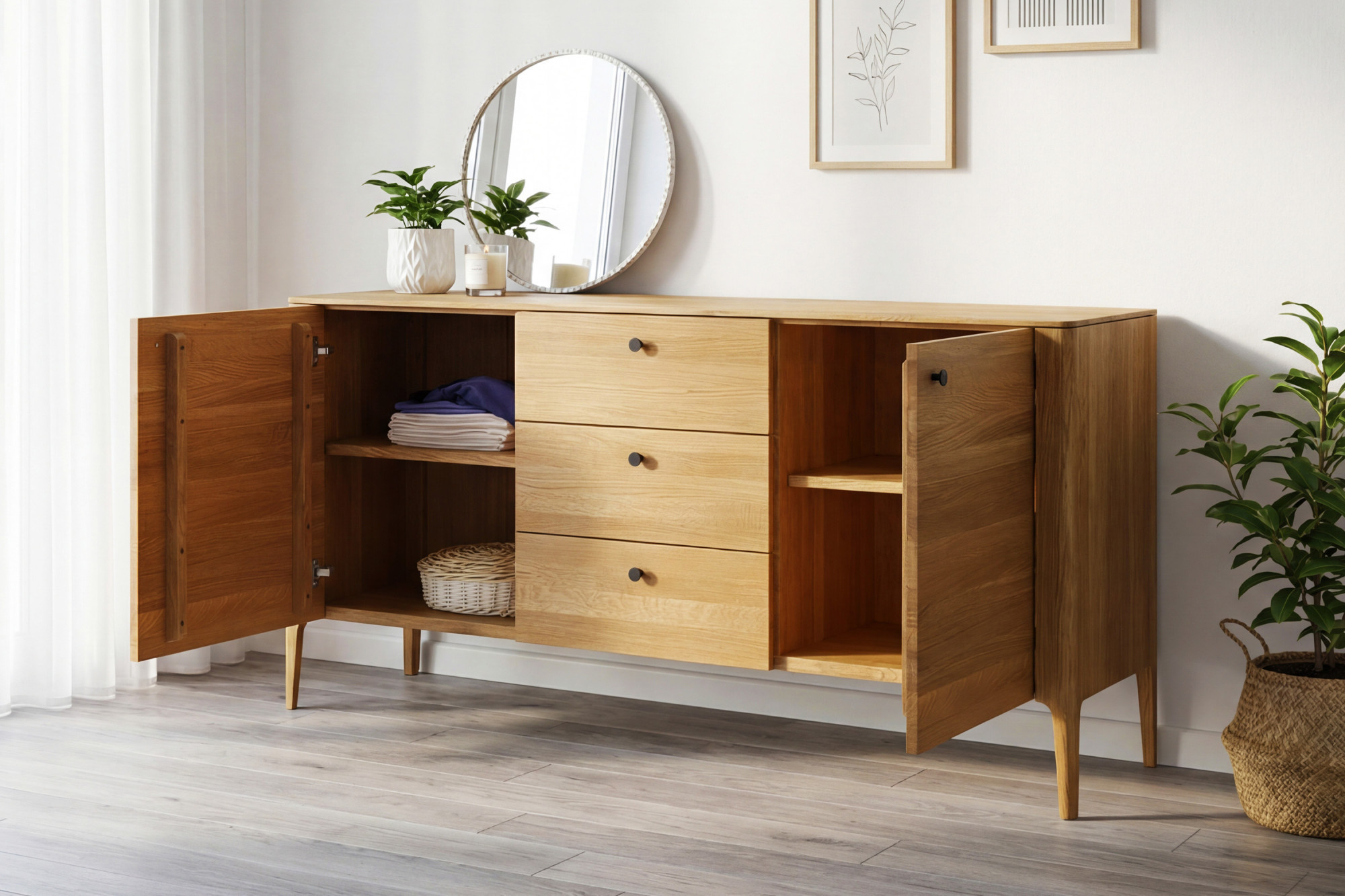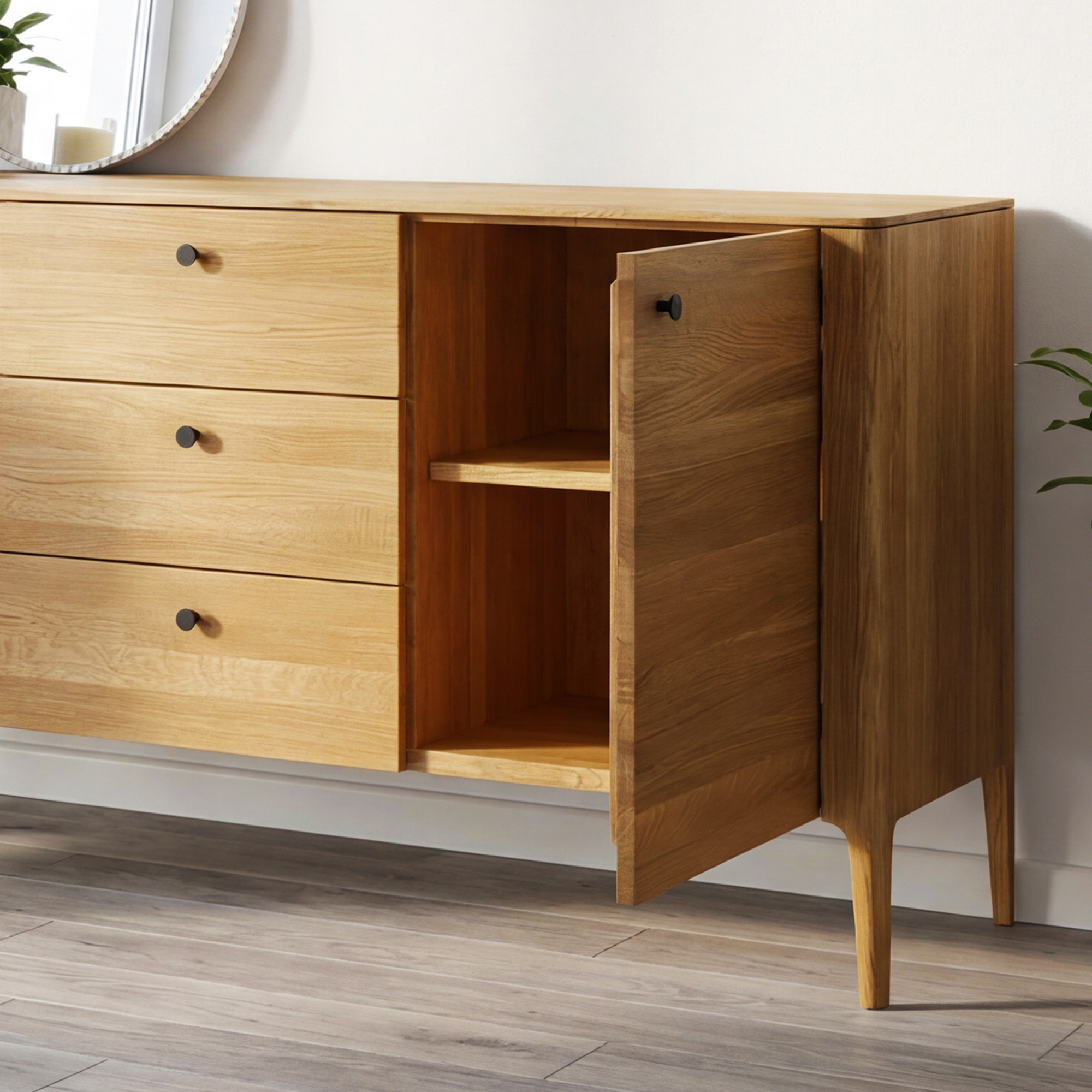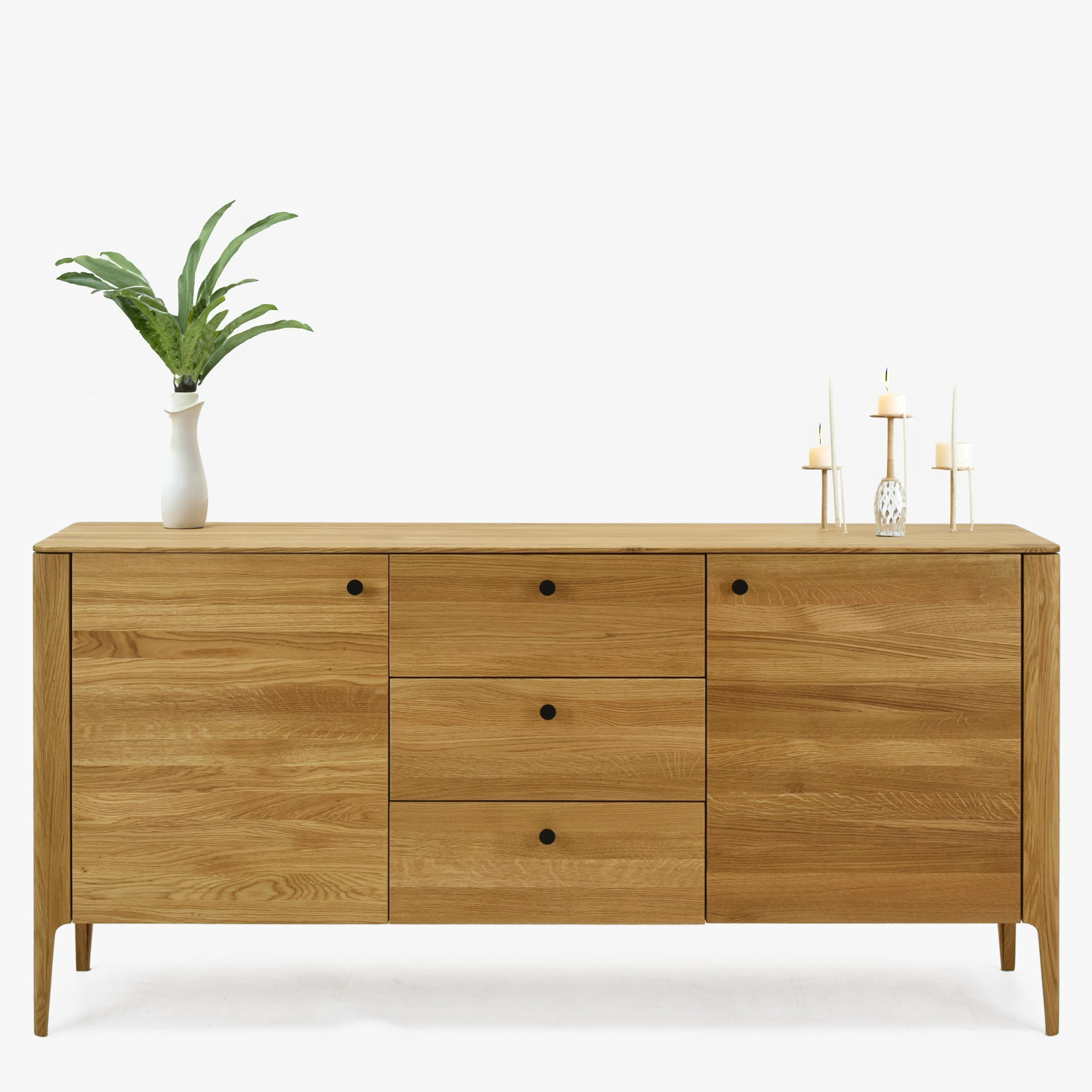 TV komoda je veľmi praktická vďaka svojmu usporiadaniu. Disponuje dvomi dvierkami a tromi priestrannými zásuvkami, ktoré poskytujú dostatok úložného priestoru pre vaše elektronické zariadenia, knihy, dekorácie a ďalšie nevyhnutnosti. Všetky zásuvky a dvierka sú vybavené tichým zatváraním soft-close, čo zaisťuje hladký a tichý chod, a tým predlžuje životnosť nábytku. Povrch komody je ošetrený kvalitným talianskym olejom Borma Wachs v farbe dub natural, čo zvýrazňuje prirodzenú štruktúru dreva a poskytuje ochranu proti vonkajším vplyvom.