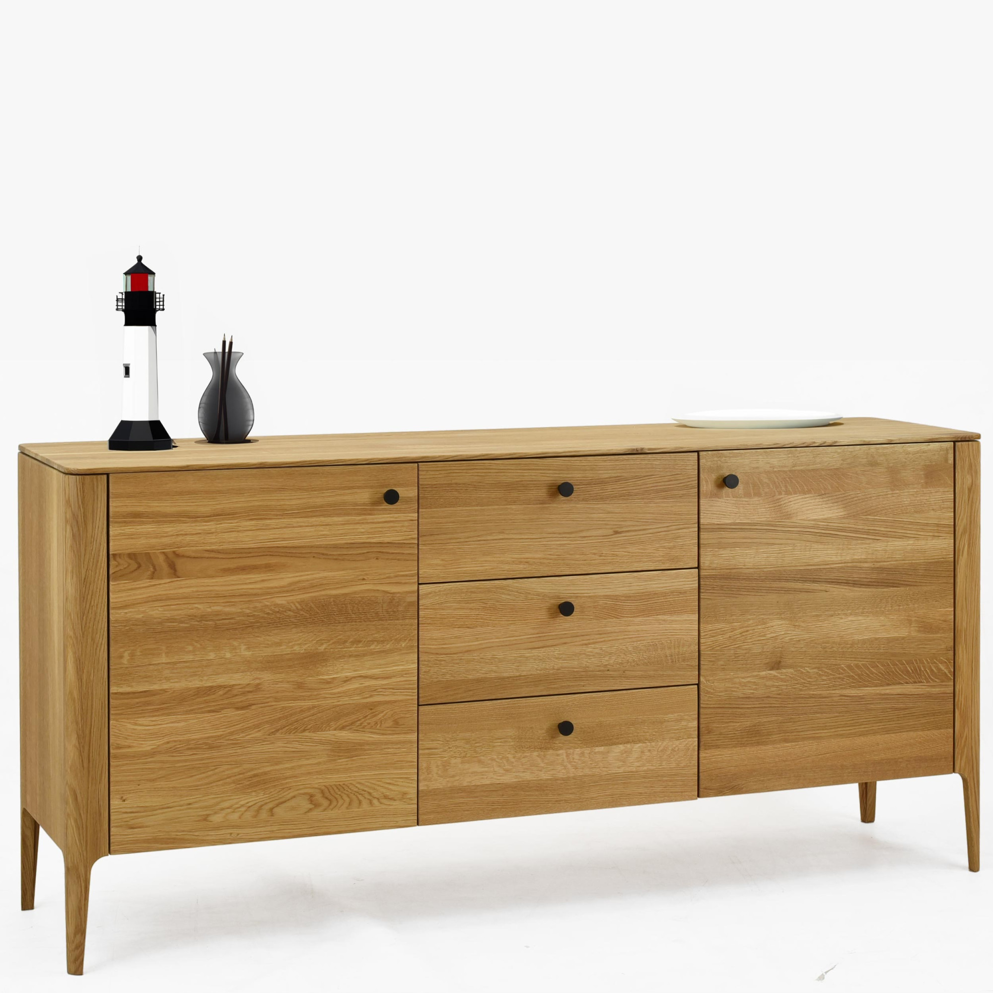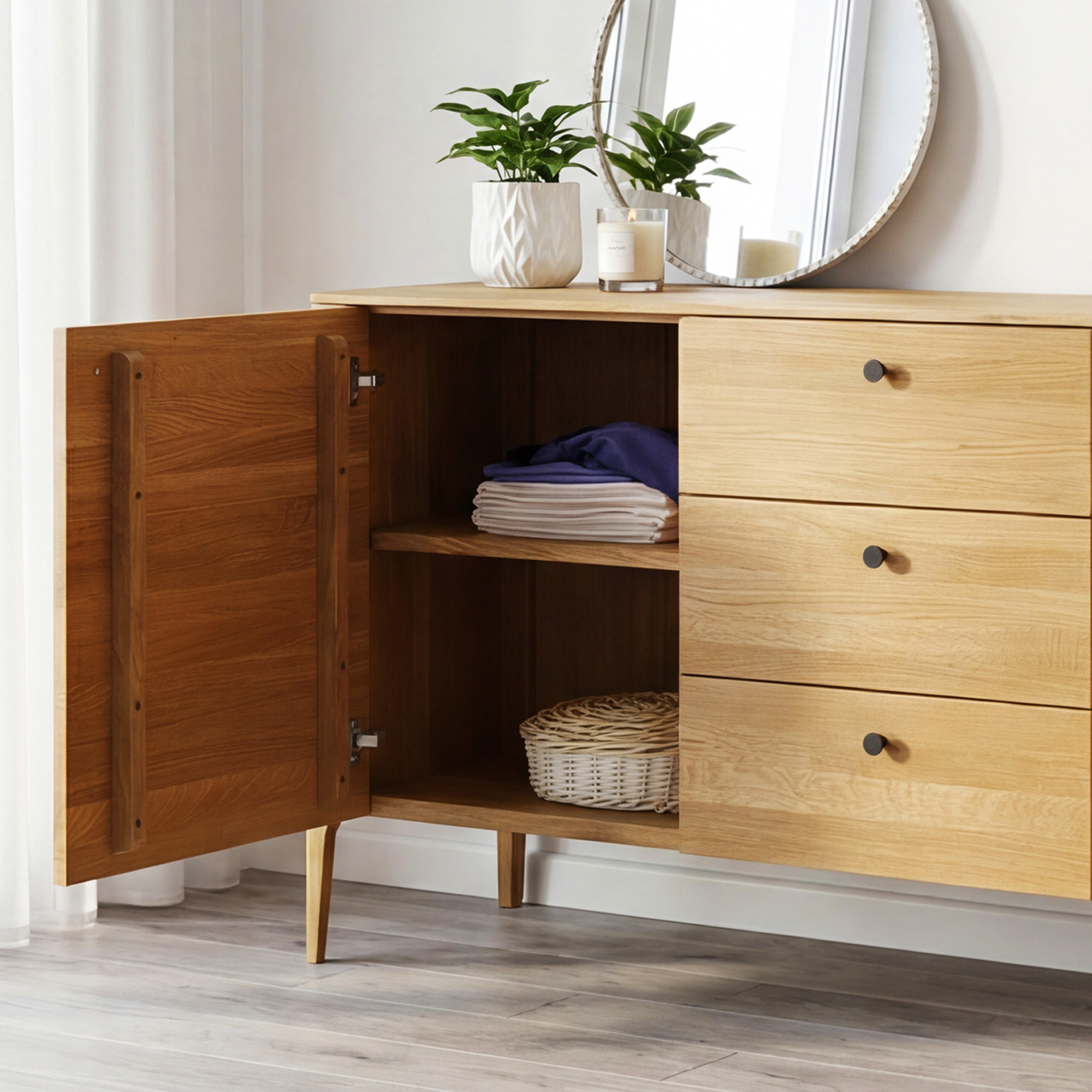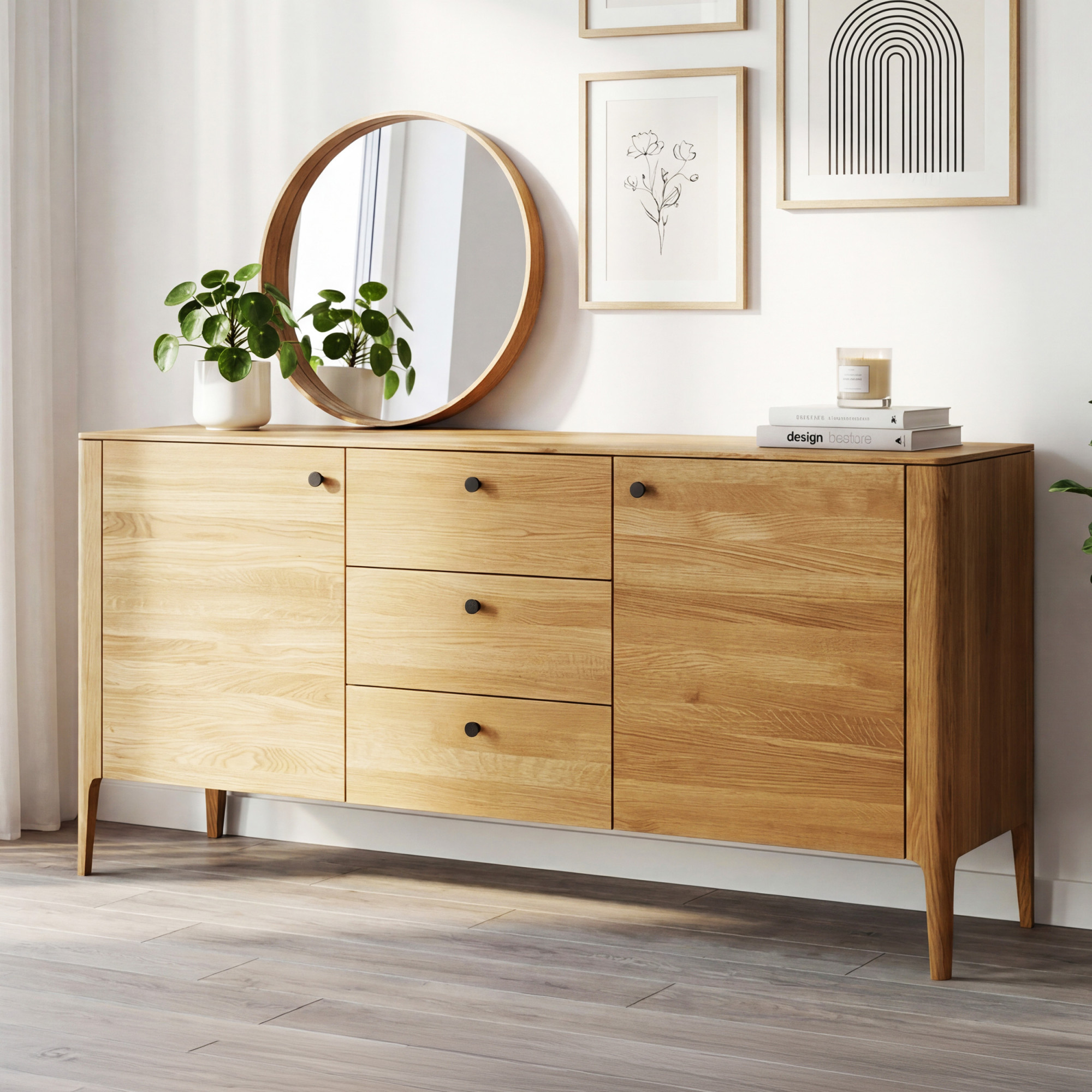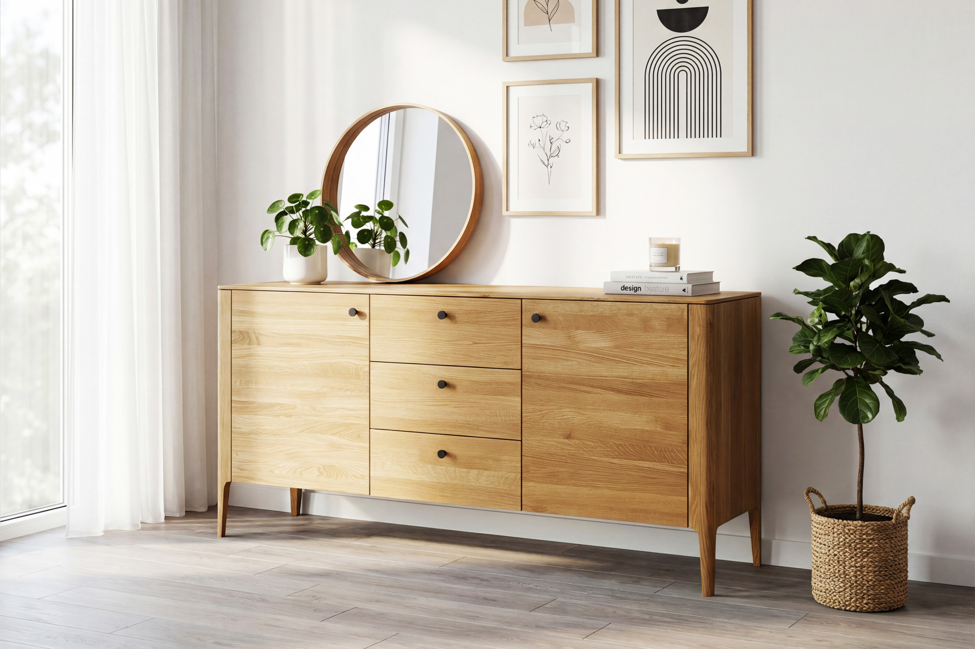 TV komoda je veľmi praktická vďaka svojmu usporiadaniu. Disponuje dvomi dvierkami a tromi priestrannými zásuvkami, ktoré poskytujú dostatok úložného priestoru pre vaše elektronické zariadenia, knihy, dekorácie a ďalšie nevyhnutnosti. Všetky zásuvky a dvierka sú vybavené tichým zatváraním soft-close, čo zaisťuje hladký a tichý chod, a tým predlžuje životnosť nábytku. Povrch komody je ošetrený kvalitným talianskym olejom Borma Wachs v farbe dub natural, čo zvýrazňuje prirodzenú štruktúru dreva a poskytuje ochranu proti vonkajším vplyvom.