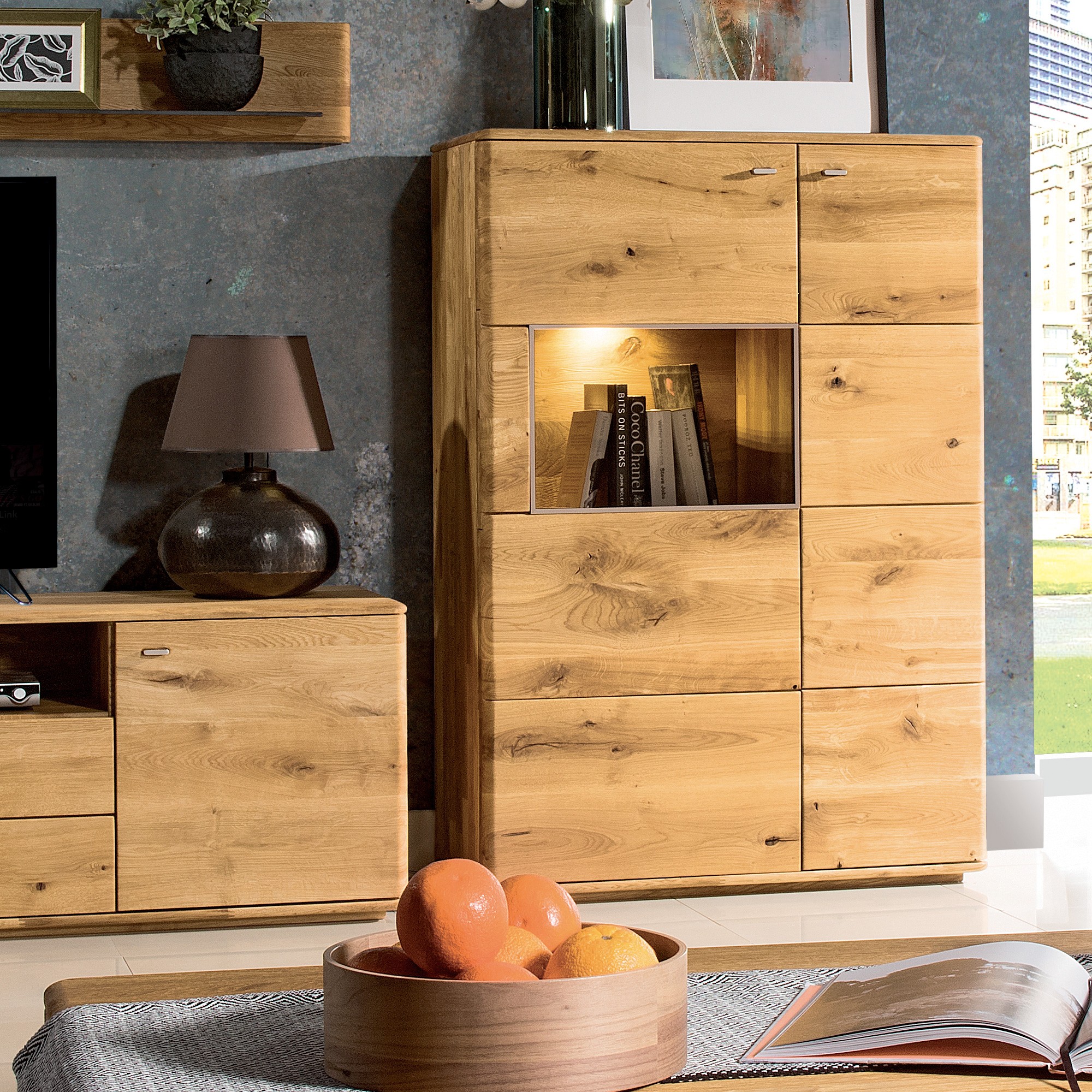 Vysoká komoda s jednou presklenou časťou, TYP 45 Texas farba dub pálený