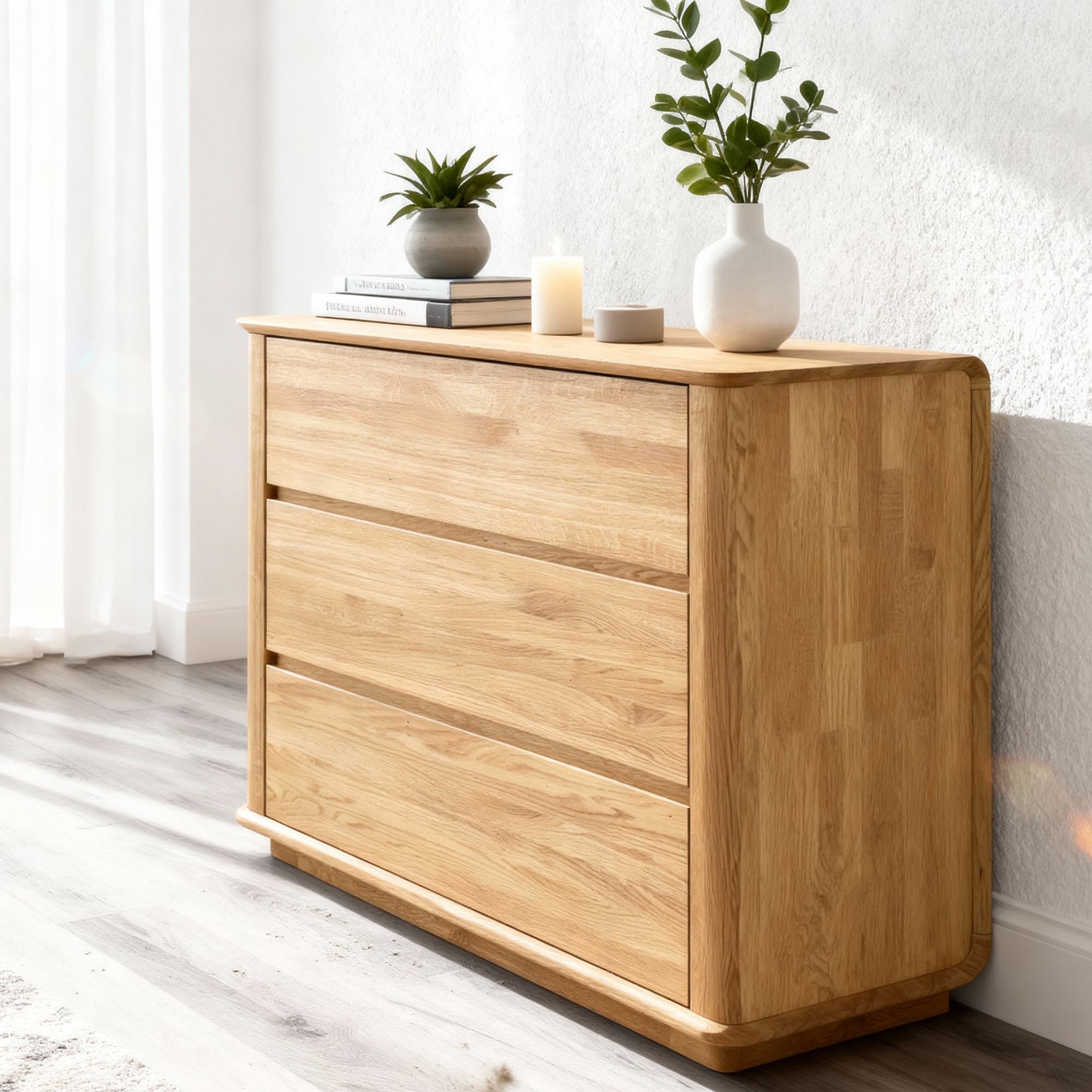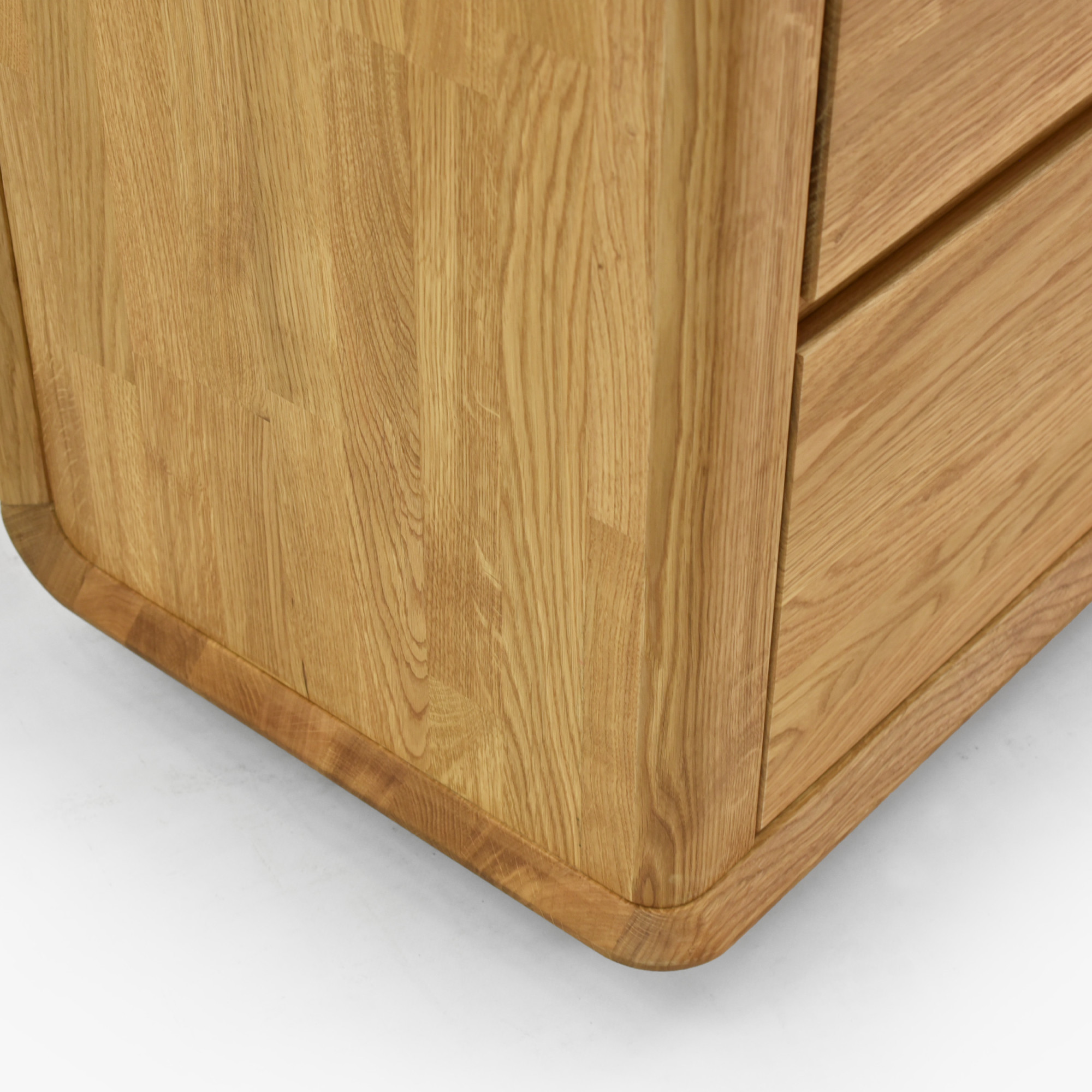 Prémiová dubová komoda Monako je perfektnou voľbou pre všetkých, ktorí hľadajú kvalitný, štýlový a zároveň cenovo dostupný nábytok z prírodného materiálu priamo od výrobcu. Táto dubová komoda je určená najmä do spálne a ponúka tri priestranné zásuvky s funkciou soft close, ktoré umožňujú tiché a pohodlné zatváranie. Každý detail je starostlivo spracovaný – od zaoblených rohov pre väčšiu bezpečnosť a luxusný vzhľad, až po stabilnú konštrukciu z masívneho dubového dreva.