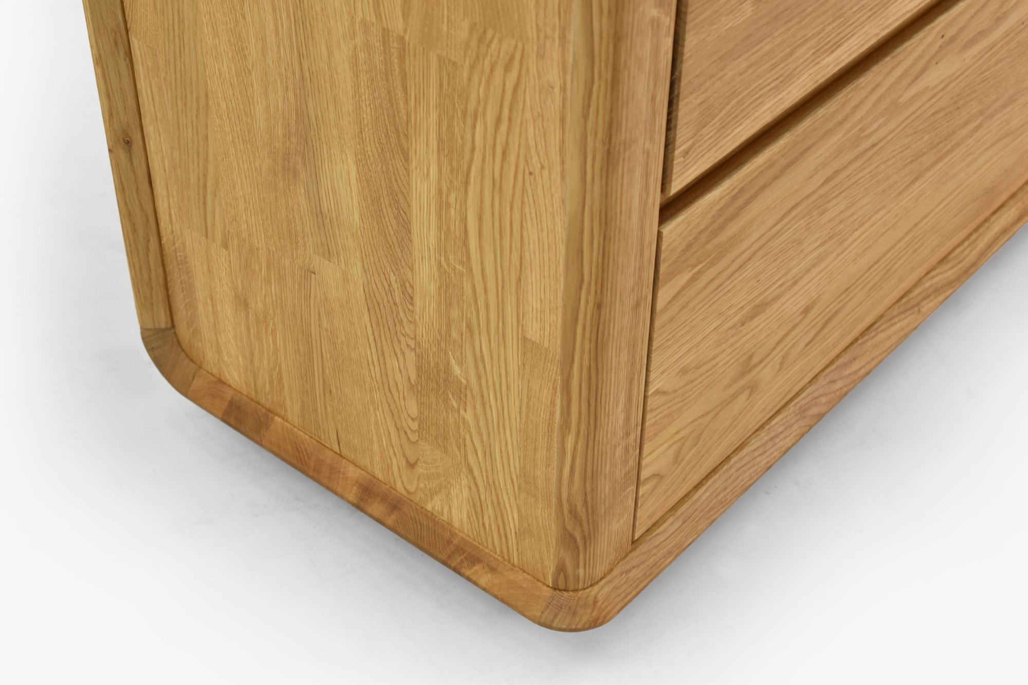 Komoda je súčasťou kolekcie Monako, ktorá je vyrobená kompletné z dubového dreva s FSC certifikáciou – predná časť, vrchná doska, boky, korpus aj všetky konštrukčné materiály sú z dubu. Povrchová úprava prírodným olejom v odtieni dub natural zvýrazňuje prirodzenú krásu dreva a chráni ho pred každodenným opotrebovaním. Komoda je už zmontovaná a pripravená na okamžité použitie. Vďaka svojim rozmerom (šírka 100 cm, výška 90 cm) sa hodí do každej spálne a ľahko ju skombinujete s ďalšími dubovými produktmi pre harmonický a elegantný interiér.
