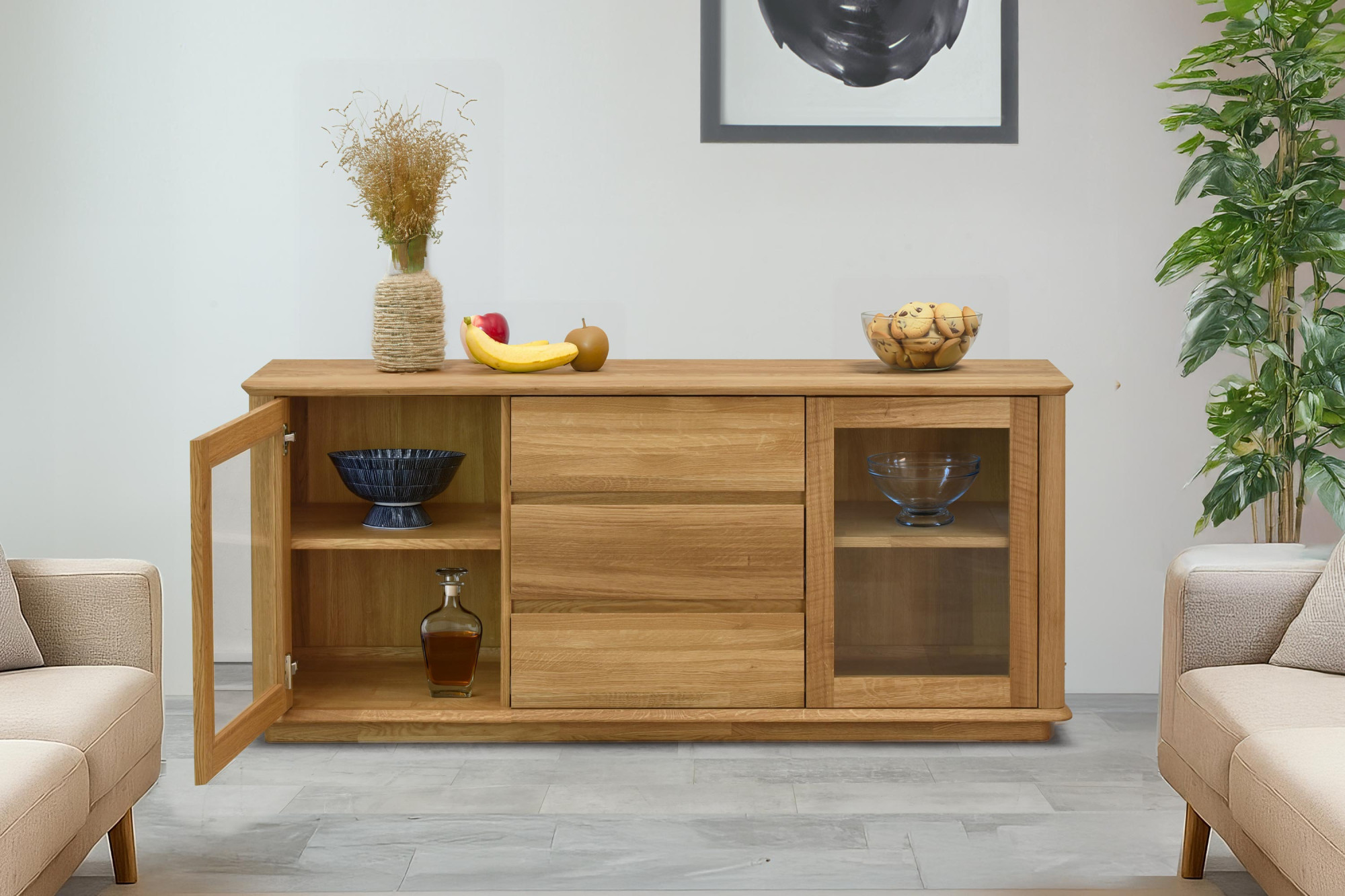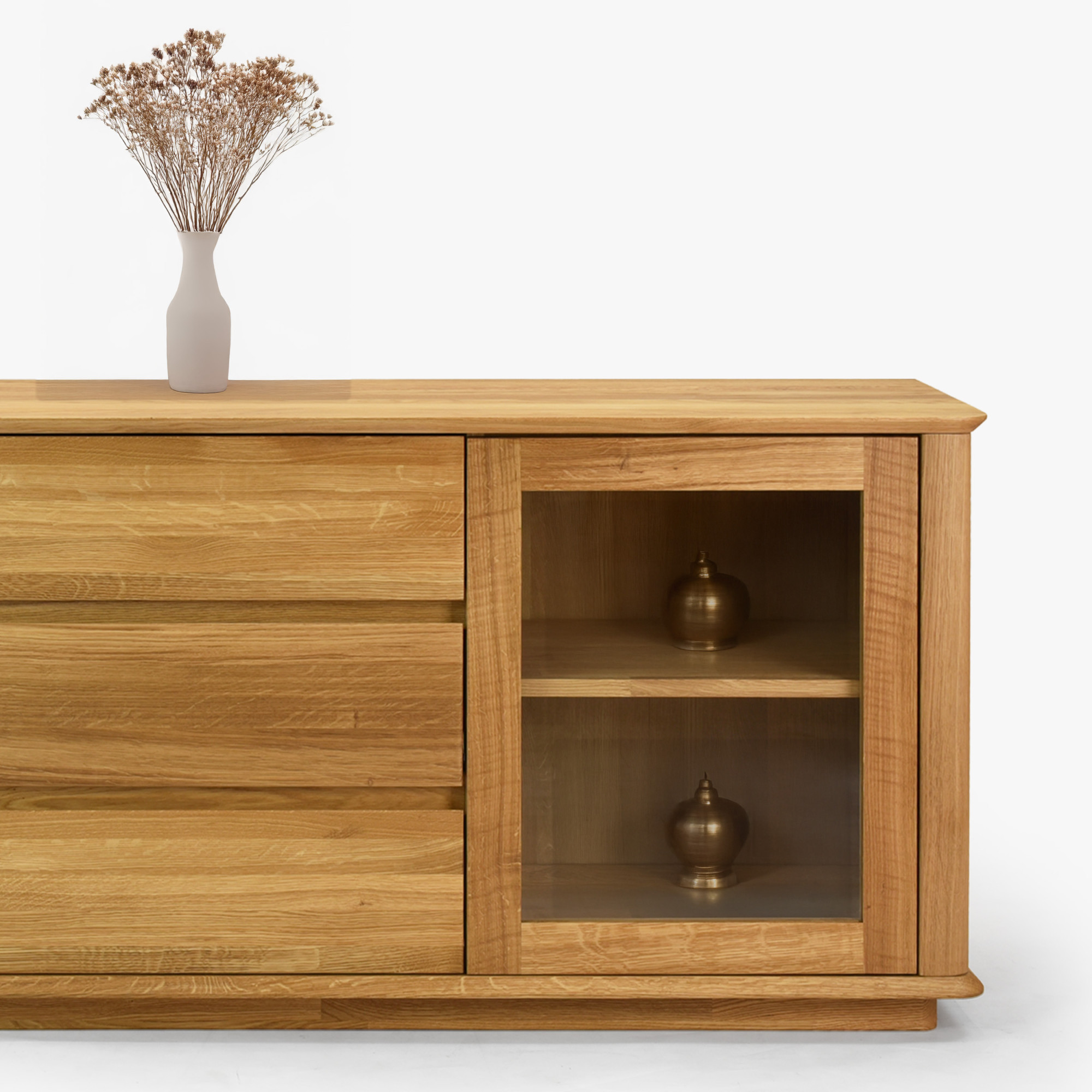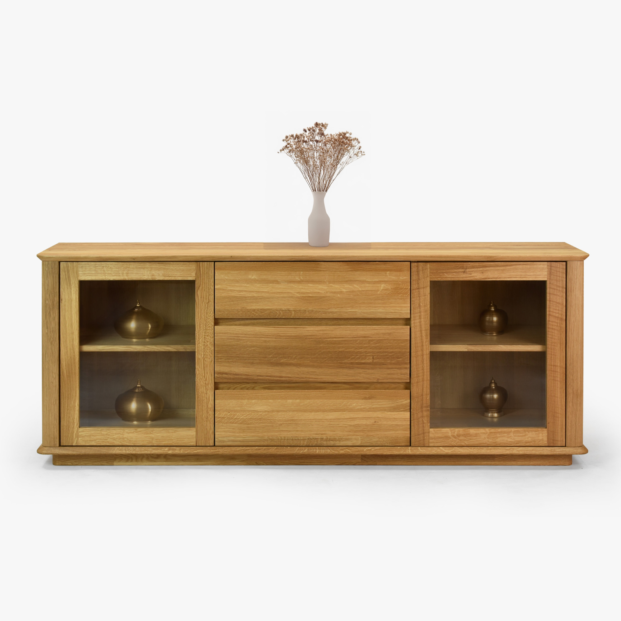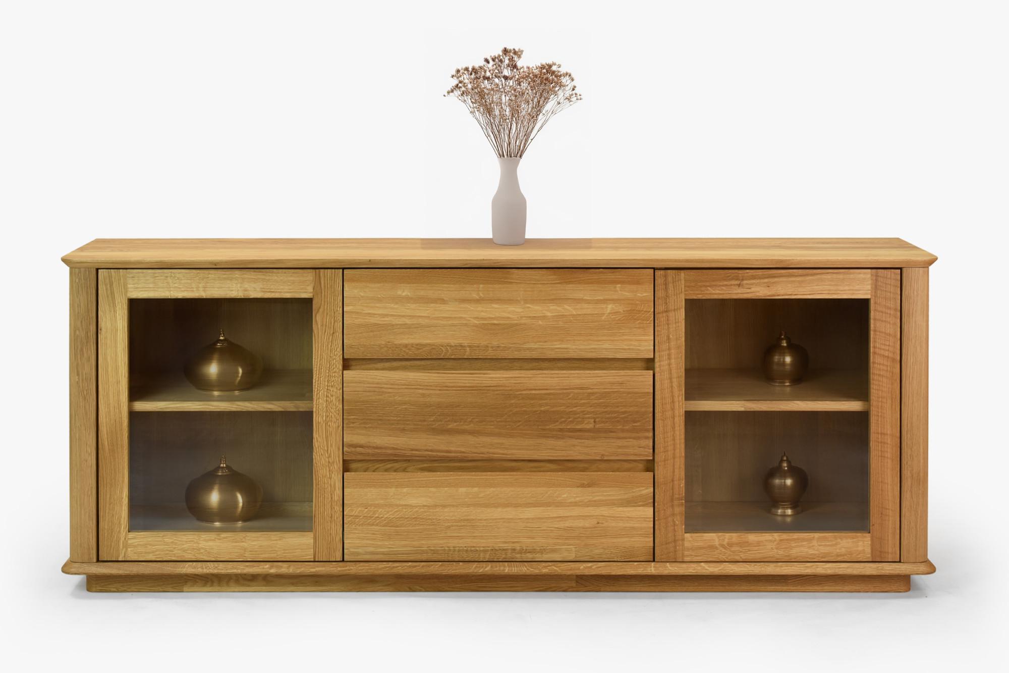 Prémiová dubová komoda Monako je dokonalou voľbou pre všetkých, ktorí hľadajú kvalitný, dizajnový a pritom cenovo dostupný nábytok z prírodného materiálu. Táto dubová komoda do spálne alebo obývačky ponúka po stranách presklené dvierka s vnútornou drevenou policou, ideálne na vystavenie dekorácií či uloženie kníh a ďalších cenností. Stredná časť komody tvorí tri priestranné zásuvky, ktoré poskytujú dostatok úložného priestoru na bielizeň, dokumenty alebo iné domáce potreby. Každý detail je precízne spracovaný – efektné zaoblenie rohov podčiarkuje luxusný vzhľad a zvyšuje bezpečnosť v domácnosti.