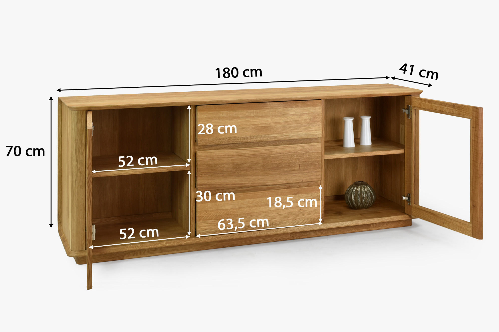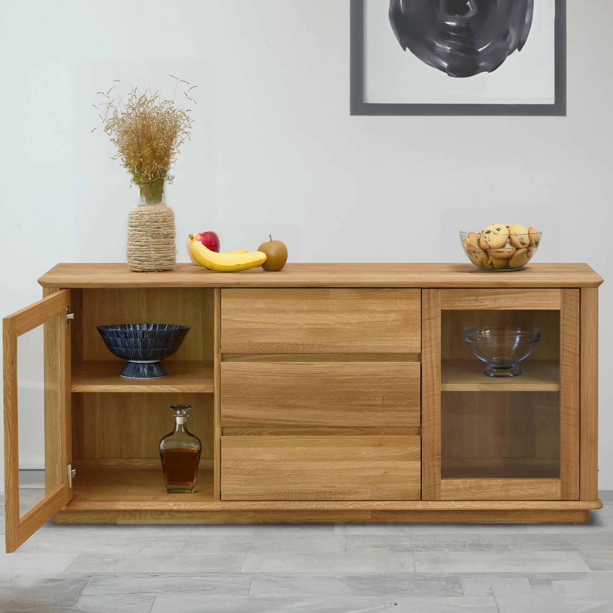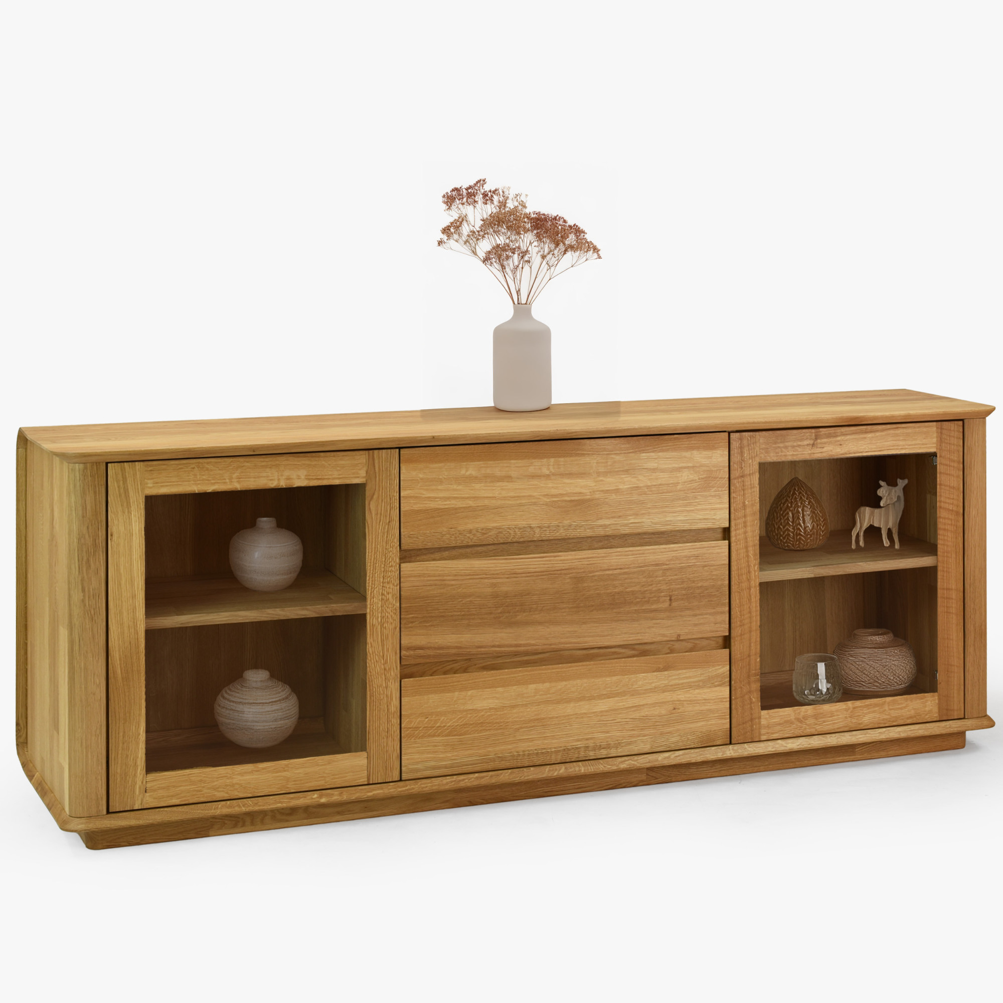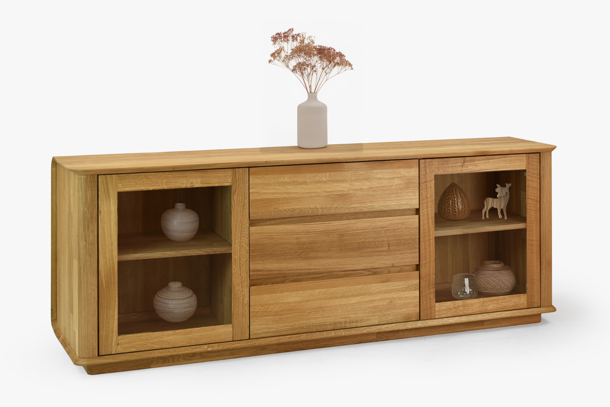 Prémiová dubová komoda Monako je dokonalou voľbou pre všetkých, ktorí hľadajú kvalitný, dizajnový a pritom cenovo dostupný nábytok z prírodného materiálu. Táto dubová komoda do spálne alebo obývačky ponúka po stranách presklené dvierka s vnútornou drevenou policou, ideálne na vystavenie dekorácií či uloženie kníh a ďalších cenností. Stredná časť komody tvorí tri priestranné zásuvky, ktoré poskytujú dostatok úložného priestoru na bielizeň, dokumenty alebo iné domáce potreby. Každý detail je precízne spracovaný – efektné zaoblenie rohov podčiarkuje luxusný vzhľad a zvyšuje bezpečnosť v domácnosti.
