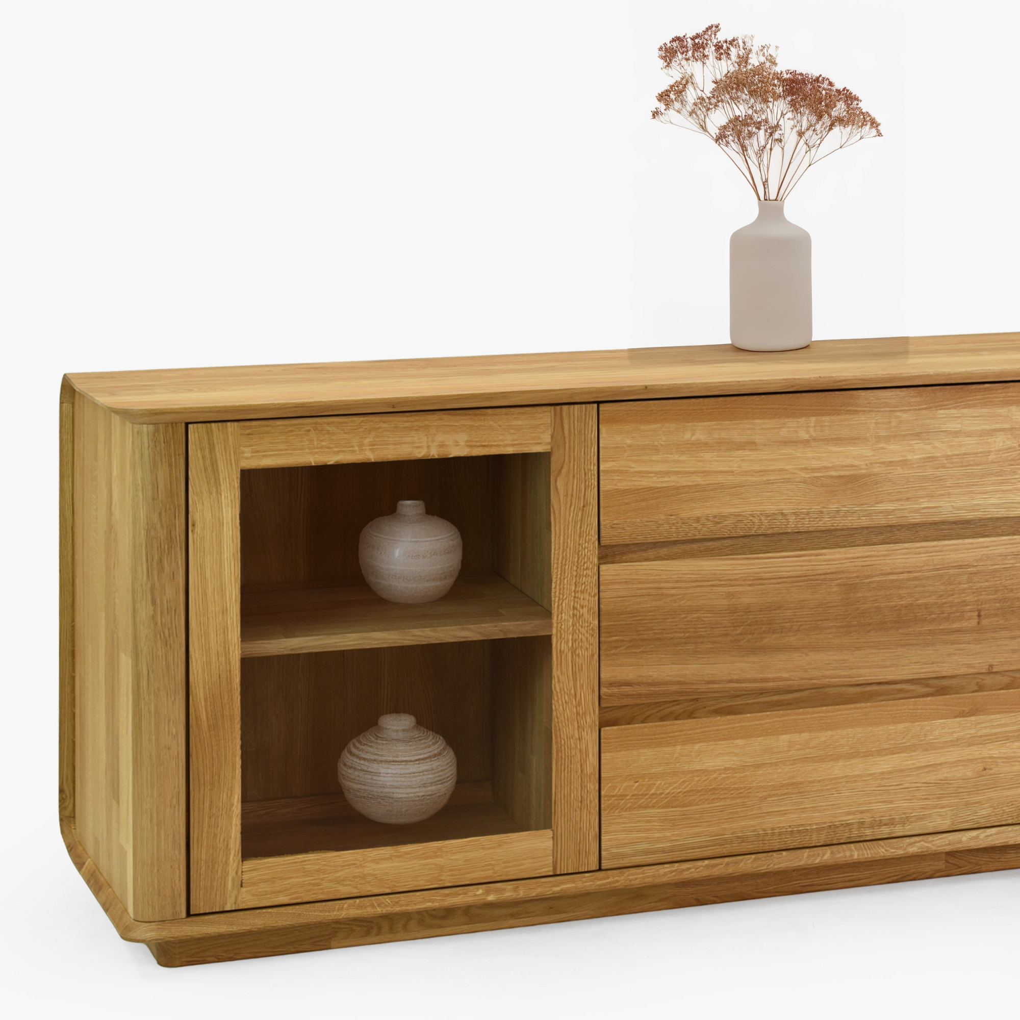 Objavte silu prírodného materiálu a zaobstarajte si prémiovú dubovú TV komodu Monako, ktorá sa stane dominantou vášho interiéru. Vďaka FSC certifikácii a celodubovej konštrukcii získate nábytok, ktorý vyniká trvanlivosťou, krásou aj ekologickou zodpovednosťou. Tri priestranné zásuvky a presklené úložné priestory prinesú nielen štýl, ale aj praktickosť do vašej domácnosti.