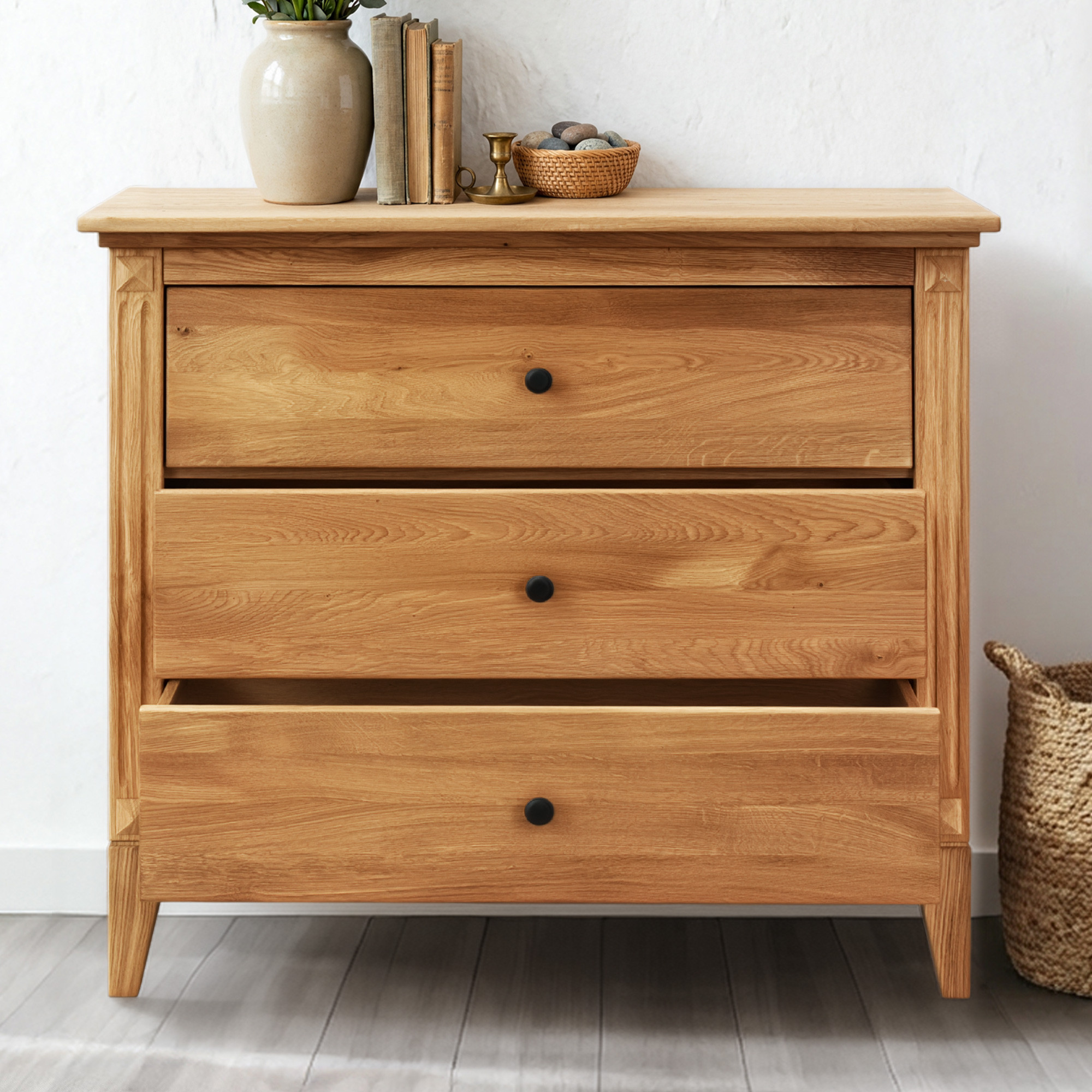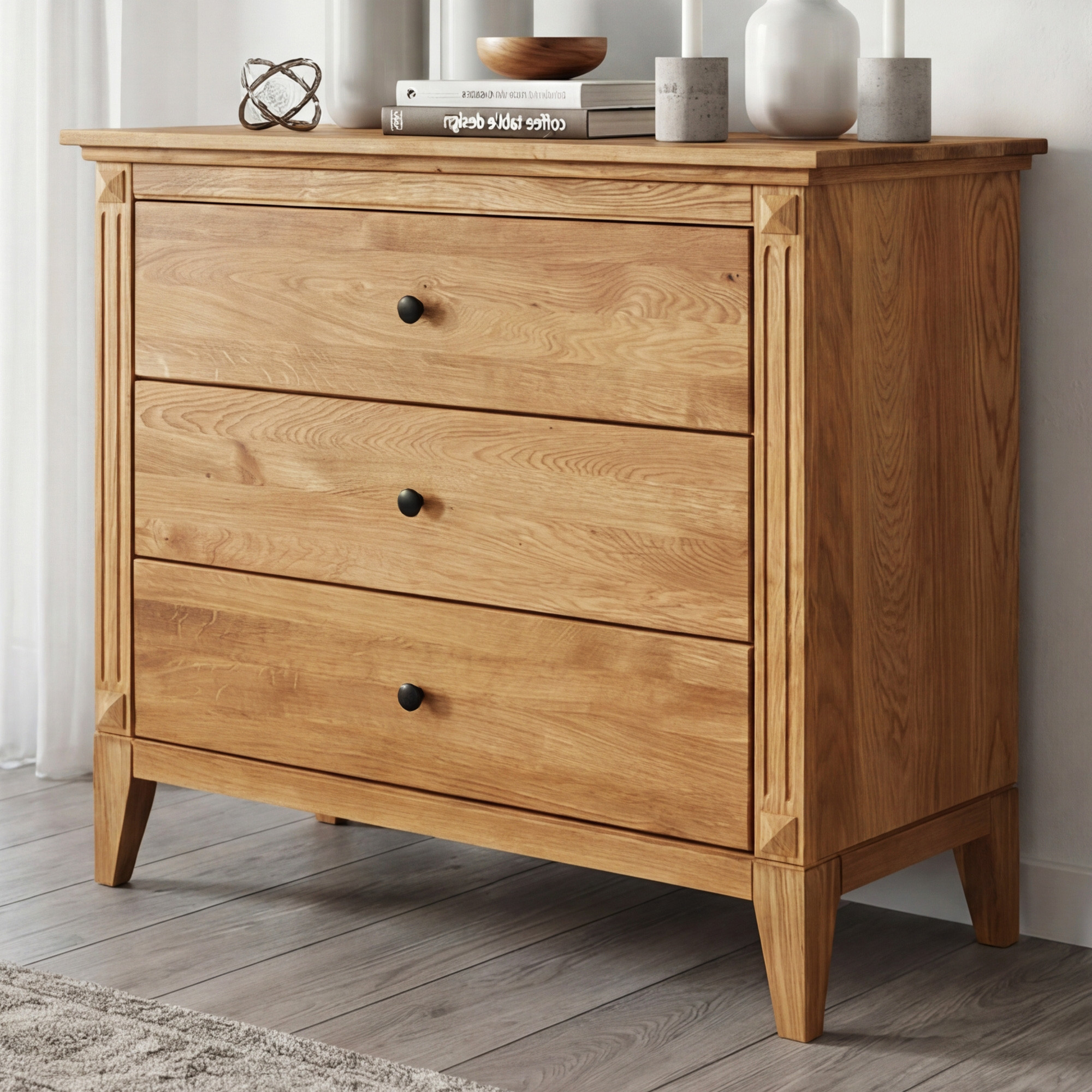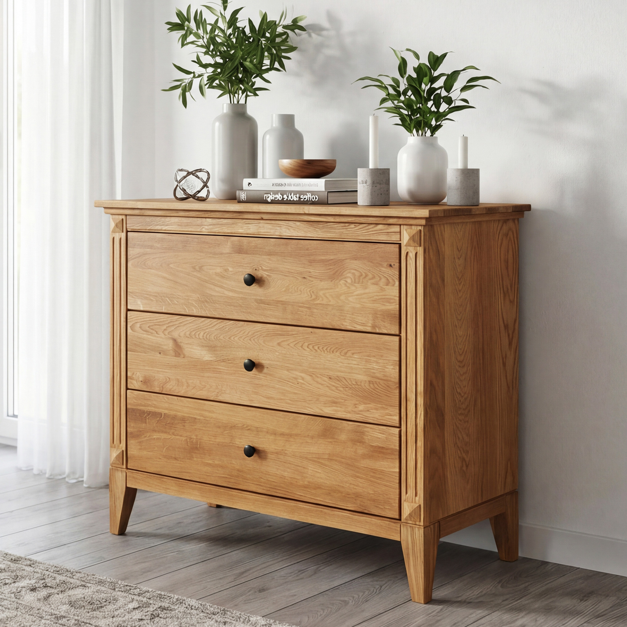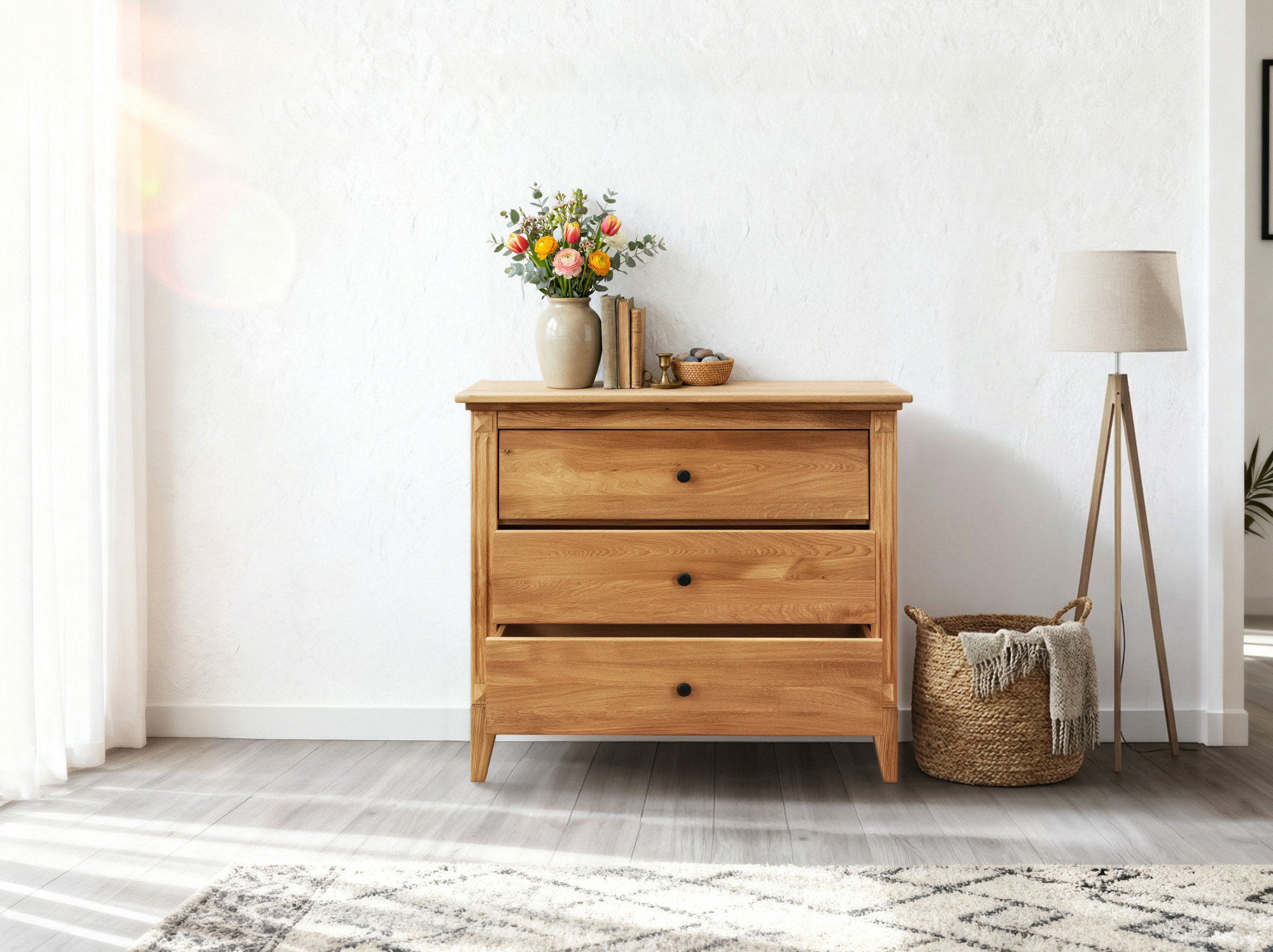 Komoda z masívneho dubu nie je len úložný nábytok – je to investícia do kvality, ktorá vydrží generácie. Kolekcia Gaja prináša dokonalú harmóniu praktickosti a nadčasovej estetiky severského dizajnu. Tri priestranné zásuvky s tichým zatváraním ocení každý, kto má rád poriadok a pohodlie. Naša spoločnosť pôsobí na trhu od roku 1993 a každý rok obslúžime viac než 50 000 spokojných zákazníkov po celej Európe. Máme vlastnú prepravu – nábytok nakladáme priamo na našom sklade a vykládame u vás doma. Doručujeme do SK, CZ, HU, AT aj PL, za príplatok zabezpečíme výnos do poschodia. Objednajte si svoju novú komodu a užívajte si kvalitu, ktorej dôverujú tisíce spokojných zákazníkov!