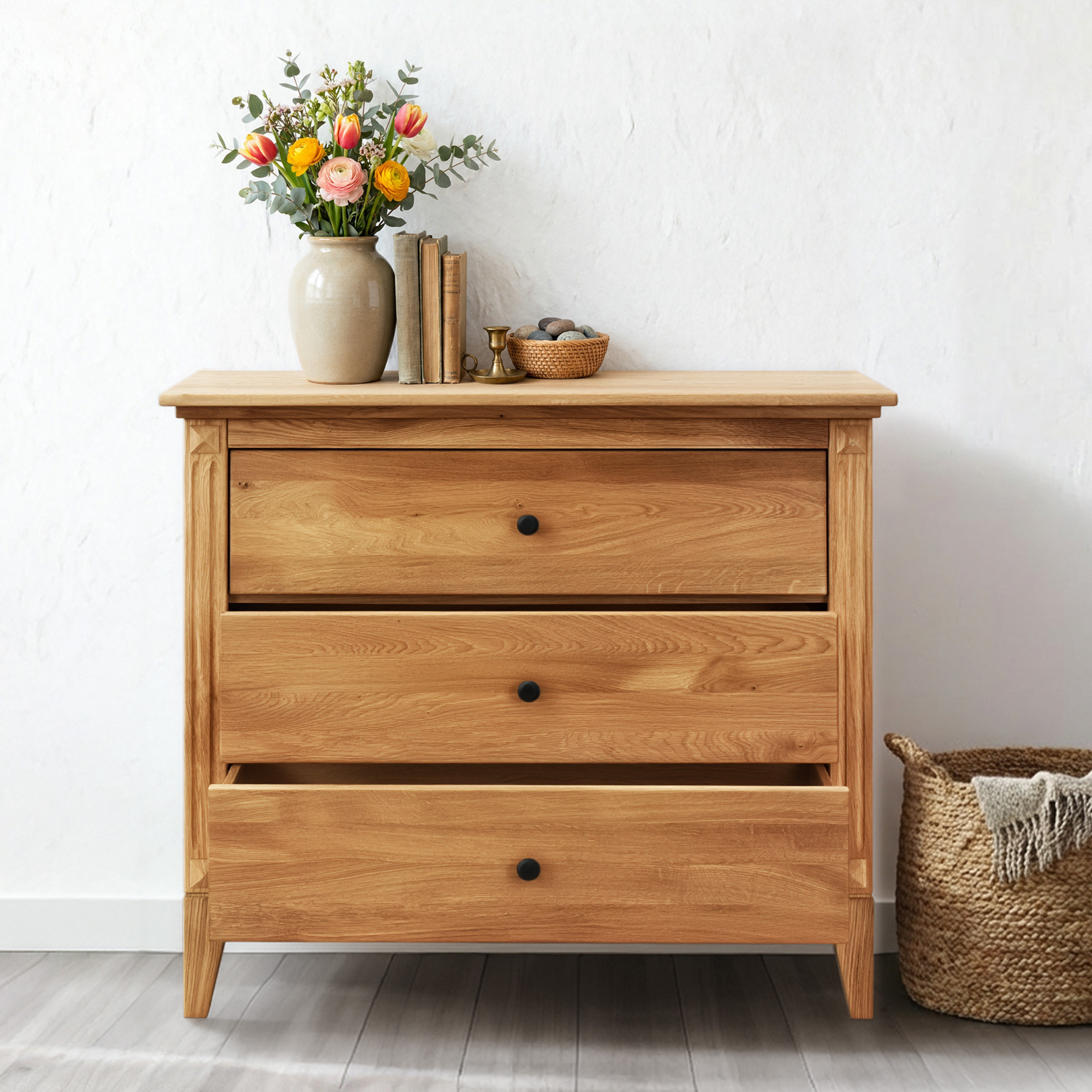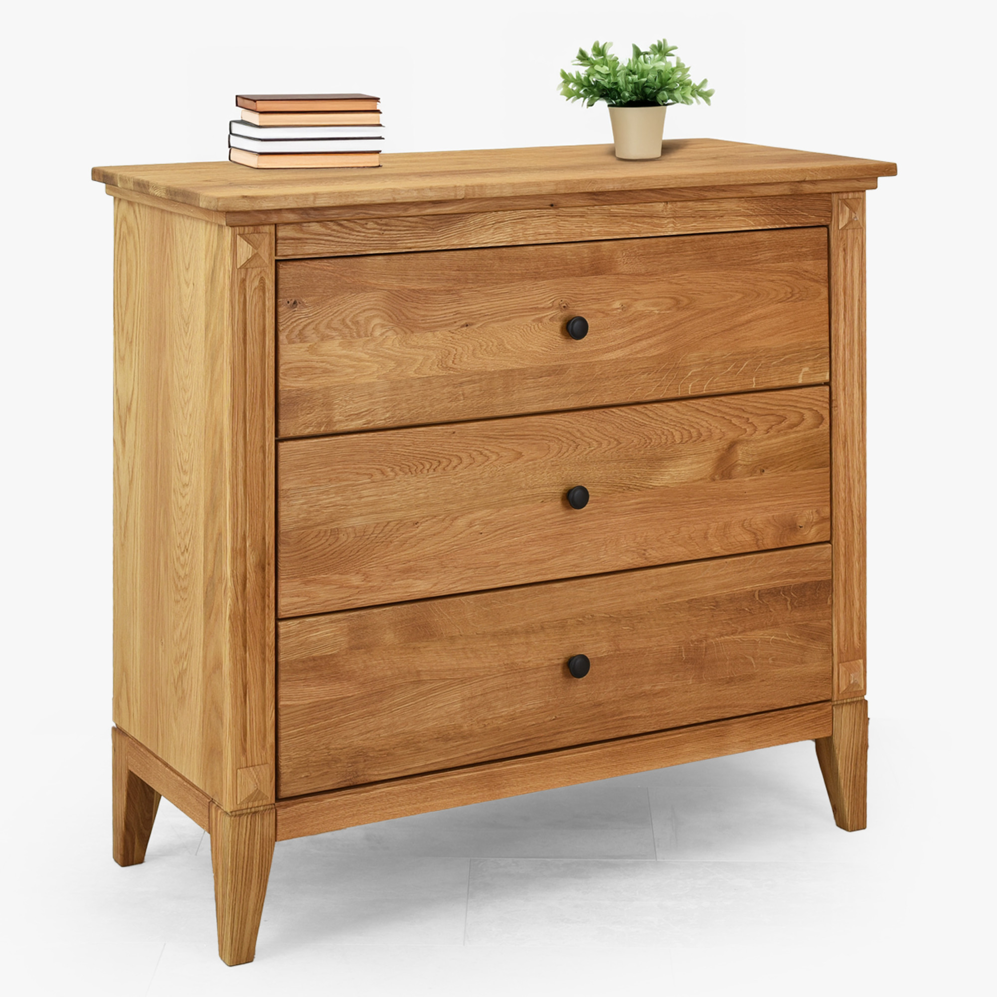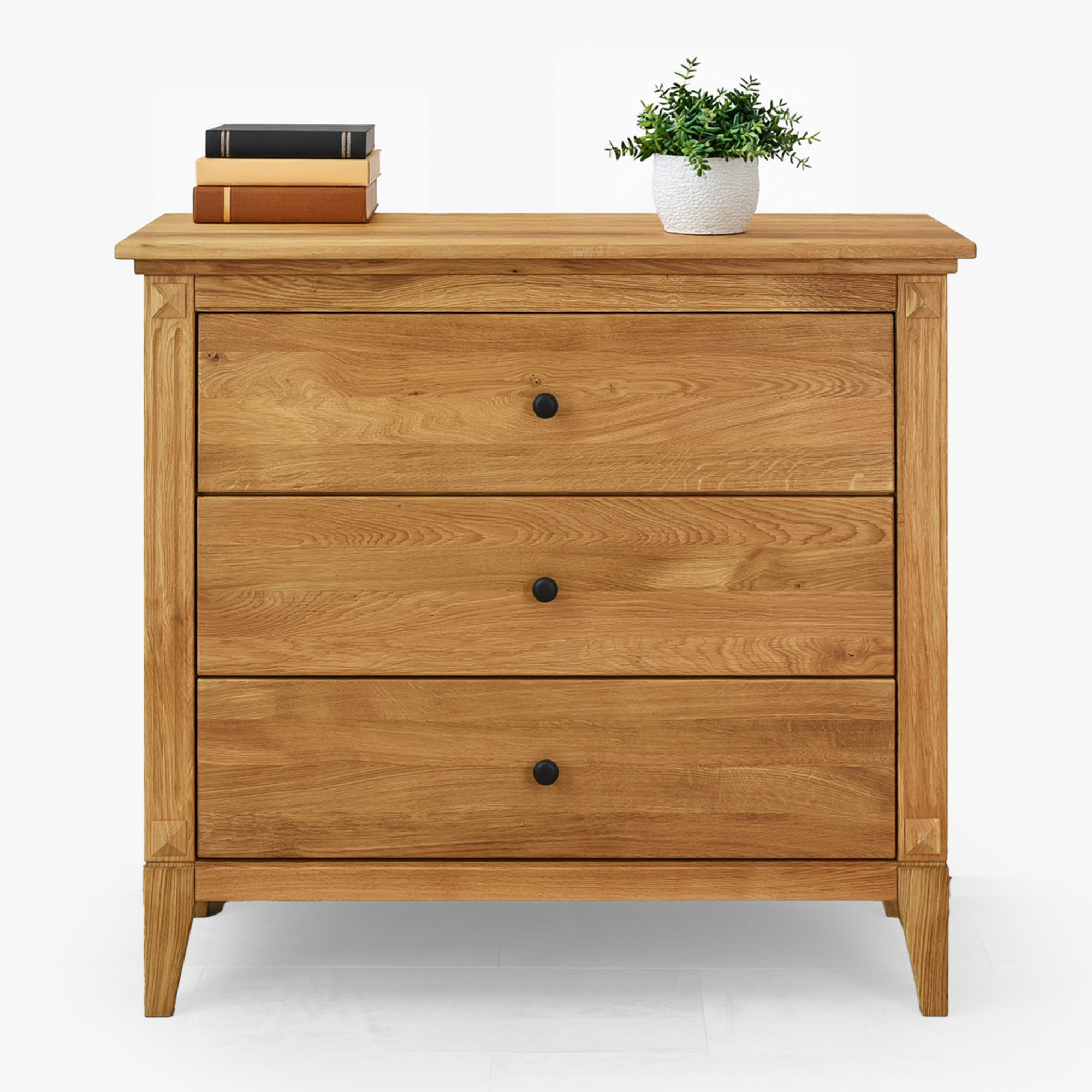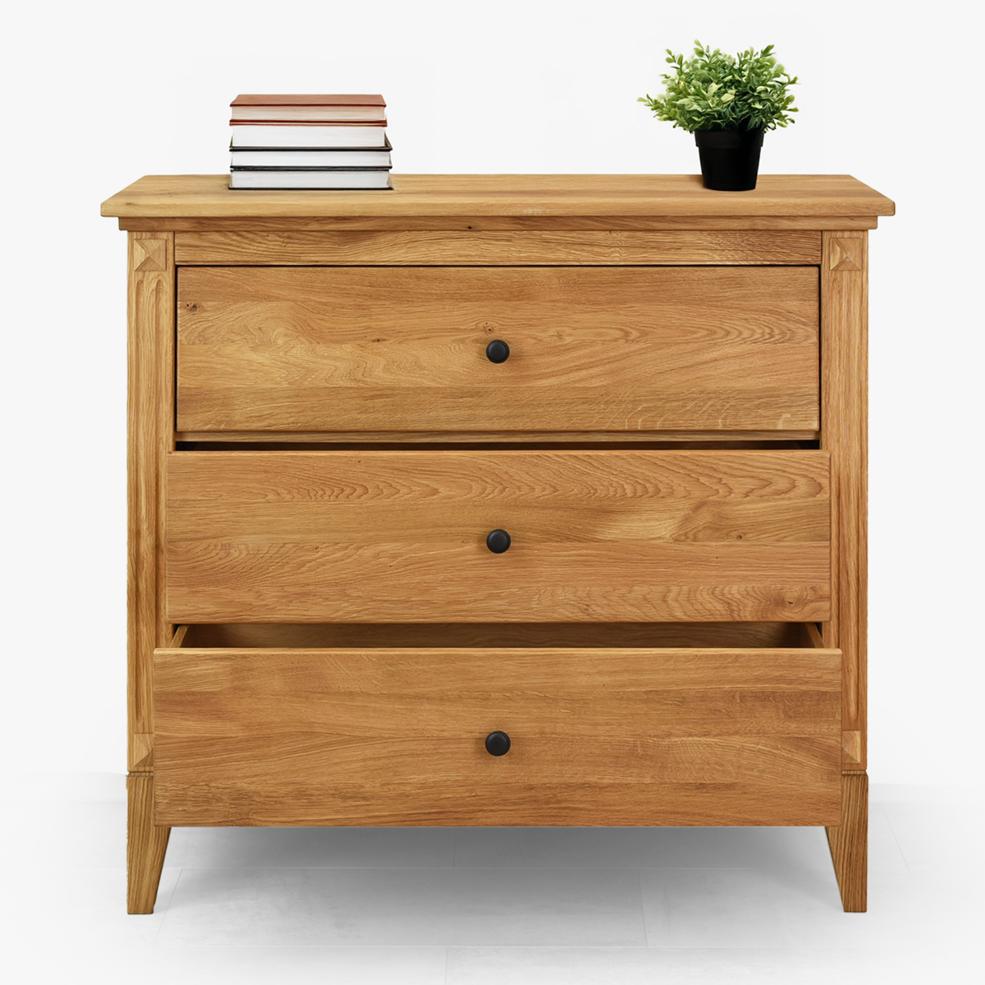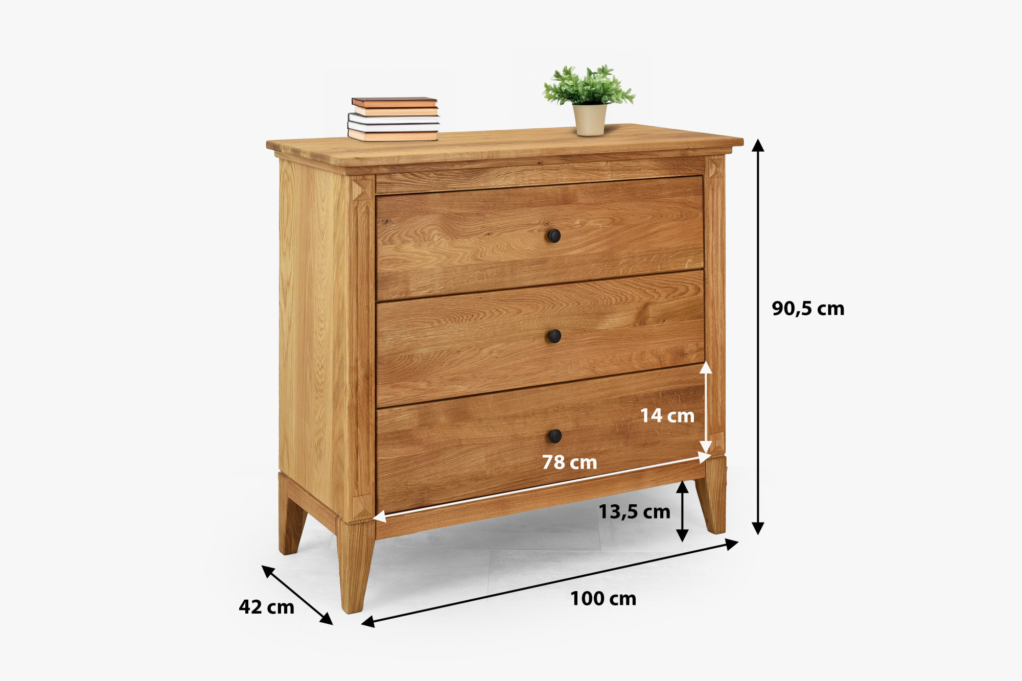 Hľadáte elegantnú dubovú komodu so zásuvkami, ktorá ponúkne dostatok úložného priestoru a zároveň ozdobí váš interiér? Komoda z kolekcie Gaja je presne to, čo potrebujete. Tento masívny dubový nábytok v rustikálnom severskom štýle disponuje tromi priestrannými zásuvkami, ktoré pojmú všetko od oblečenia cez posteľnú bielizeň až po osobné veci. S kompaktnými rozmermi 100 × 90,5 × 42 cm sa hodí do obývačky, spálne, predsiene aj pracovne. Drevená komoda stojí na elegantných dubových nožičkách, ktoré nábytku dodávajú vzdušnosť.
