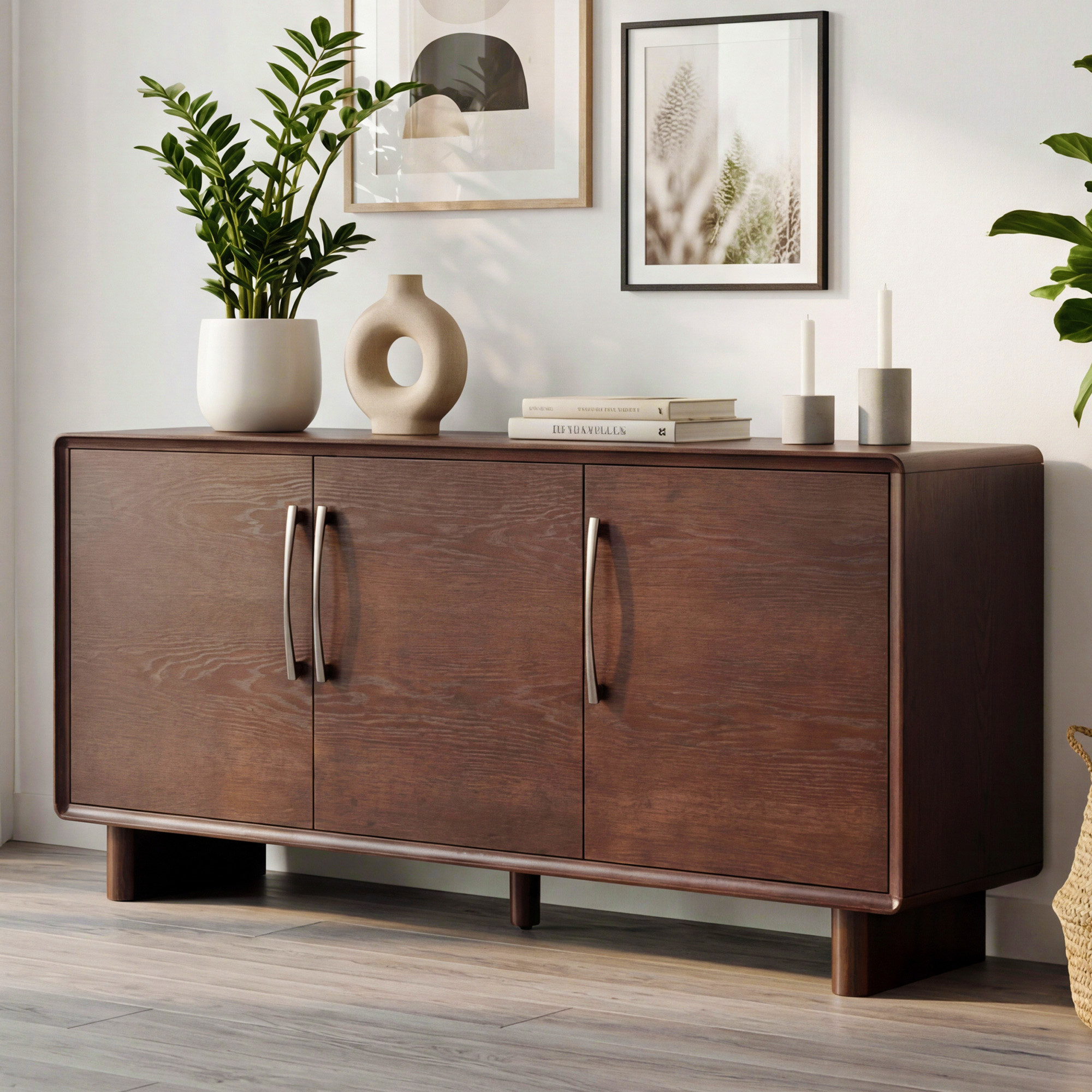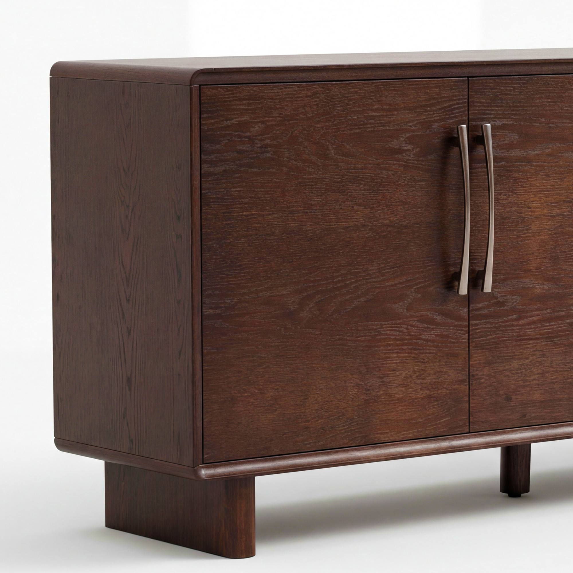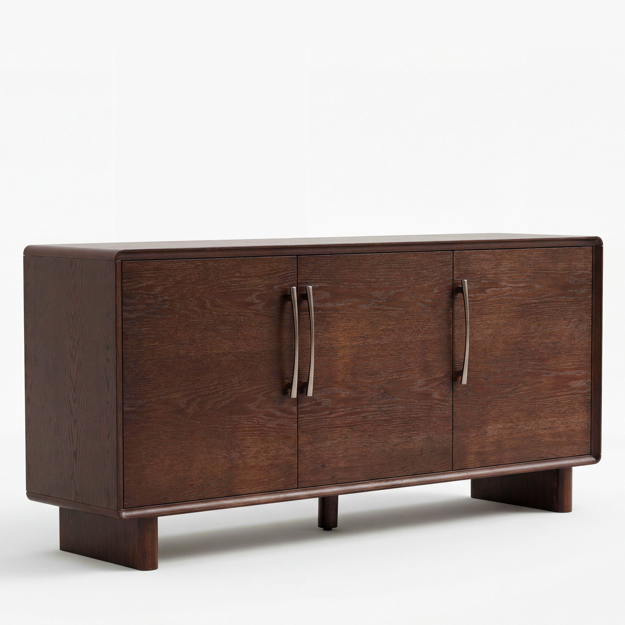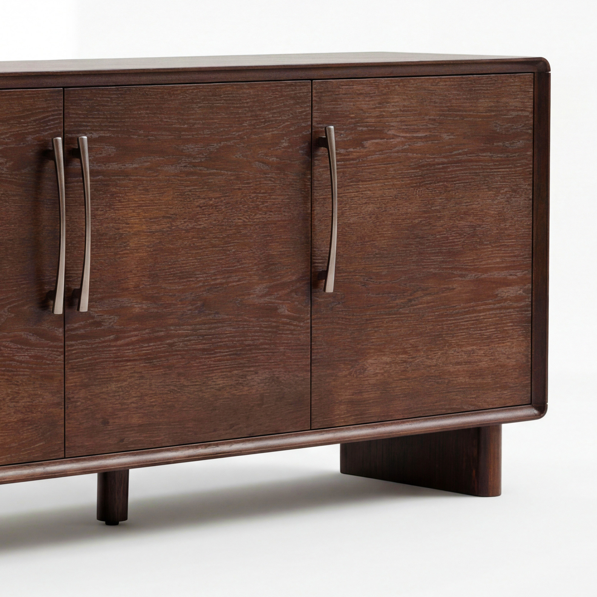 Komoda stojí na elegantných drevených nohách s výškou 15,5 cm, ktoré nábytku požičiavajú vzdušný a ľahký vzhľad. Za každými dvierkami sa ukrývajú praktické police, ktoré poskytujú dostatok miesta na uloženie vašich vecí. Všetky dvierka sú vybavené systémom soft-close pre tiché a plynulé zatváranie. Kovové úchytky v modernom prevedení podčiarkujú exkluzívny dizajn celého kusu. Povrch je ošetrený matným lakom, ktorý účinne chráni drevo a krásne zvýrazňuje jeho prirodzenú štruktúru.