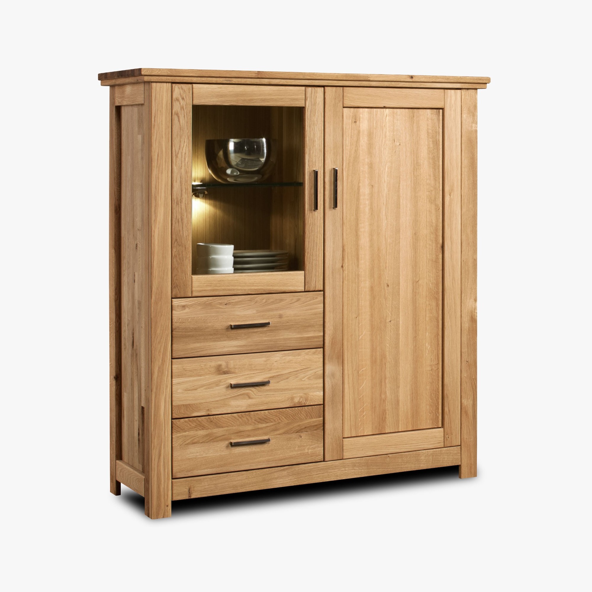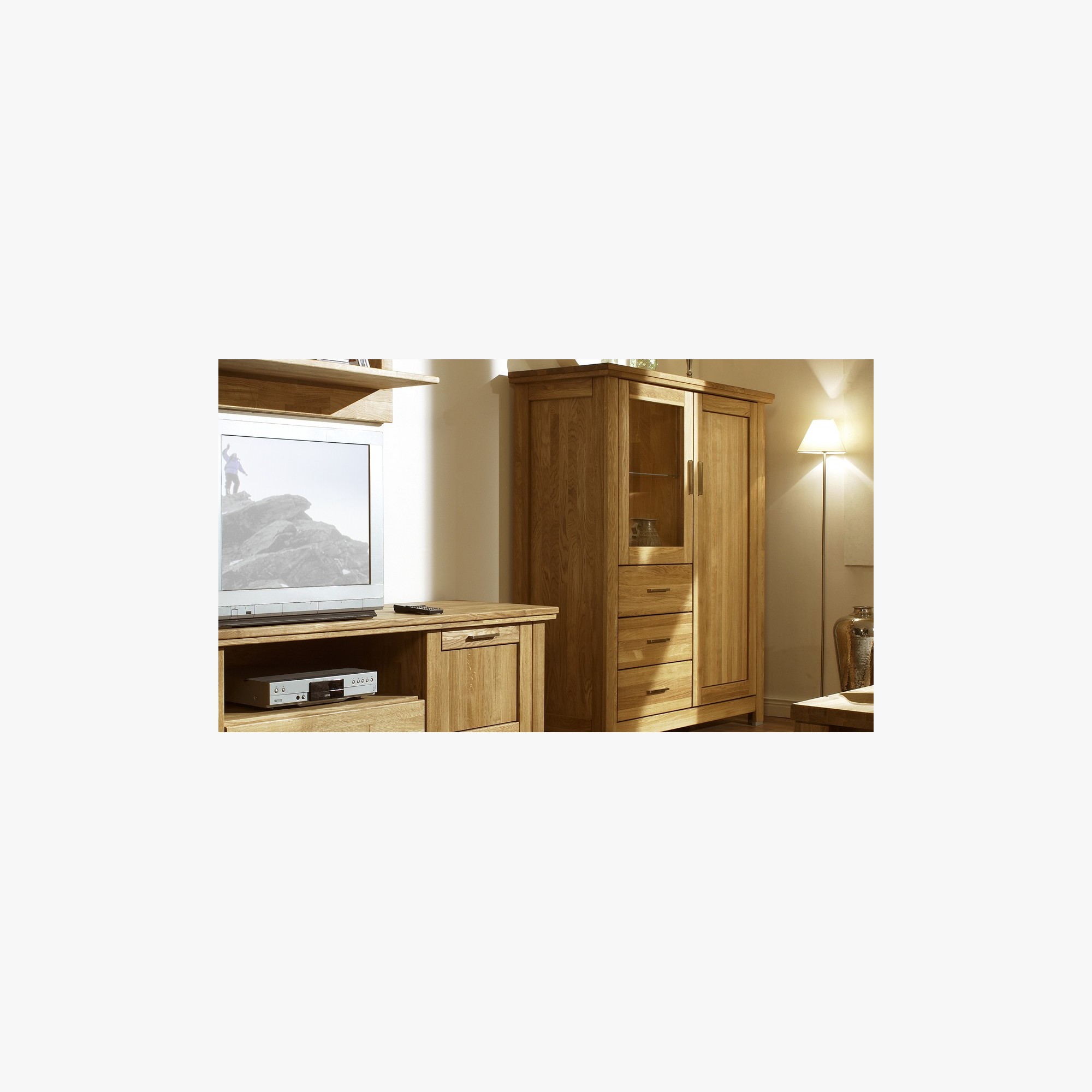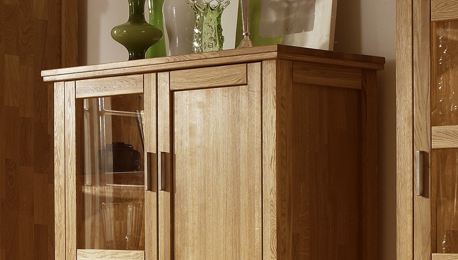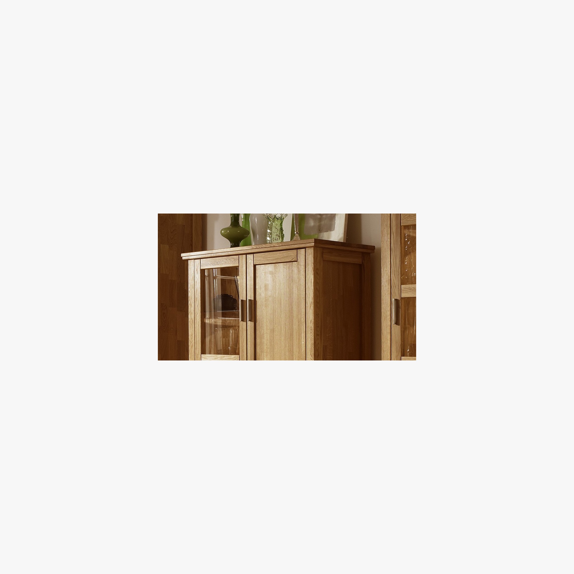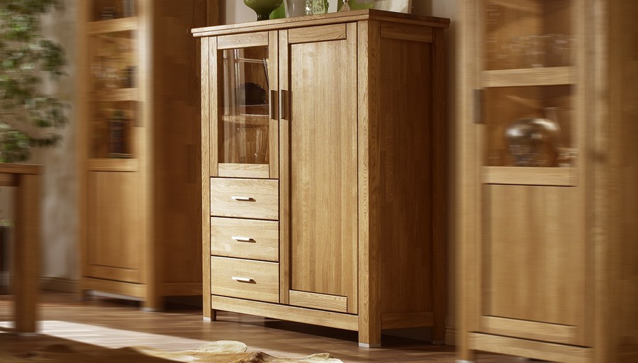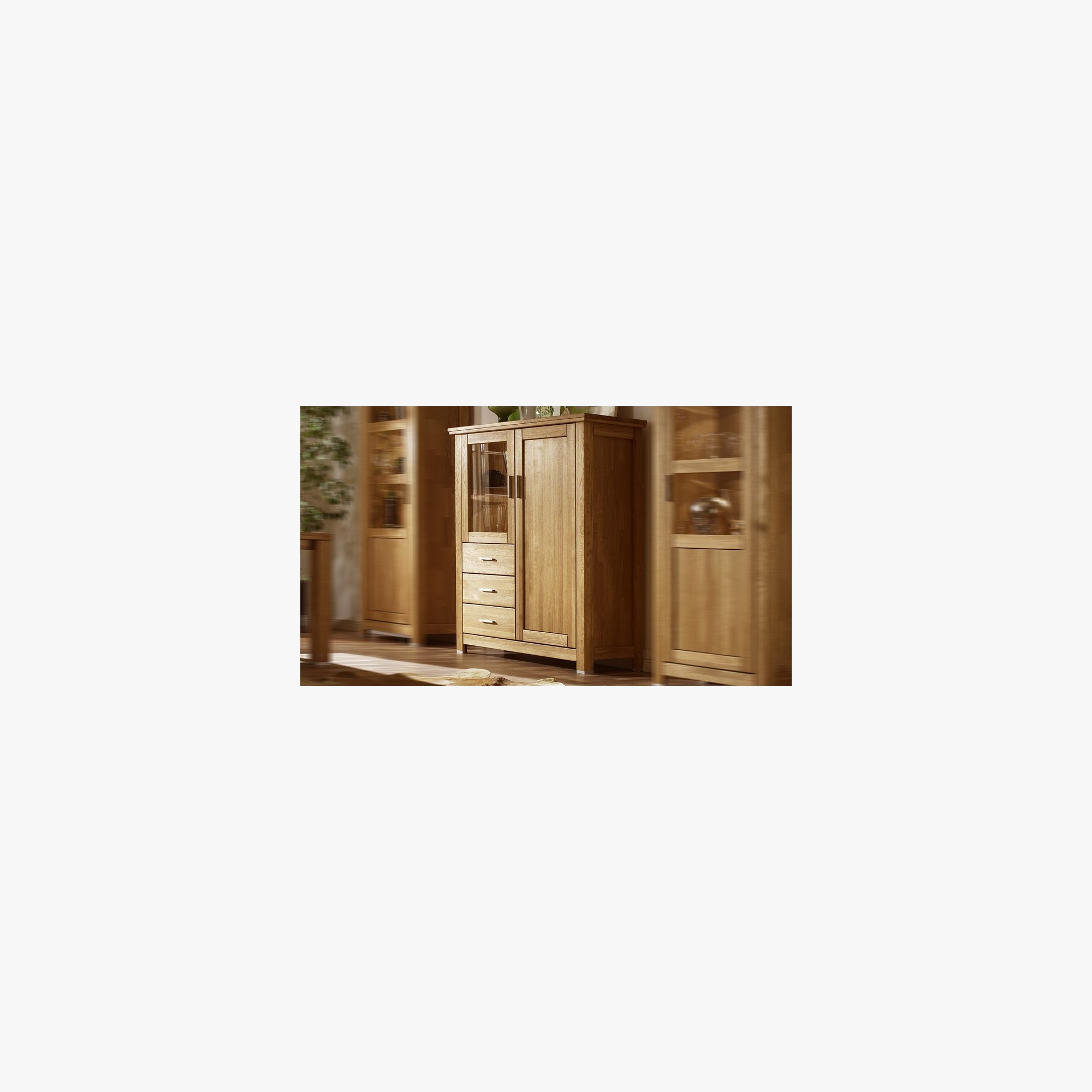 Menej rozmerná dubová komoda s presklenými dvierkami z rady dubového nábytku Alexandra bude vo vašom interiéri pôsobiť ako naozajstný klenot. Jej prakticky členený vnútorný priestor využijete predovšetkým v obývačke alebo jedálni. Vďaka použitiu 100% dubového masívu ako výrobného materiálu dosahuje komoda naozaj výnimočné kvality od pevnosti, cez krásnu štruktúru až po dlhú životnosť. Celomasívna komoda je rozdelená na dve časti. Vpravo je priestranná skrinka s dvoma drevenými policami. Vľavo nájdete priestor s presklenými dvierkami a sklenenou policou, pod ňou sú potom 3 zásuvky. Dvierka skríň a zásuvky sú opatrené dlhými kovovými úchytkami a systémom tichého dovierania soft-close, ktorý je zárukou pohodlného zatvárania a bezproblémového fungovania aj po rokoch používania. Tvar úchytiek pekne korešponduje s rovnými líniami nábytku.