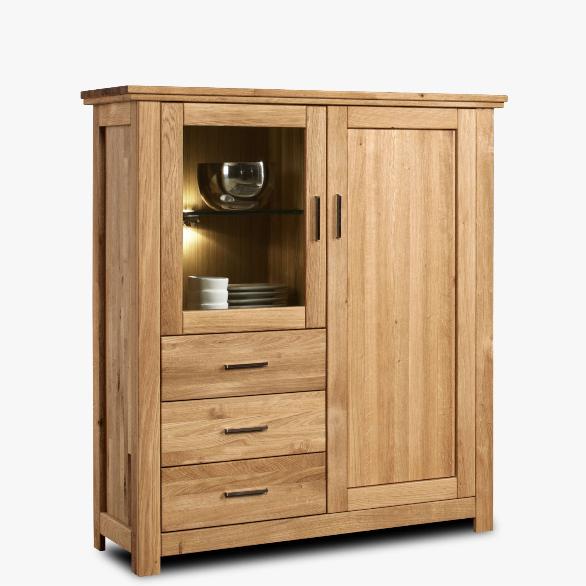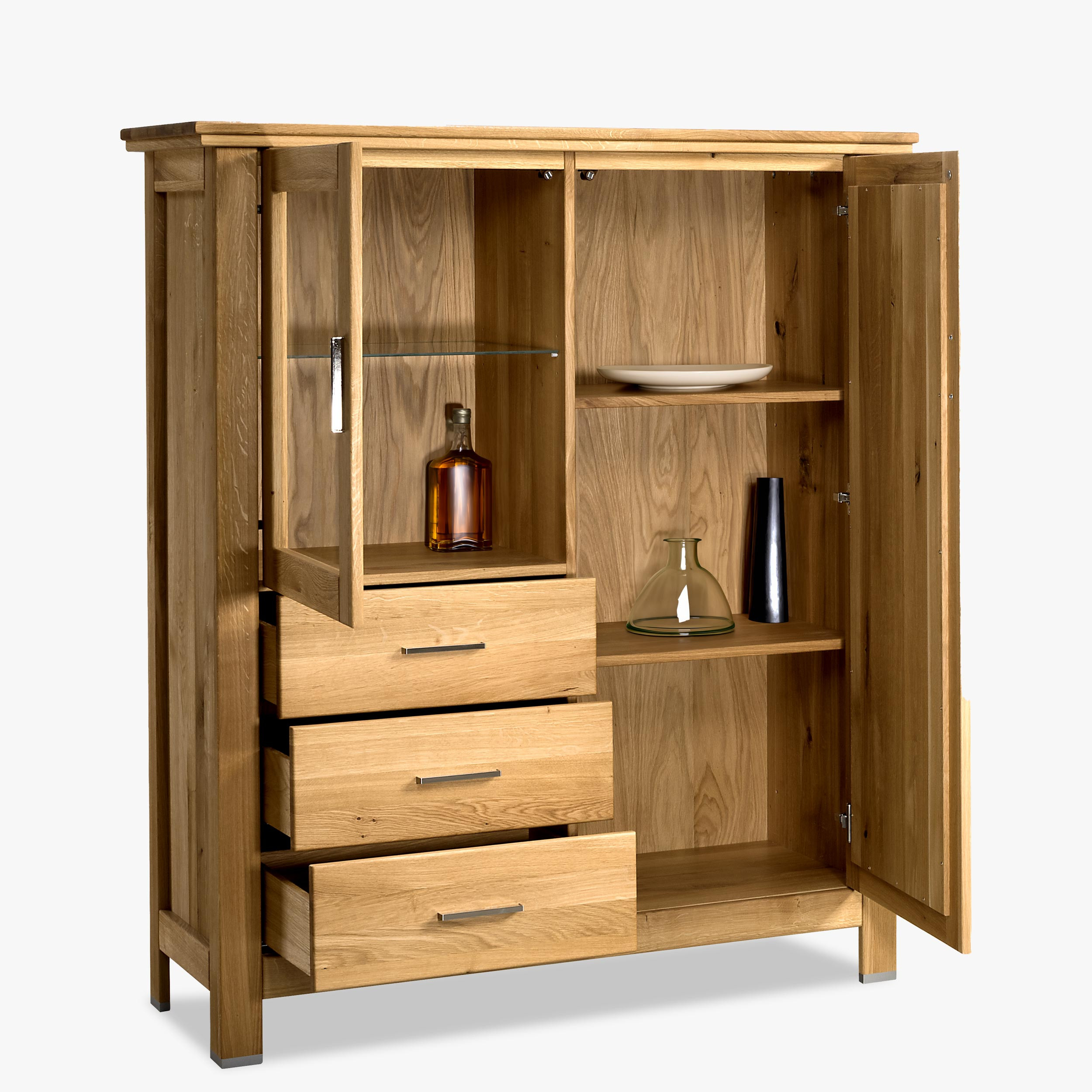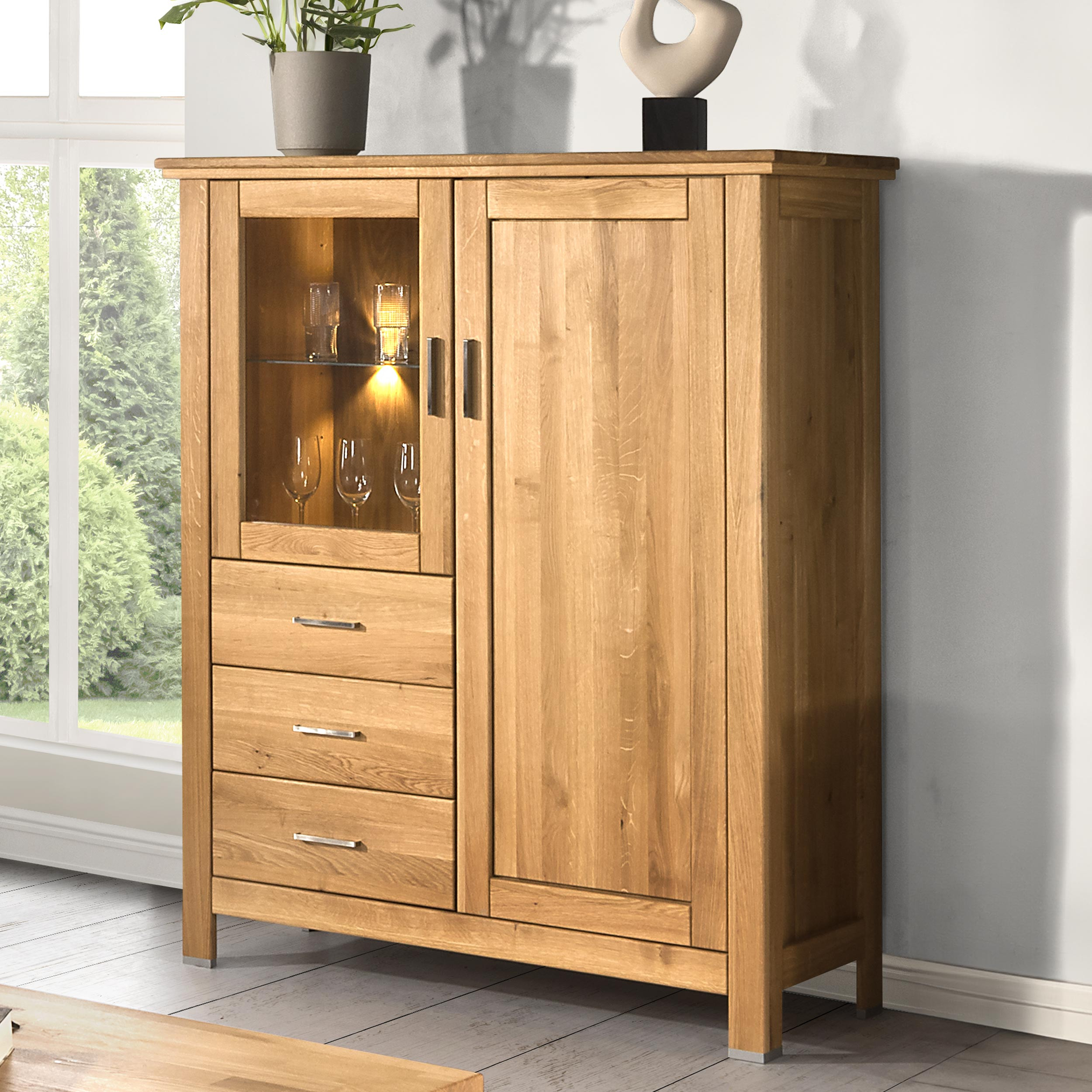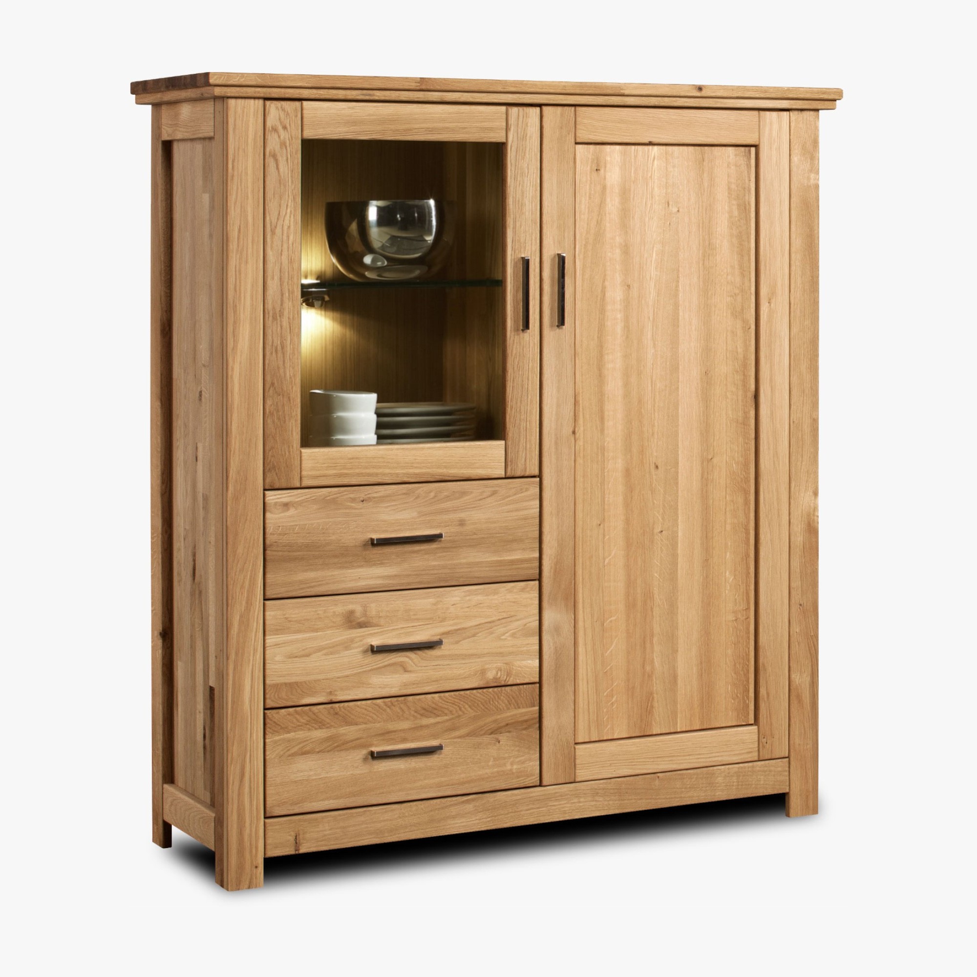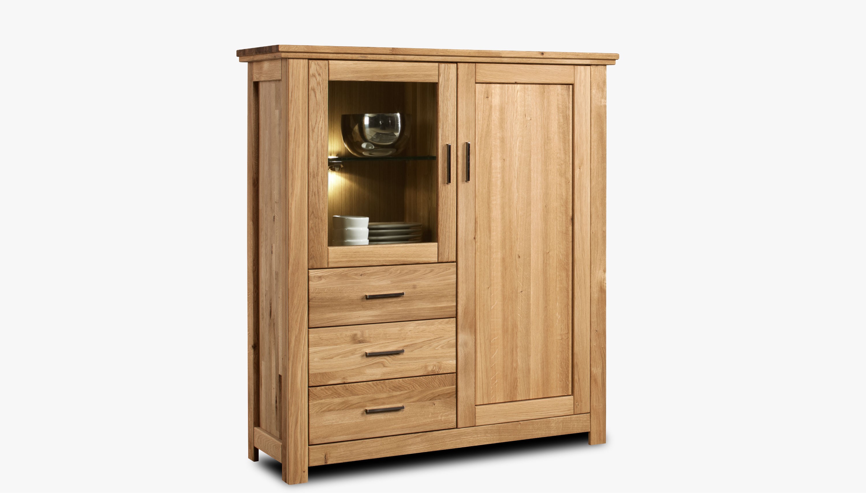 Menej rozmerná dubová komoda s presklenými dvierkami z rady dubového nábytku Alexandra bude vo vašom interiéri pôsobiť ako naozajstný klenot. Jej prakticky členený vnútorný priestor využijete predovšetkým v obývačke alebo jedálni. Vďaka použitiu 100% dubového masívu ako výrobného materiálu dosahuje komoda naozaj výnimočné kvality od pevnosti, cez krásnu štruktúru až po dlhú životnosť. Celomasívna komoda je rozdelená na dve časti. Vpravo je priestranná skrinka s dvoma drevenými policami. Vľavo nájdete priestor s presklenými dvierkami a sklenenou policou, pod ňou sú potom 3 zásuvky. Dvierka skríň a zásuvky sú opatrené dlhými kovovými úchytkami a systémom tichého dovierania soft-close, ktorý je zárukou pohodlného zatvárania a bezproblémového fungovania aj po rokoch používania. Tvar úchytiek pekne korešponduje s rovnými líniami nábytku.