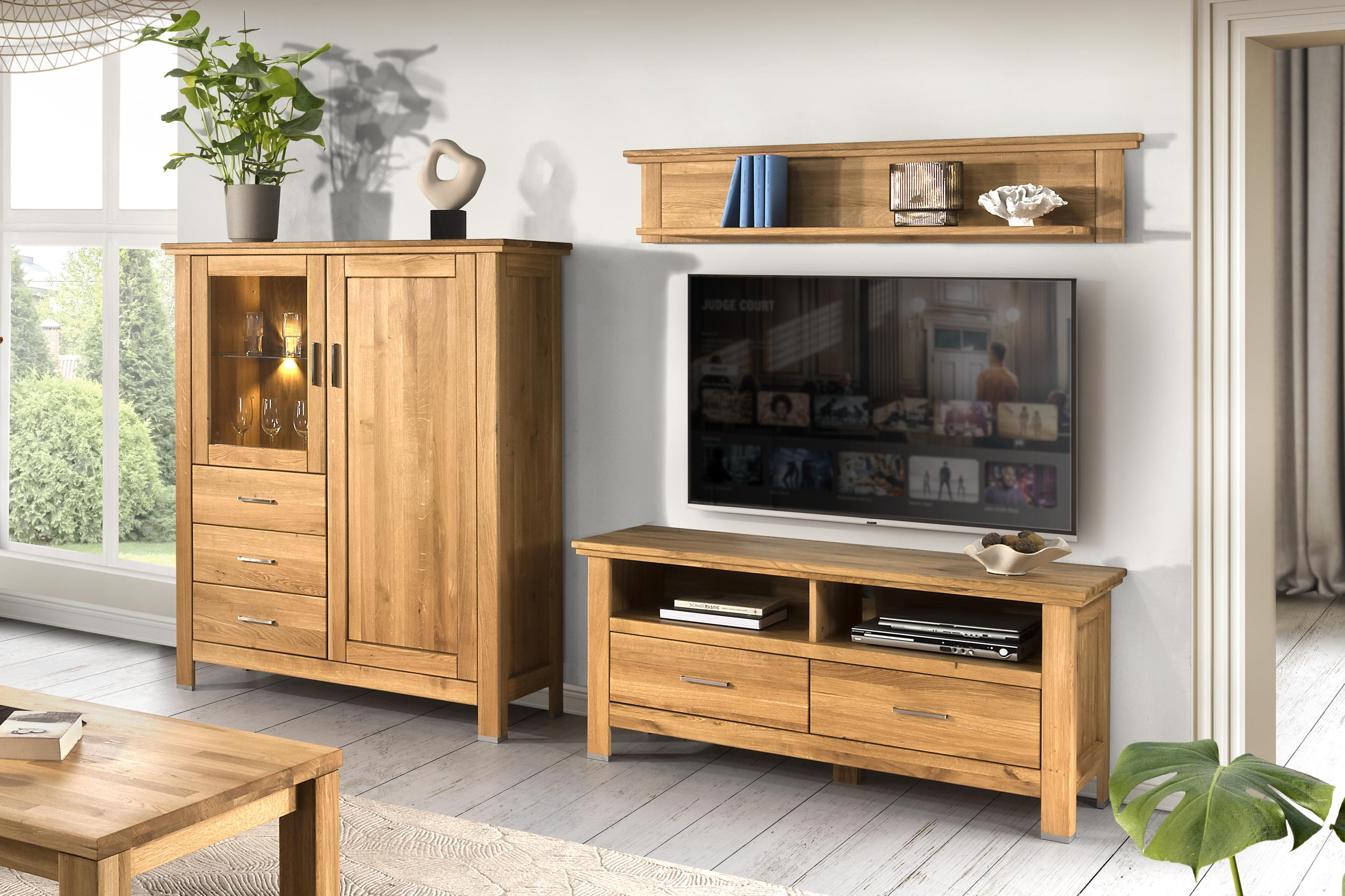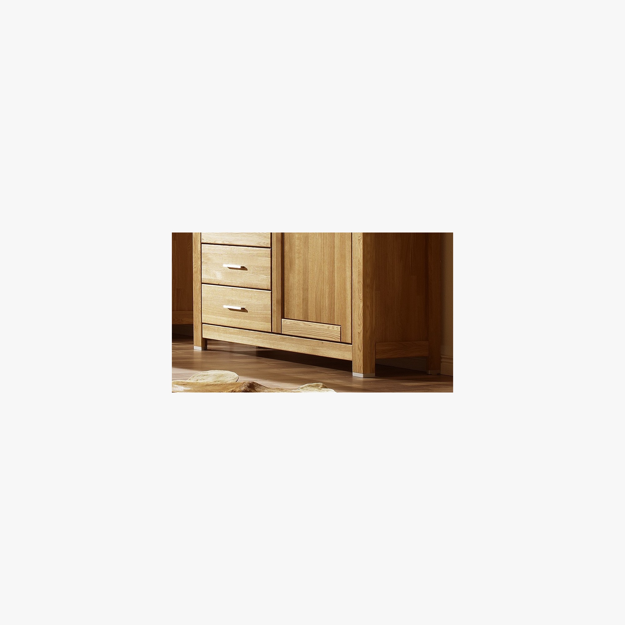 - Celomasívna dubová konštrukcia: Komoda je vyrobená zo 100% dubového masívu, čo zahŕňa korpus, police a dvierka, zaisťujúce vysokú pevnosť a dlhú životnosť.