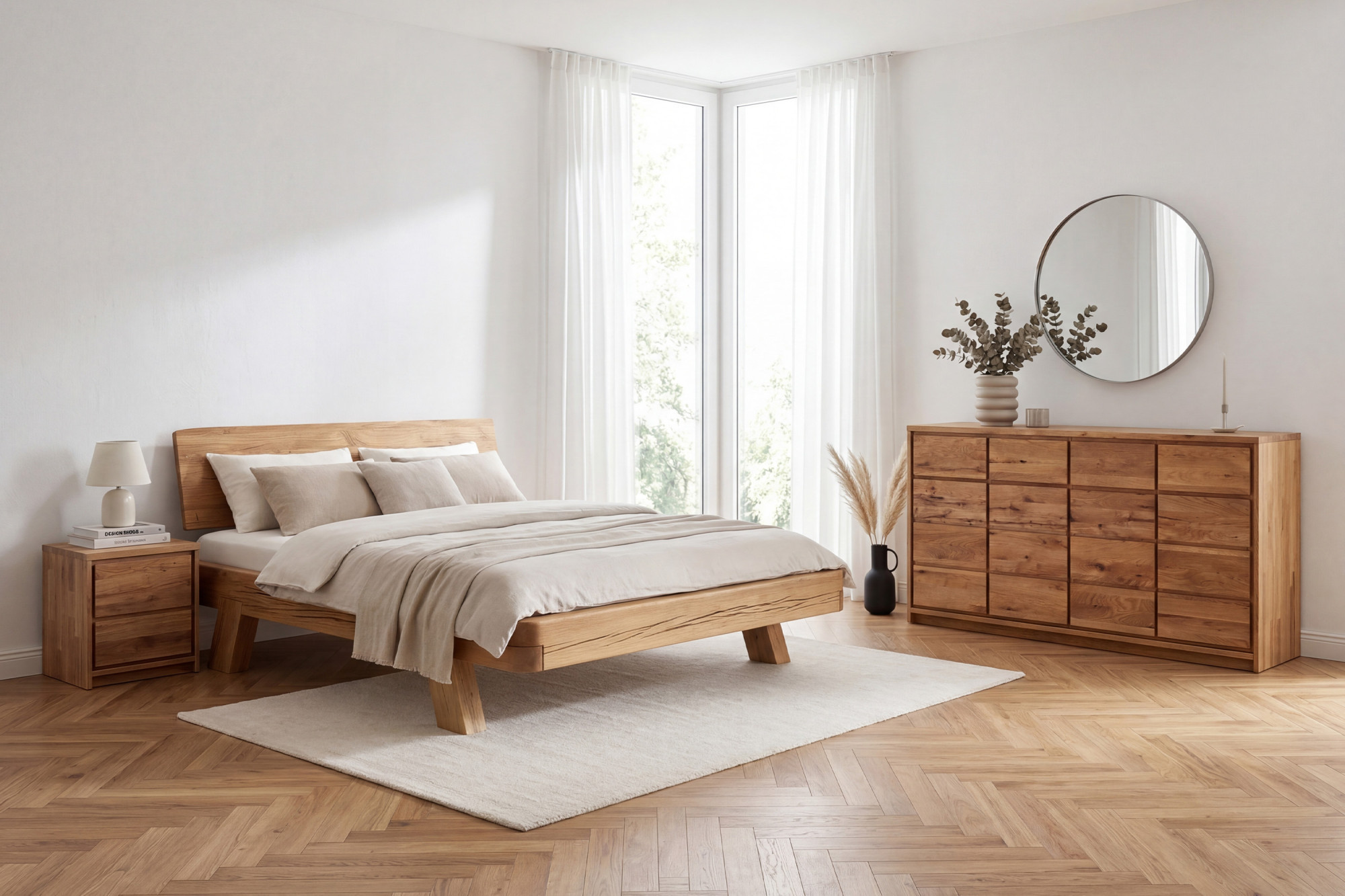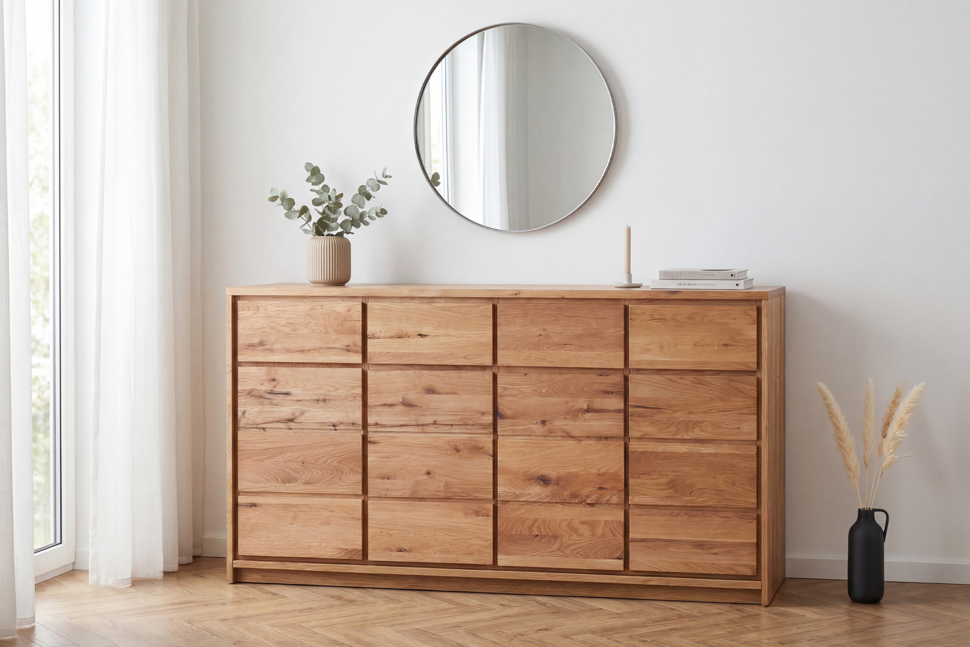 Hmotná vrchná doska z masívneho duba slúži zároveň ako elegantná odkladacia plocha pre dekorácie, sviečky či rámiky s fotografiami. Povrch celej komody je ošetrený prírodným olejom, ktorý vyživuje drevo, chráni ho pred opotrebením a zvýrazňuje jedinečnú štruktúru divokého duba. Konštrukcia je celomasívna – žiadna dyha ani MDF – čo zaručuje výnimočnú odolnosť a stabilitu na desiatky rokov. Komoda sa dodáva kompletne zložená, po doručení ju stačí iba umiestniť na vybrané miesto a okamžite začať využívať.
