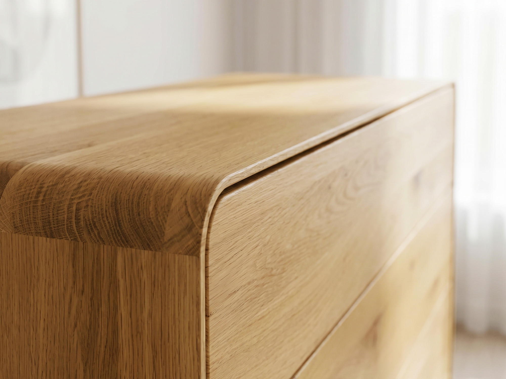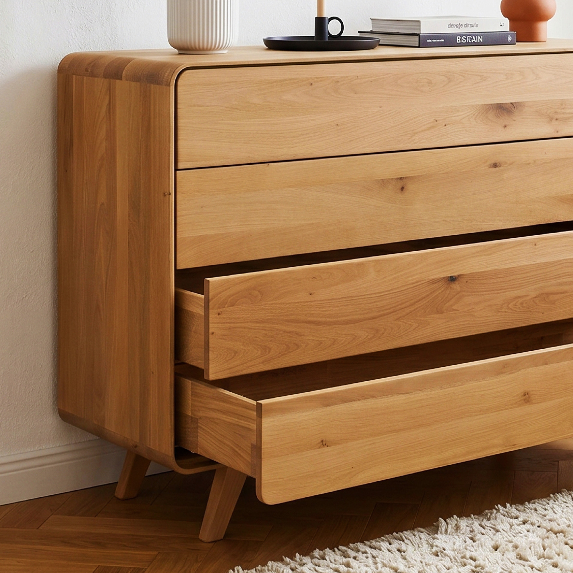 Komoda ponúka 4 priestranné zásuvky vybavené systémom soft-close, ktorý zabezpečuje tiché a plynulé zatváranie. Zásuvky majú vnútornú šírku 117 cm a výšku 18 cm, takže v nich pohodlne uložíte oblečenie, textil aj ďalšie praktické veci. Povrch je ošetrený prírodným olejom, ktorý zvýrazňuje unikátnu kresbu masívneho dubu a zároveň poskytuje spoľahlivú ochranu proti každodennému opotrebeniu. Olejovaná povrchová úprava umožňuje drevu dýchať a v prípade potreby je možné povrch jednoducho renovovať. Komoda je dodávaná už kompletne zostavená – zákazník si na mieste iba pripevní nohy vo výške 13 cm. Skvelo sa kombinuje s ďalšími kusmi z kolekcie Avalon, čím vytvoríte harmonicky zladený interiér obývacej izby alebo spálne.