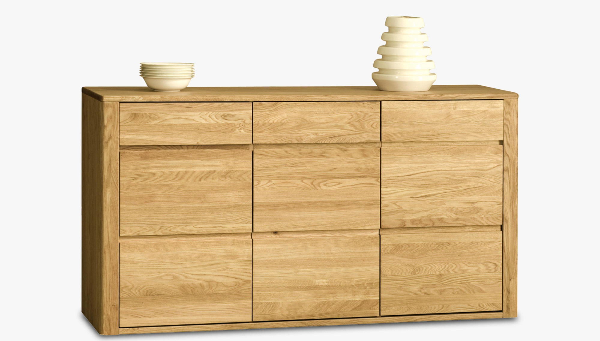 Moderná dubová komoda z kolekcie dubového nábytku, ktorých výhodou je nielen najmodernejší dizajn, ale aj masívne prevedenie. Dubová komoda má horné rady zásuviek, zo systémových soft-stop, teda sú samodosúvacie. Spodná časť komody je tvorená tromi dvierkami, ktoré majú vnútornú poličku. Dubová komoda má skryté úchyty a otváranie je veľmi jednoduché vďaka 45-stupňovým dokončeniam hran. Komody z rady Nice získali mnoho ocenení za dizajn a kvalitu.