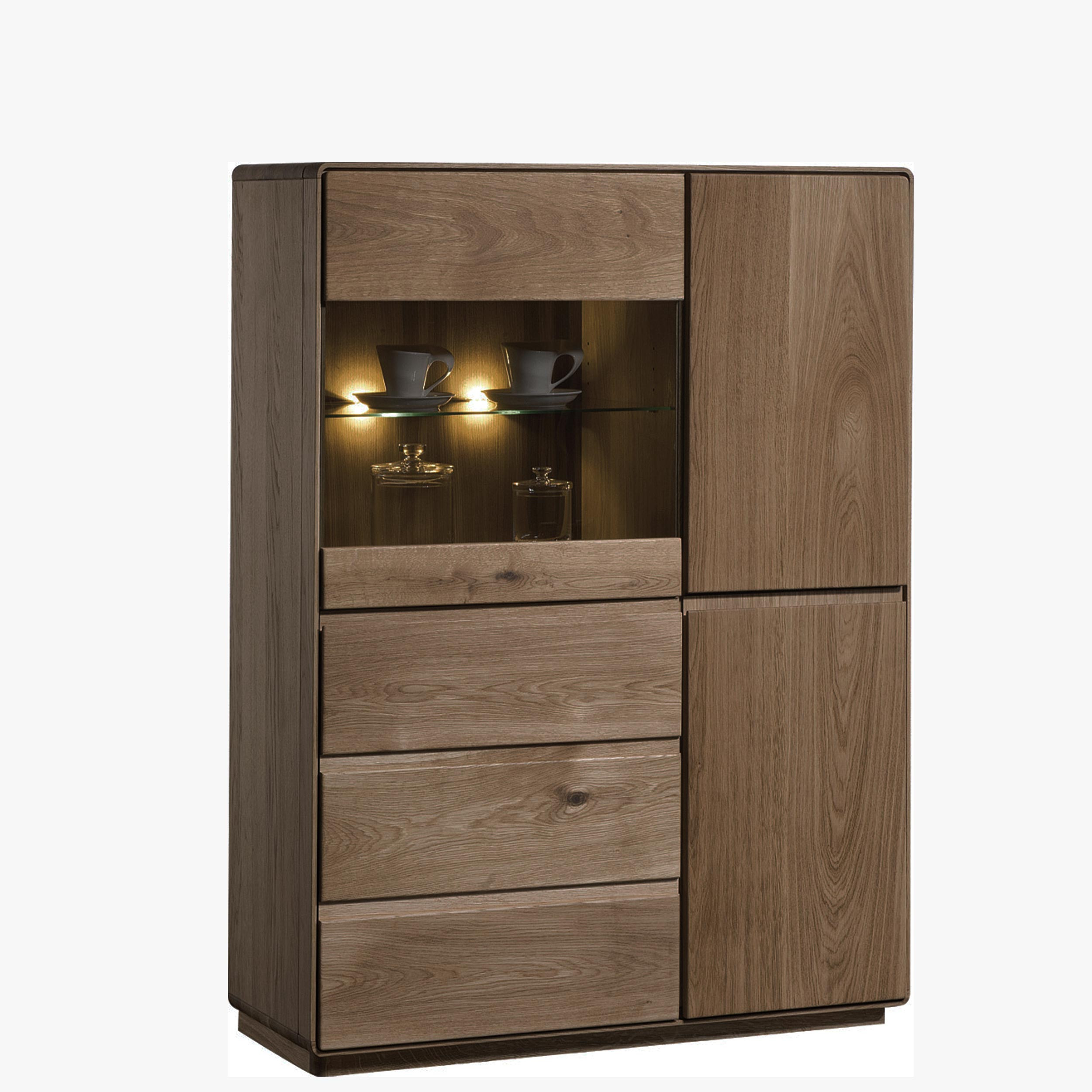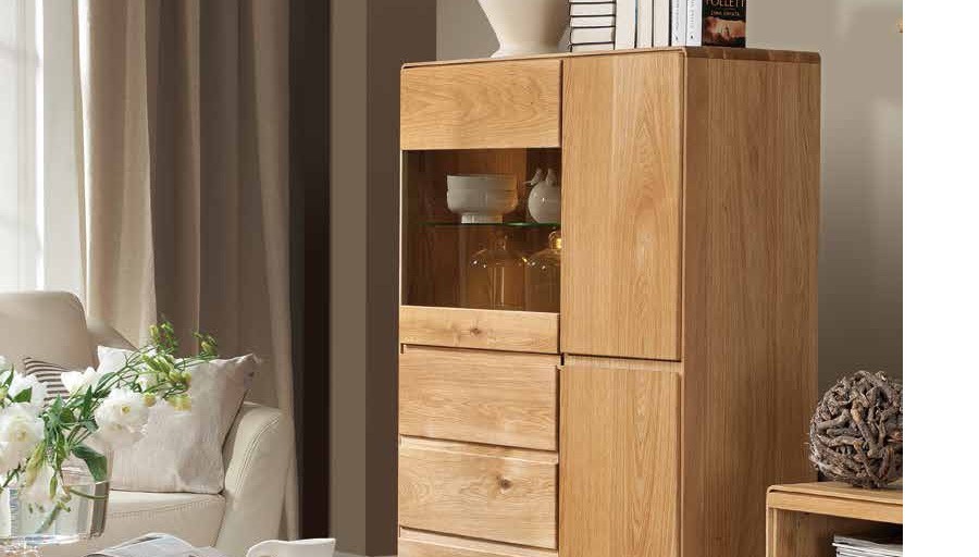 Luxusná dubová vitrína z masívu predstavuje skutočný klenot medzi nábytkom. Očarí každého, kto vyznáva krásu prírodného dreva i poctivo odvedenej remeselnej práce. Návrh renomovaného zahraničného dizajnéra vtlačil komode vzdušný, minimalistický štýl, ktorý podčiarkuje systém bezúchytkového otvárania dvierok a zásuviek. Robustný dojem masívnej dubovej vitríny zmierňujú mierne zaoblené hrany. Krása prírodného duba prostredníctvom vitríny pôsobí doslova na všetky zmysly!
