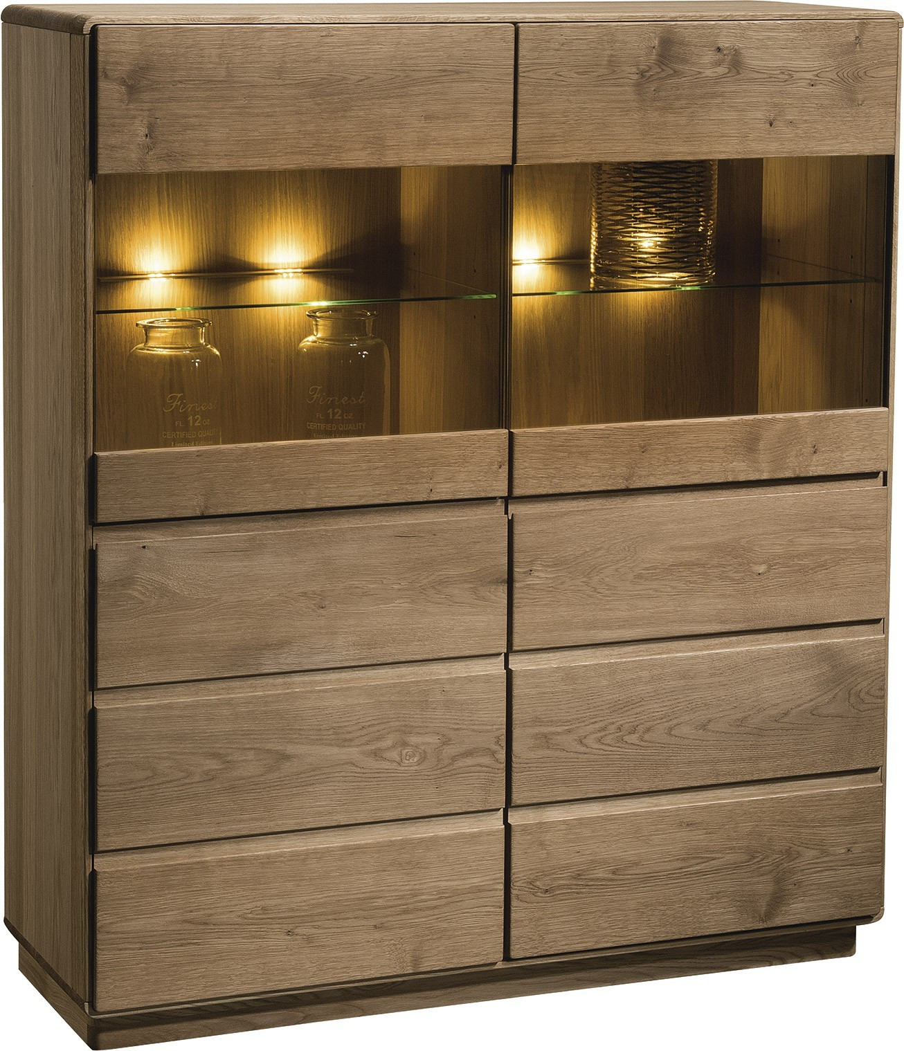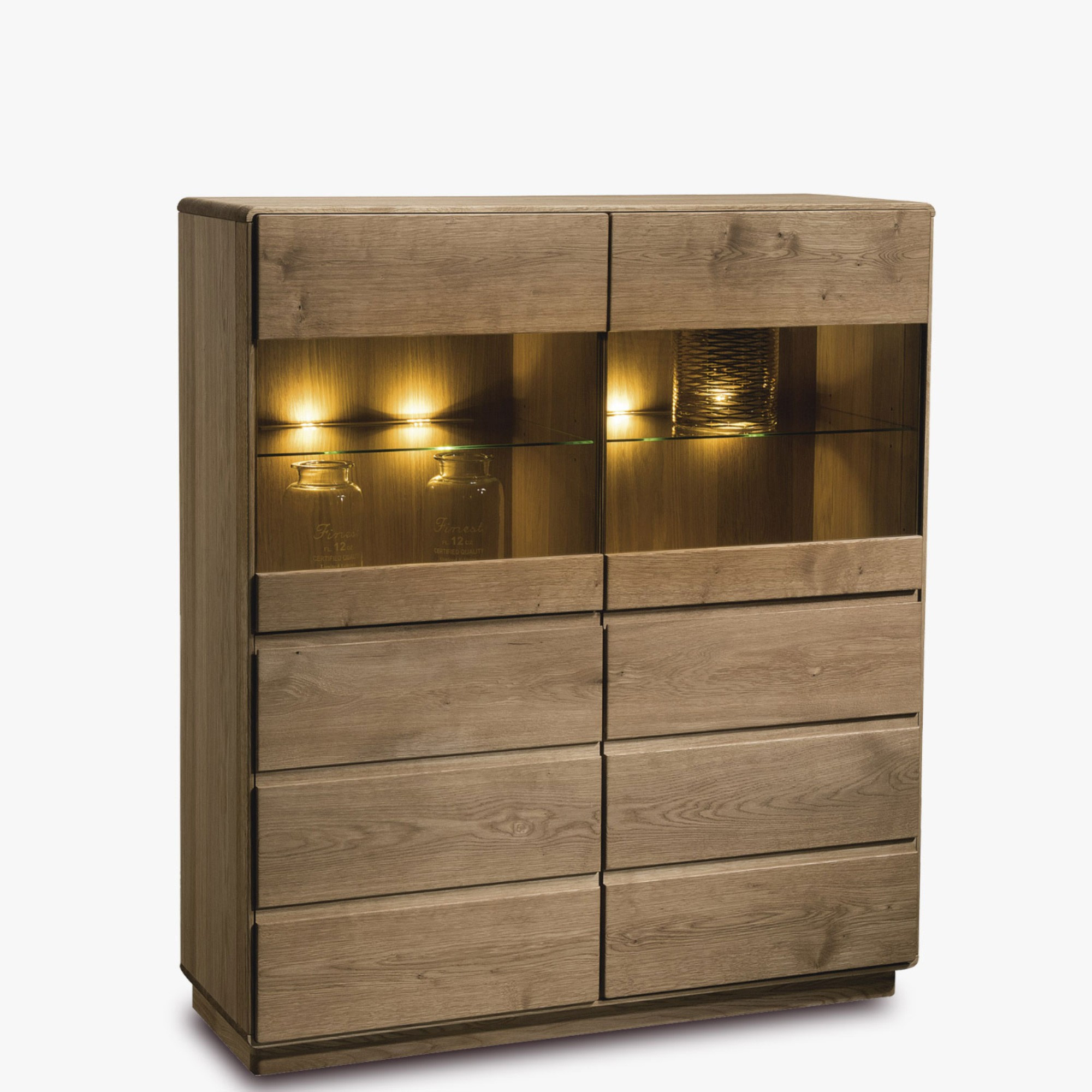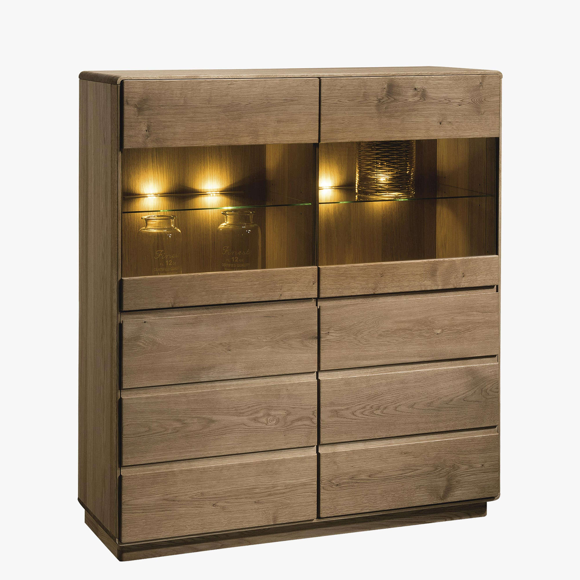 Predná časť a vrchná doska vitríny je vyrobená z dubového masívu, pre korpus bola použitá dubová dyha. Zadná stena je z preklížky. Nábytok je dodávaný bez osvetlenia, za príplatok je možnosť doobjednania.