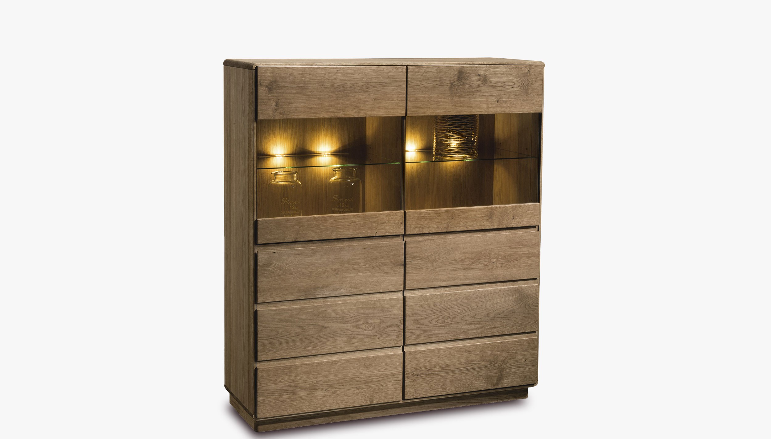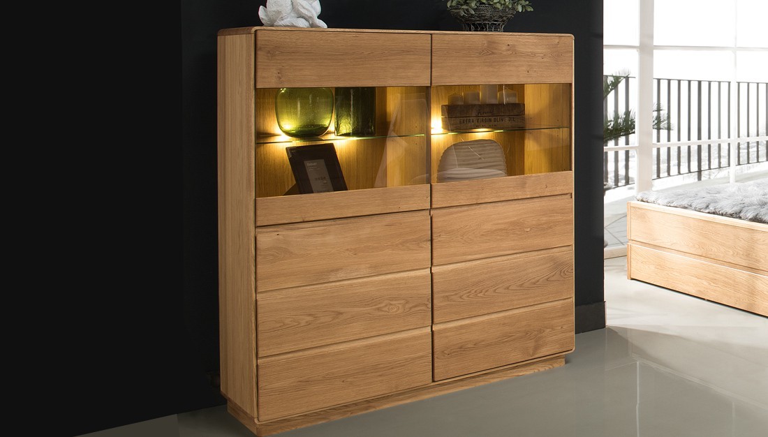 Masívne drevo z divokého dubu pôsobí spolu s povrchovou úpravou olejom a voskom skutočne prírodným dojmom. Vyberte si z ponúkaných odtieňov podľa vašich preferencií a vkusu ten pravý! Dubová vitrína je k dispozícii buď v svetlejšej prírodnej ekologickej verzii dub olej, alebo vo výnimočnej povrchovej úprave dub pálený. Pre konečnú úpravu sa používa výhradne renomovaný olej a moridlo nemeckej značky Livos.