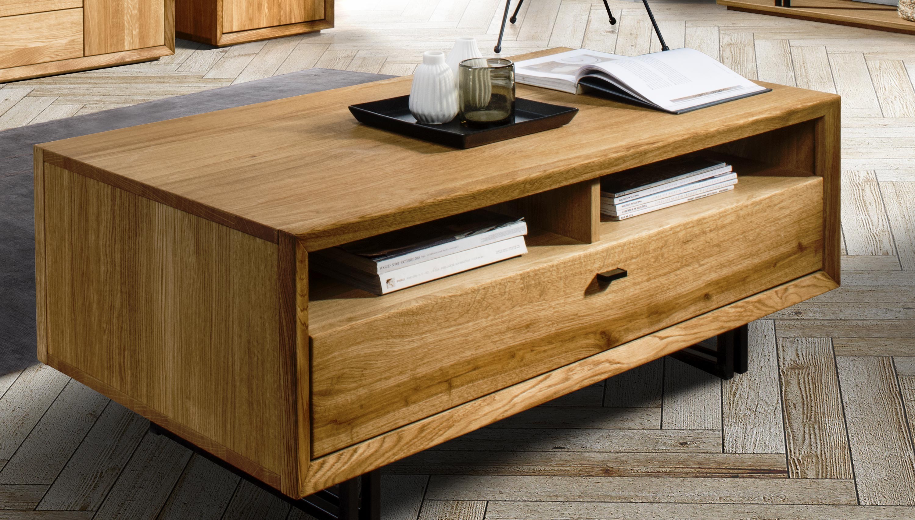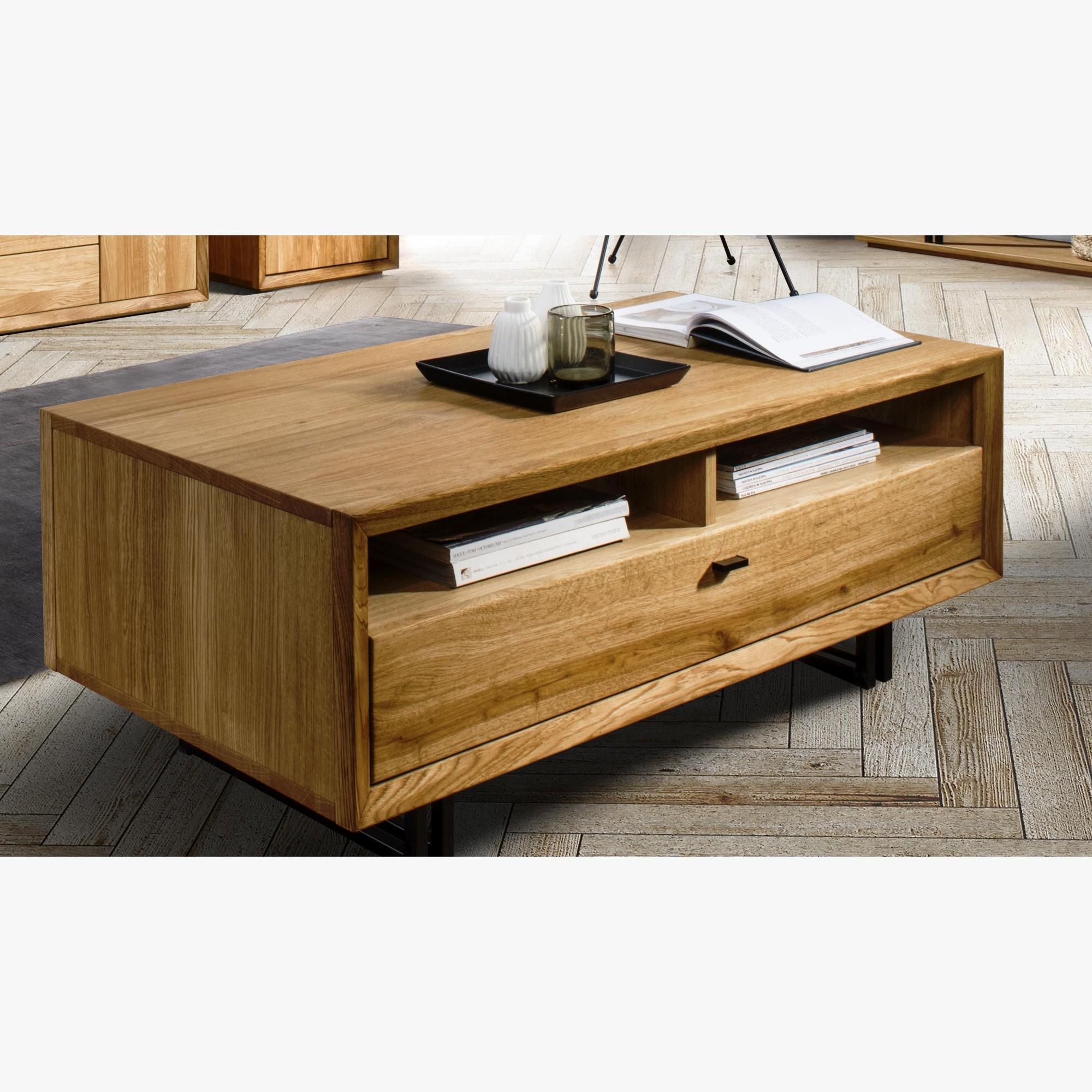 Veľkým bonusom sú priestranné zásuvky so systémom tichého zatvárania, ktoré poskytujú dostatok úložného priestoru na vaše veci. Stolík je ideálny v kombinácii s ďalším nábytkom z kolekcie Vigo, ktorú charakterizuje moderný dizajn a výnimočné remeselné spracovanie.