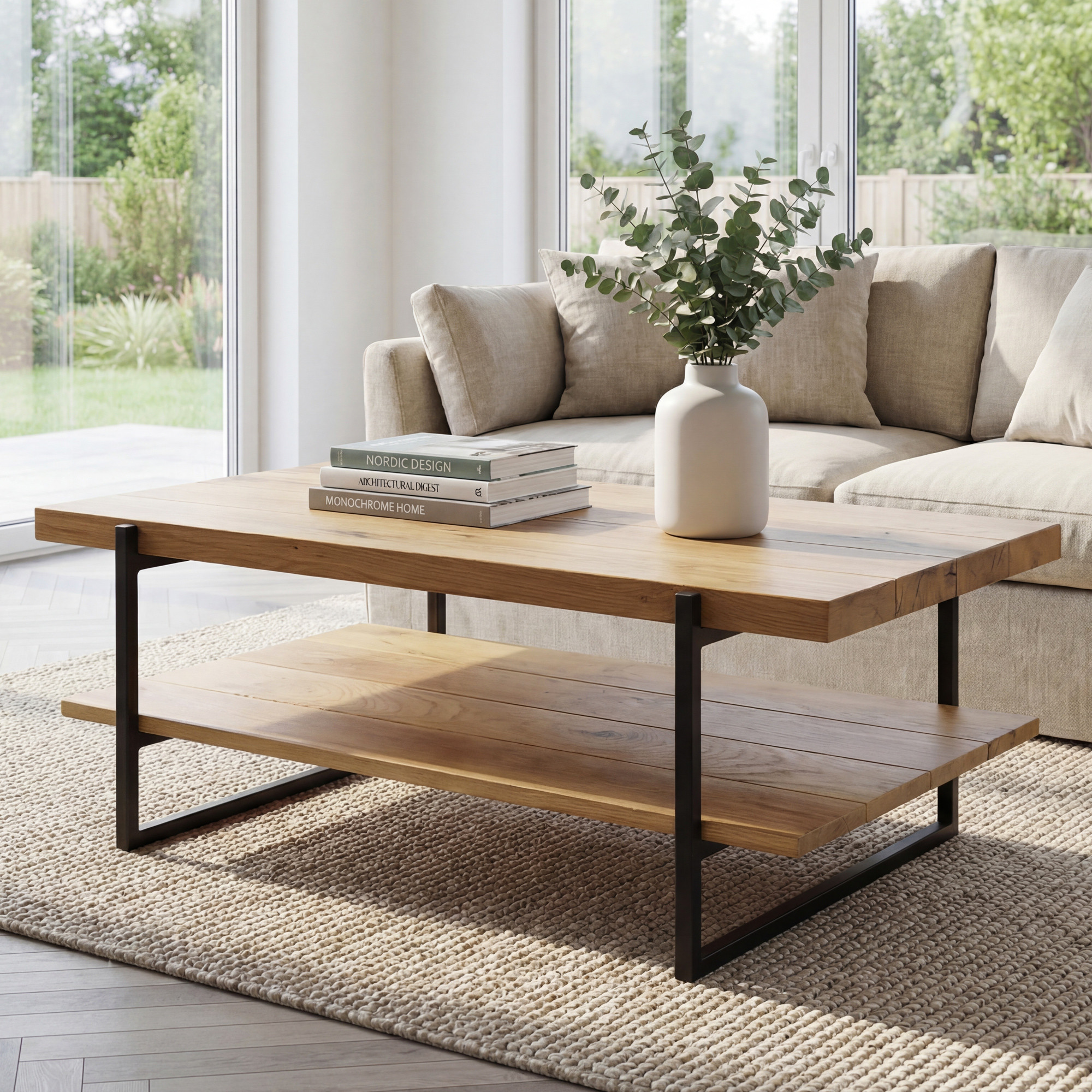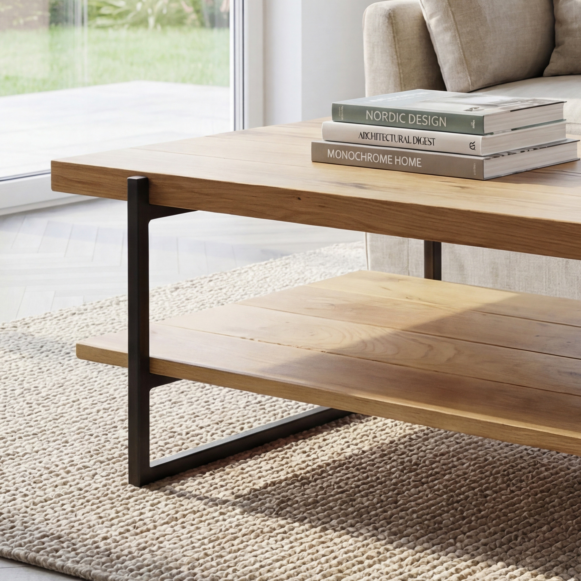 Povrchová úprava dreva je ekologický olej v farbe dub natural, ktorý chráni drevo a zároveň zdôrazňuje jeho prirodzený vzor a farbu. Stolík je osadený štýlovými kovovými nohami v čiernej matnej farbe, čo pridáva moderný kontrast ku tradičnému vzhľadu dreva. Rozmery dosky sú 100 x 60 cm, pričom vďaka premyslenému umiestneniu nôh je celkový rozmer stolíka o niečo väčší.