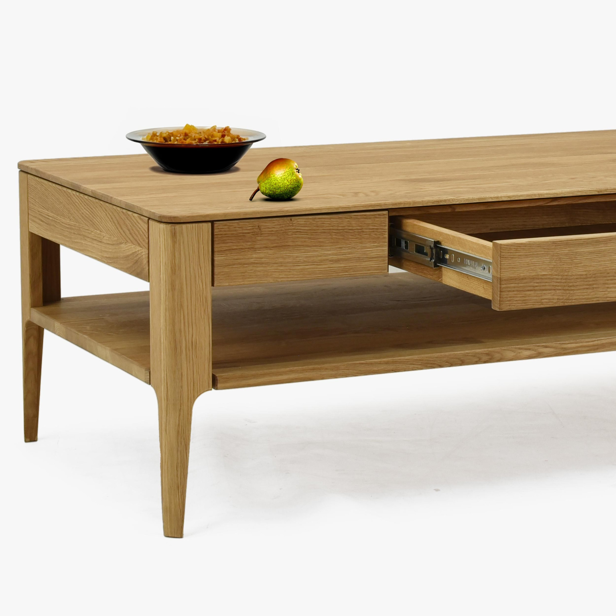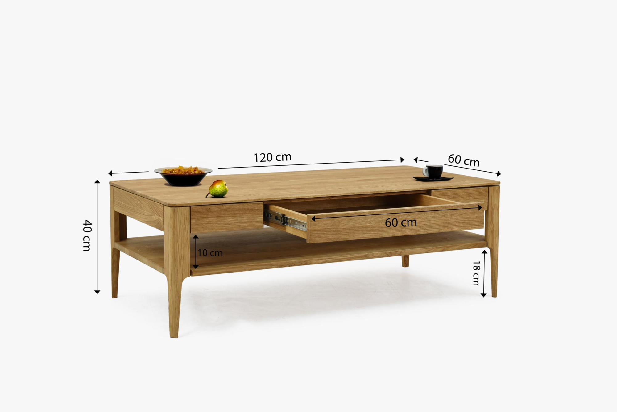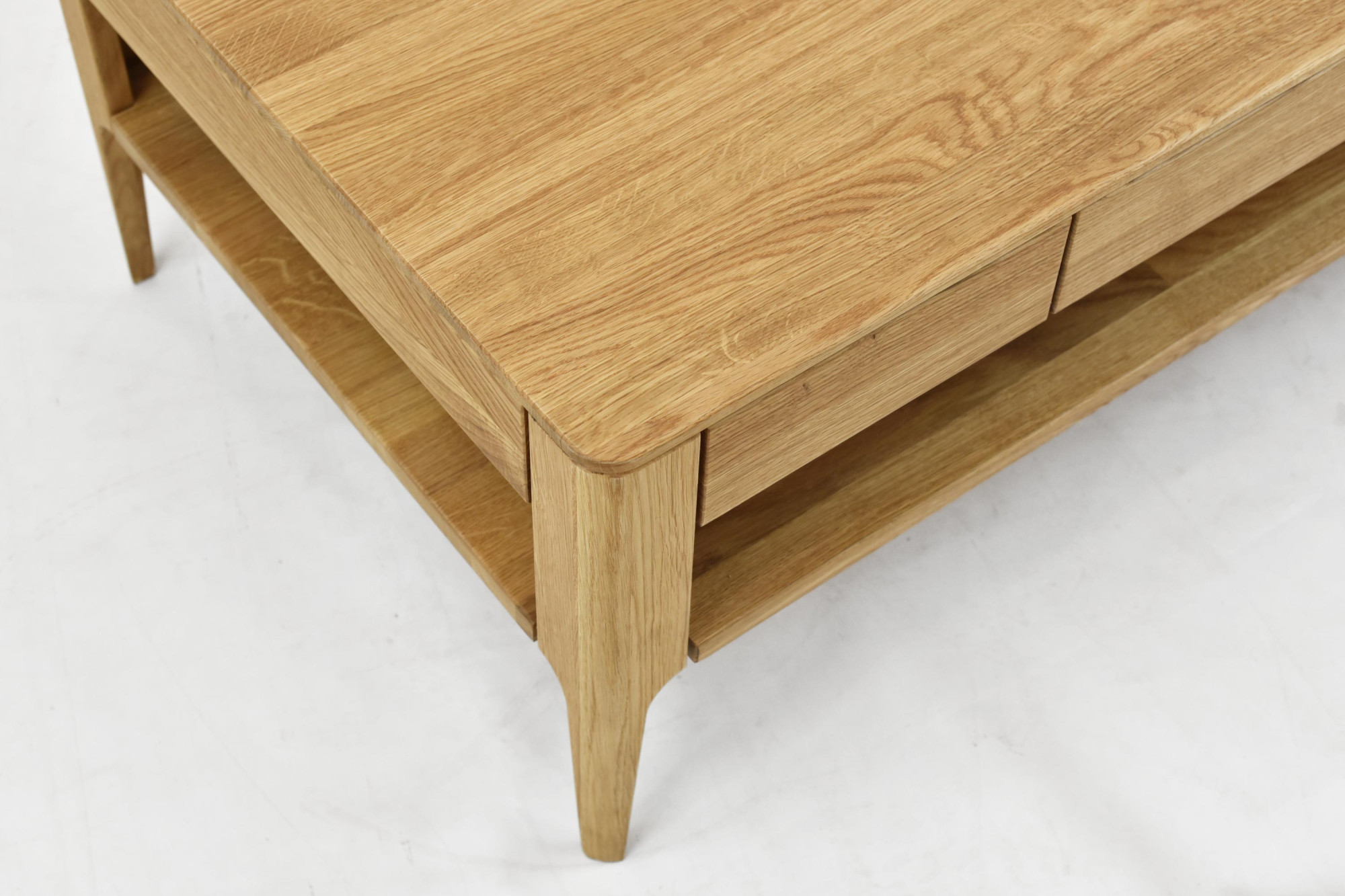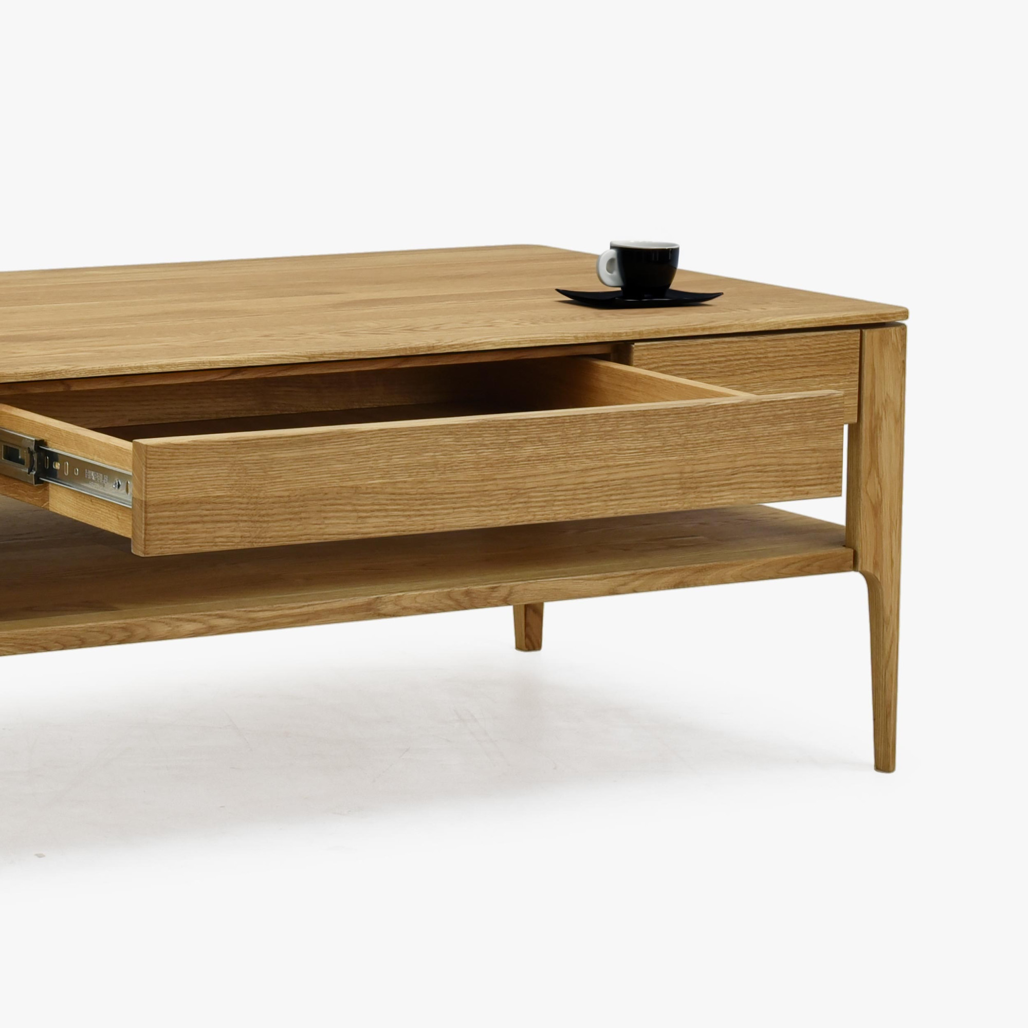 Konferenčný stolík je veľmi praktický vďaka svojmu premyslenému usporiadaniu. Dispozuje odkladacou policou a jednou zásuvkou na uloženie menších vecí, čo poskytuje dostatok úložného priestoru pre vaše potreby. Všetky zásuvky a dvierka sú vybavené tichým zatváraním soft-close, čo zabezpečuje hladký a tichý chod a predlžuje životnosť nábytku. Povrch stolíka je ošetrený kvalitným talianskym olejom Borma Wachs v farbe dub natural, čo zvýrazňuje prirodzenú štruktúru dreva a poskytuje ochranu proti vonkajším vplyvom.