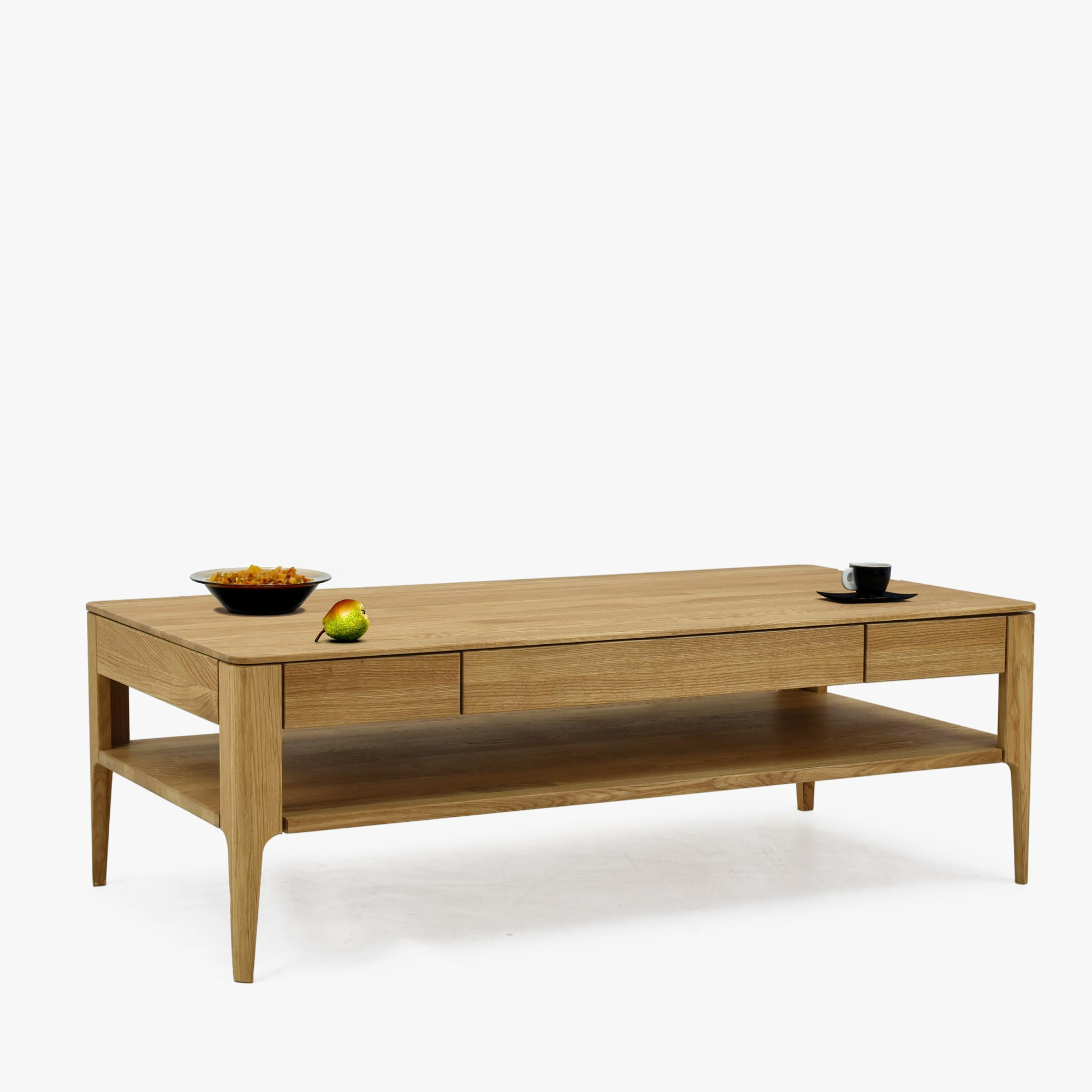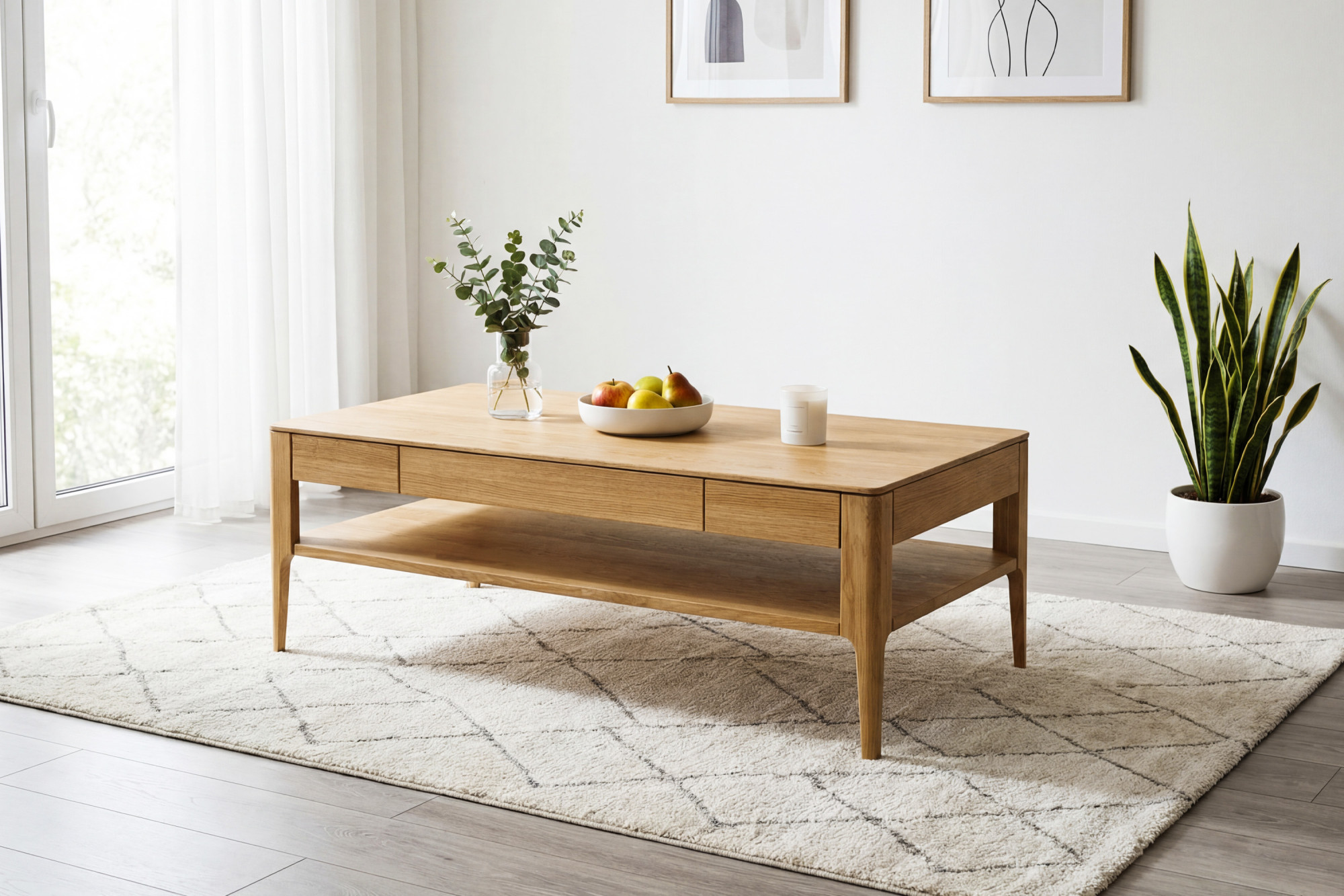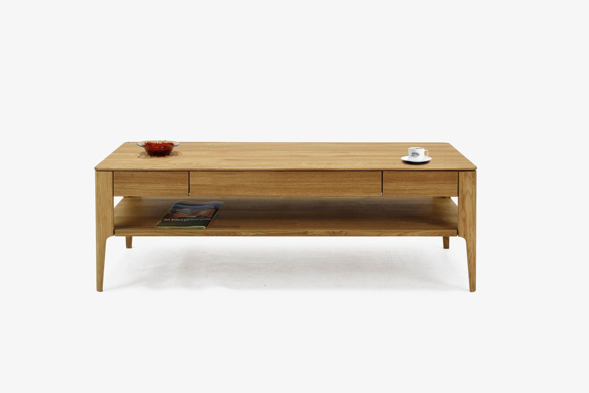 Konferenčný stolík je veľmi praktický vďaka svojmu premyslenému usporiadaniu. Dispozuje odkladacou policou a jednou zásuvkou na uloženie menších vecí, čo poskytuje dostatok úložného priestoru pre vaše potreby. Všetky zásuvky a dvierka sú vybavené tichým zatváraním soft-close, čo zabezpečuje hladký a tichý chod a predlžuje životnosť nábytku. Povrch stolíka je ošetrený kvalitným talianskym olejom Borma Wachs v farbe dub natural, čo zvýrazňuje prirodzenú štruktúru dreva a poskytuje ochranu proti vonkajším vplyvom.