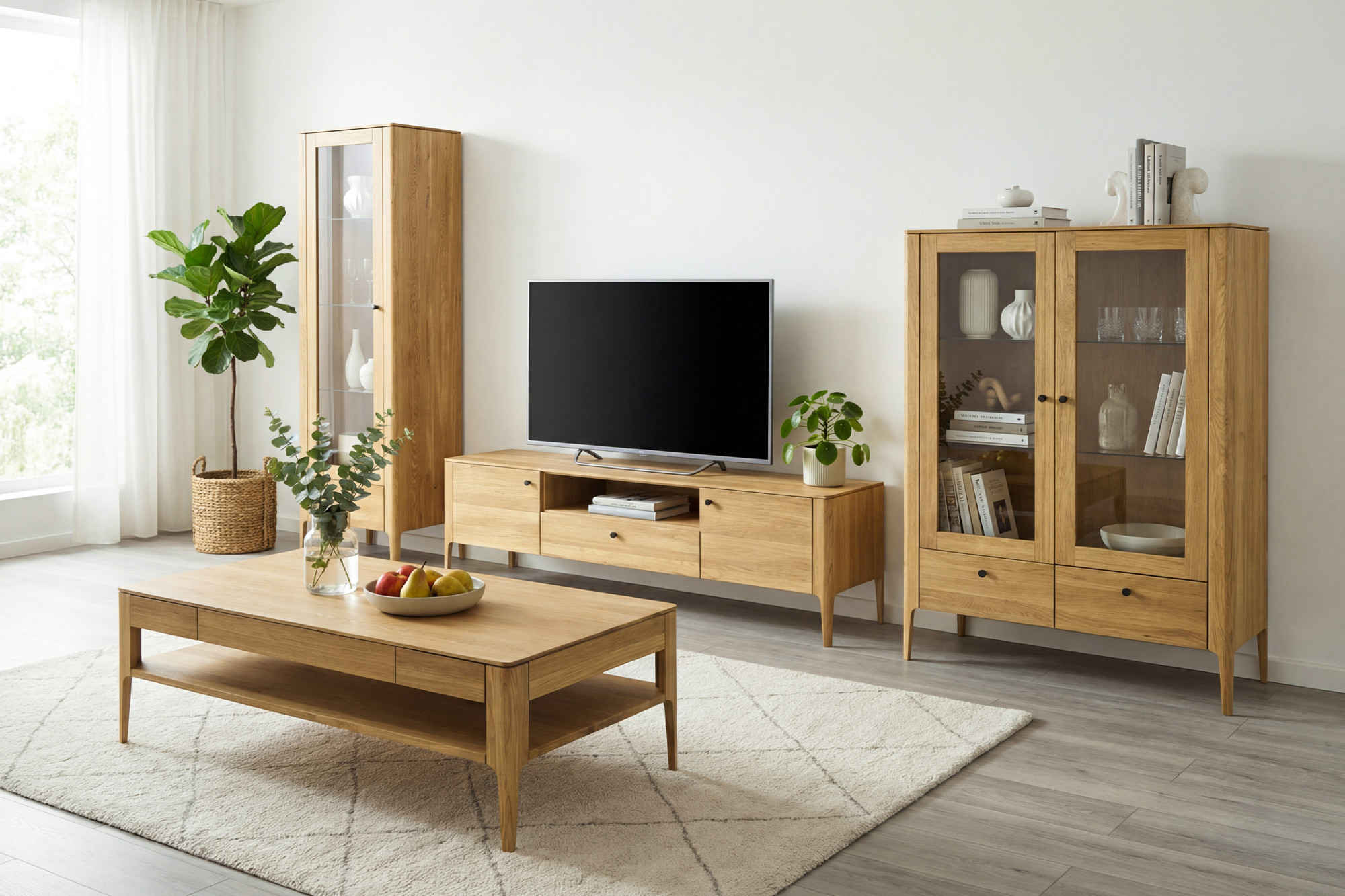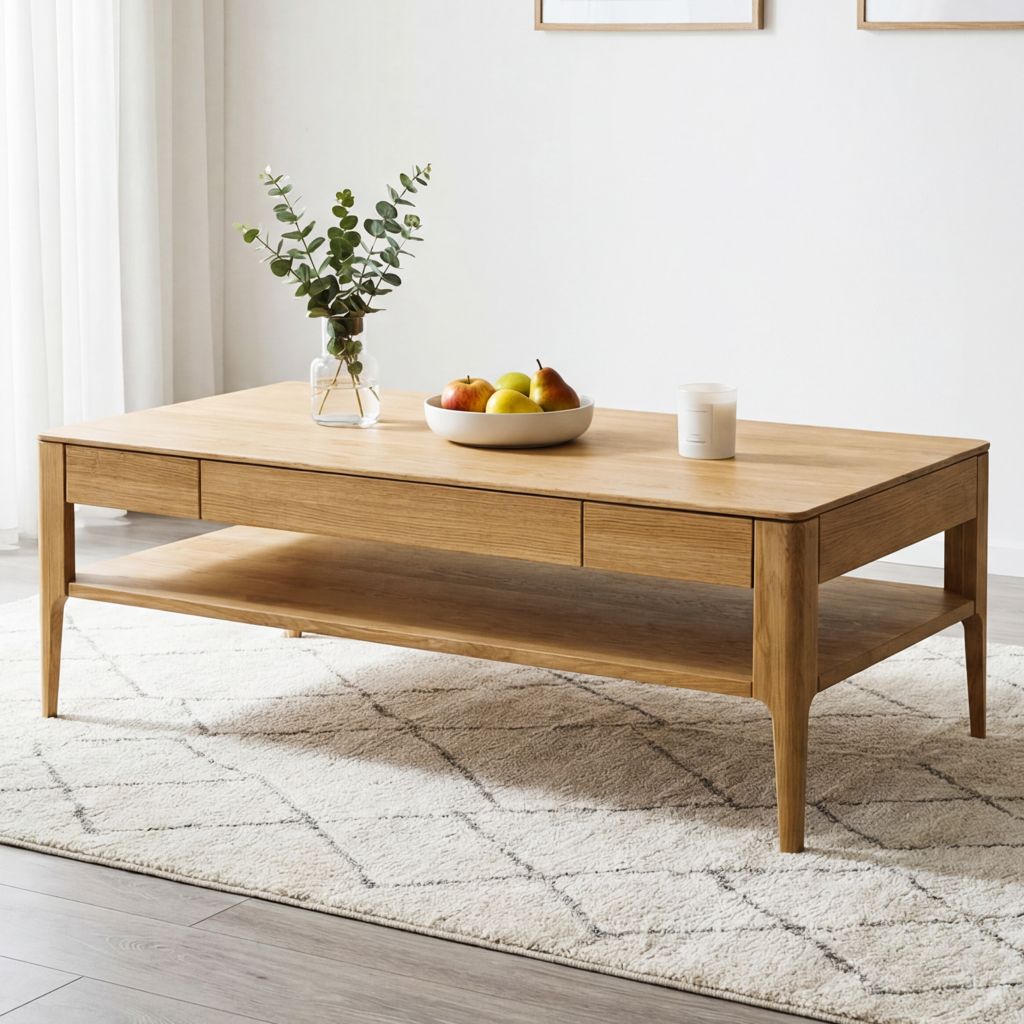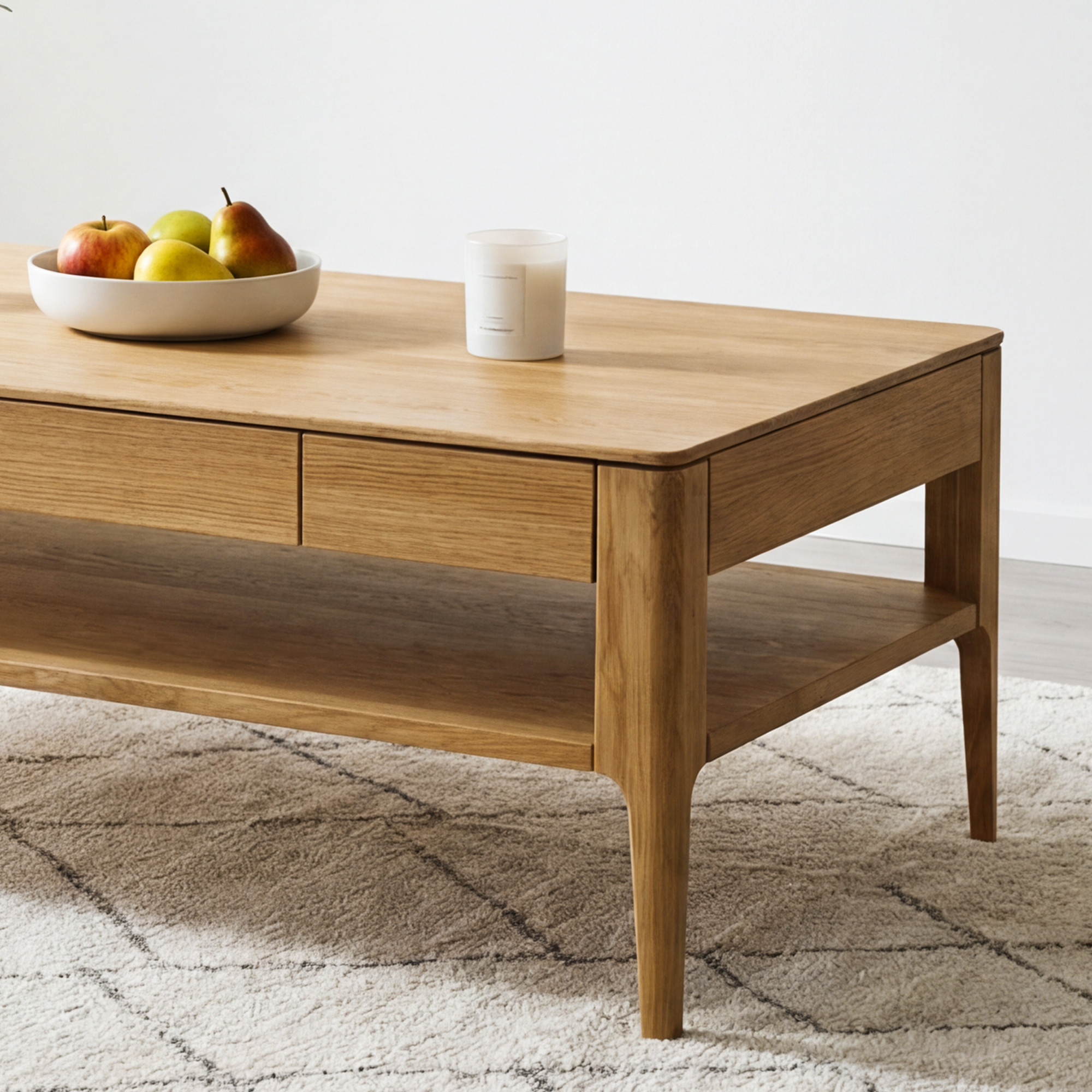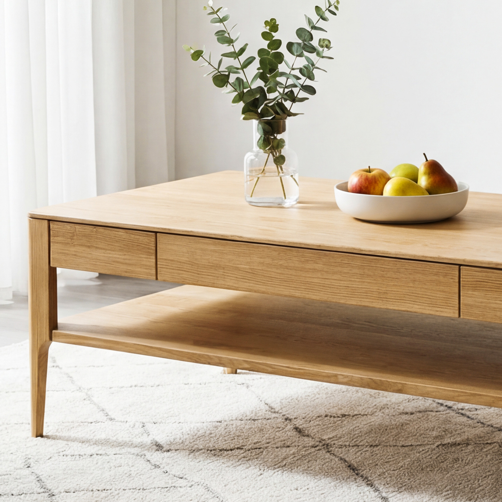 Konferenčný stolík je veľmi praktický vďaka svojmu premyslenému usporiadaniu. Dispozuje odkladacou policou a jednou zásuvkou na uloženie menších vecí, čo poskytuje dostatok úložného priestoru pre vaše potreby. Všetky zásuvky a dvierka sú vybavené tichým zatváraním soft-close, čo zabezpečuje hladký a tichý chod a predlžuje životnosť nábytku. Povrch stolíka je ošetrený kvalitným talianskym olejom Borma Wachs v farbe dub natural, čo zvýrazňuje prirodzenú štruktúru dreva a poskytuje ochranu proti vonkajším vplyvom.