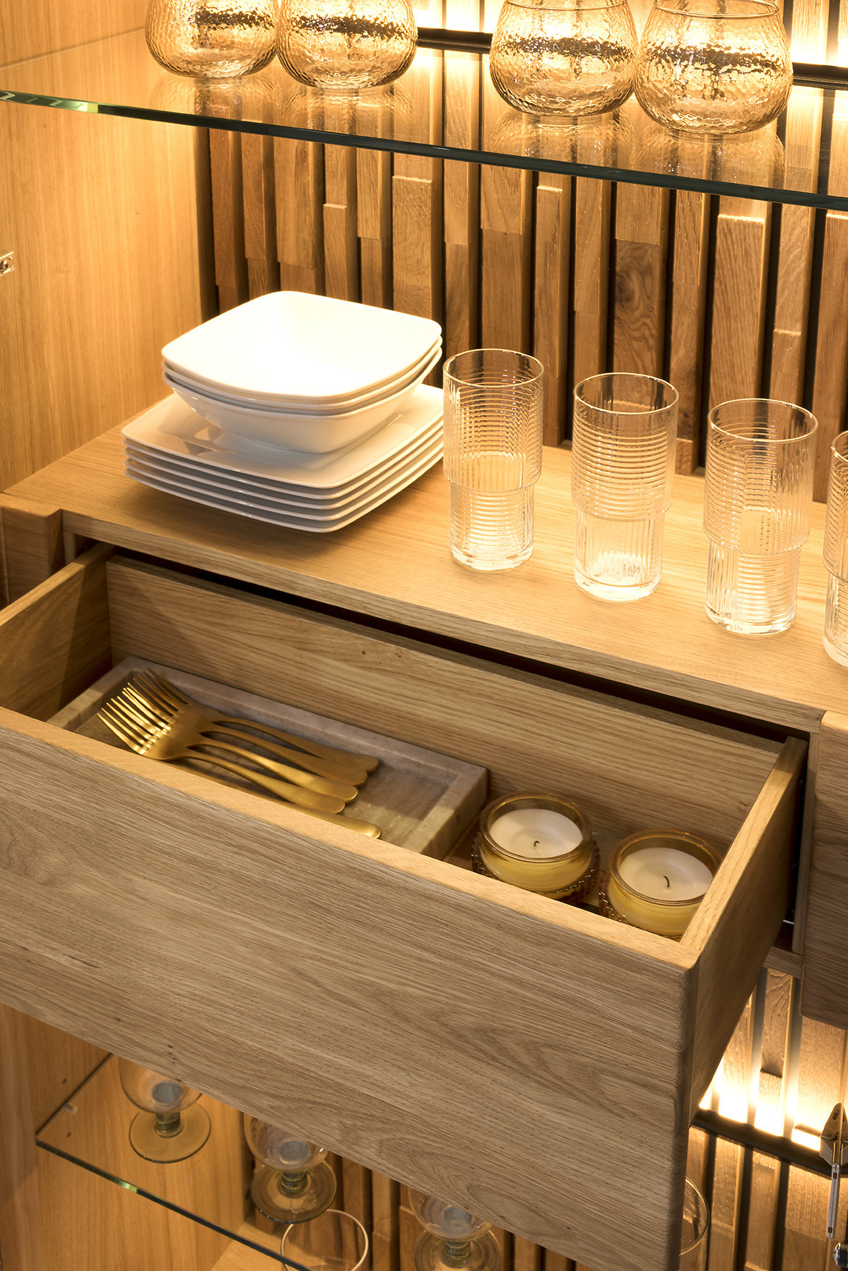 Luxusný nábytok do obývacej izby v kvalitnom prevedení dubového masívu v kombinácii s dubovou dyhou, kde hlavné viditeľné časti sú masívne. Dodávame v dekore dub prírodný medový kartáčovaný. Nábytok je dodávaný v zmontovanom stave (pevnejší, stabilnejší, bez viditeľných a estetiku kaziacich skrutiek než skladacie zostavy) a zásuvky i dvierka sú vybavené systémom tlmenia pre jemné a tiché zatváranie. Poličky v presklených častiach sú sklenené. Elegantná dubová obývacia zostava z masívu a prírodnej dyhy. Moderný industriálny dizajn s parketovým vzorom a kovovými nožičkami – to sú hlavné prednosti dubového nábytku Tramontino. Zadné časti presklených dvierok sú vyrobené špeciálnym dizajnom zo skladaných parketových destičiek, viz foto. Nábytok je ošetrený prírodným voskom a olejom nemeckej značky Livos.