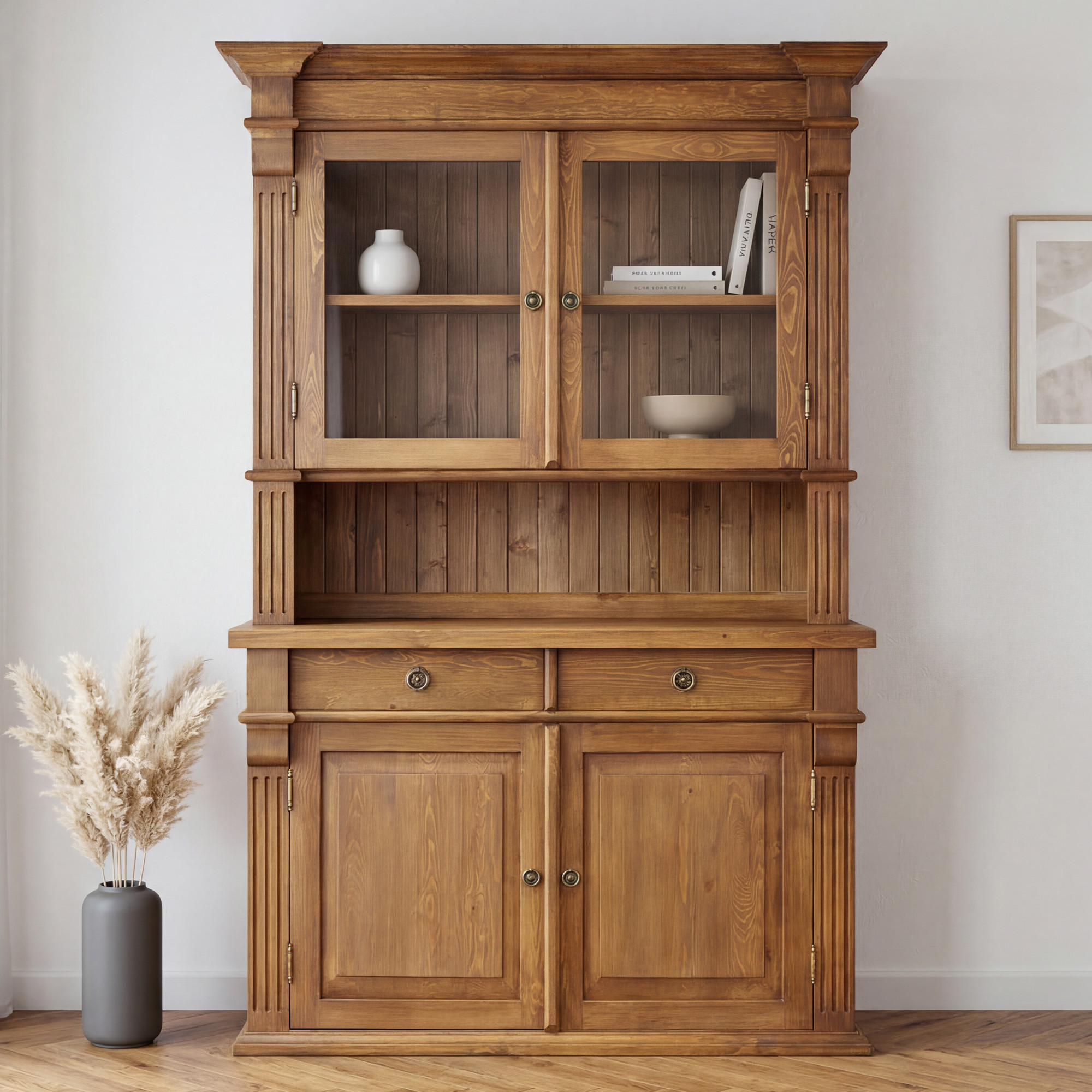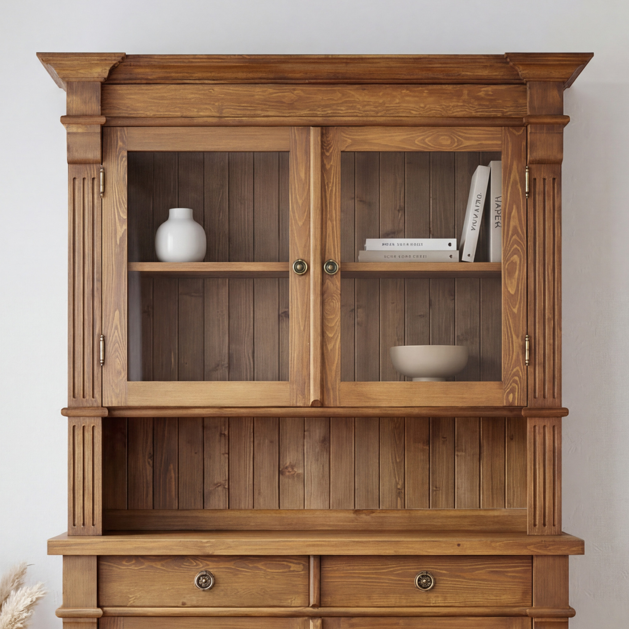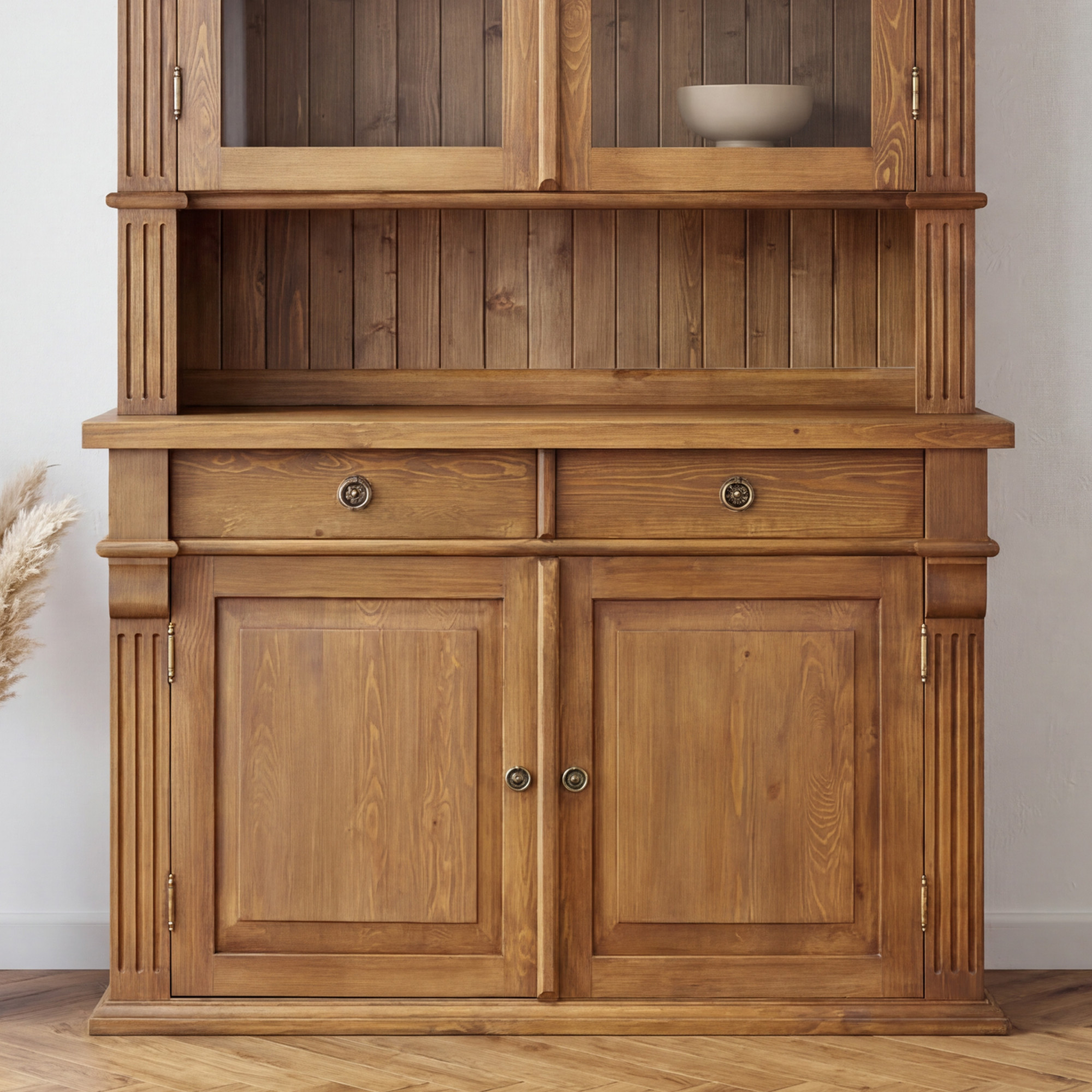 Masívna konštrukcia z borovicového dreva zaručuje vysokú pevnosť, stabilitu a odolnosť pri každodennom používaní. Hnedý lak s patinou zvýrazňuje prirodzenú kresbu dreva a vytvára útulný, elegantný dojem. Celkový vzhľad dopĺňajú originálne úchytky od talianskej značky Bosetti Marella a zapustené pánty v staromeďnom prevedení, ktoré dokonale ladia s tradičným štýlom kolekcie Prestige. Príborník tak predstavuje ideálne spojenie poctivého remesla, funkčnosti a reprezentatívneho vzhľadu.