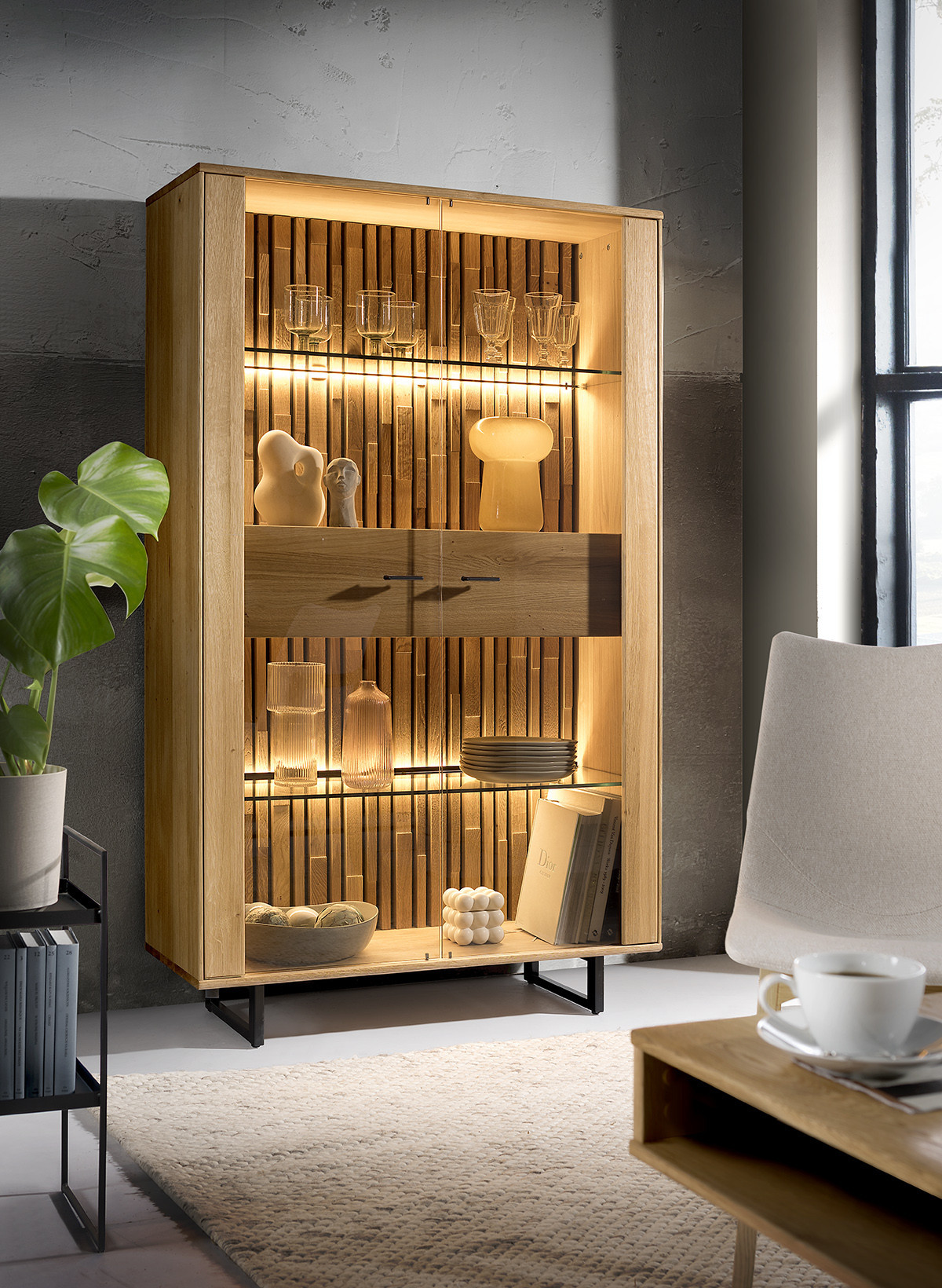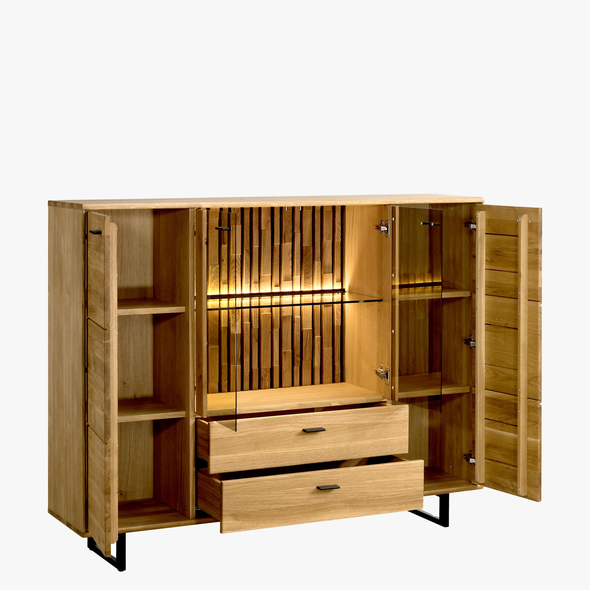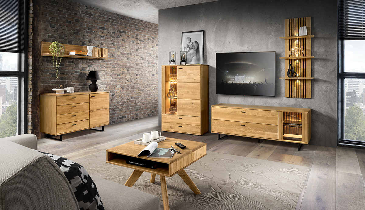 Luxusný nábytok do obývacej izby v kvalitnom prevedení dubového masívu v kombinácii s dubovou dyhou, kde hlavné viditeľné časti sú masívne. Dodávame v dekore dub prírodný medový kartáčovaný. Nábytok je dodávaný v zmontovanom stave (pevnejší, stabilnejší, bez viditeľných a estetiku kaziacich skrutiek než skladačky) a zásuvky i dvierka sú vybavené systémom tlmenia pre mäkké a tiché zatváranie. Poličky v presklených častiach sú sklenené. Elegantná dubová obývacia zostava z masívu a prírodnej dyhy. Moderný industriálny dizajn s parketovým vzorom a kovovými nožičkami – to sú hlavné prednosti dubového nábytku Tramontino. Zadné časti presklených dvierok sú vyrobené špeciálnym dizajnom zo skladaných parketových destičiek, viď foto. Nábytok je ošetrený prírodným voskom a olejom nemeckej značky Livos.