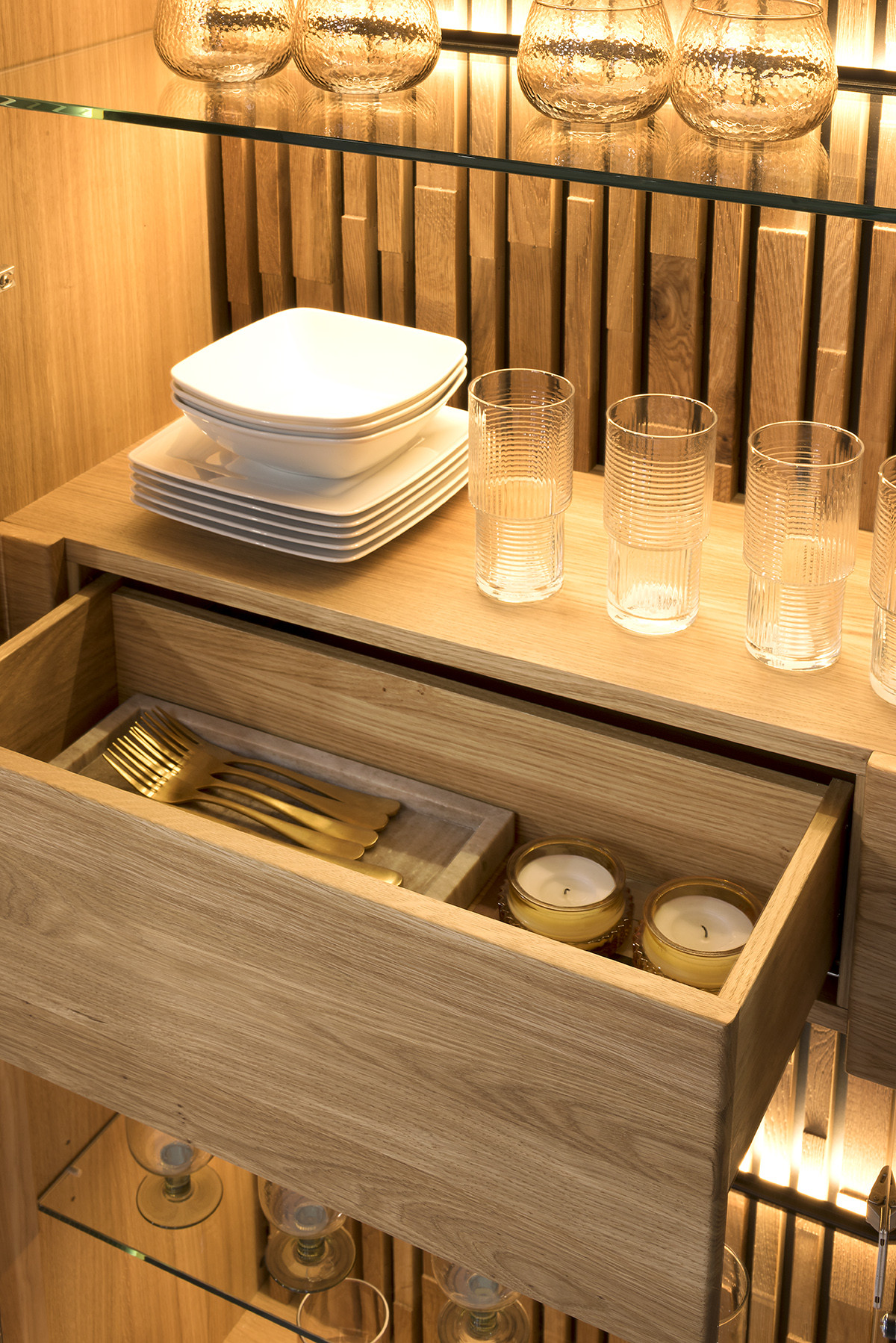 Praktické úložné riešenie: Príborník ponúka dostatok úložného priestoru pre vaše jedálenské potreby. Sklenené police sú ideálne pre vystavenie krásneho riadu alebo dekorácií, zatiaľ čo spodné zásuvky a drevené police poskytujú praktické miesto na uskladnenie ďalších vecí.