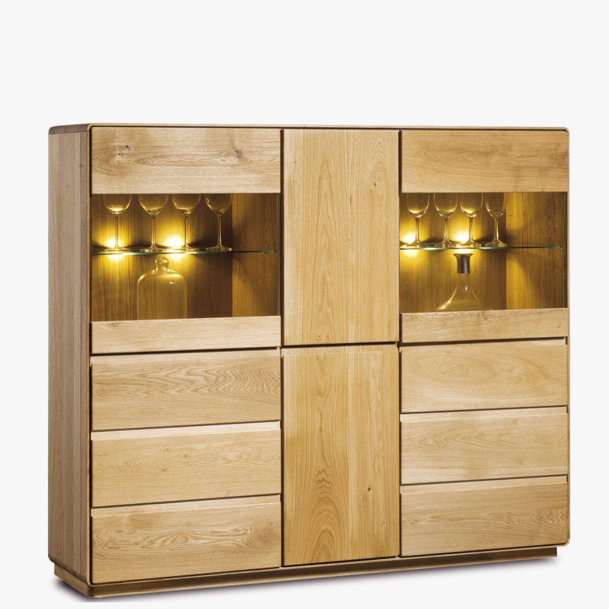 Renomovaný zahraničný dizajnér vtlačil návrhu kredenca vzdušný štýl s minimialistickým poňatím, hladkými plochami a jemne zaoblenými hranami. Dojem vzdušnosti dokonale podporuje systém bezúchytkového otvárania dvierok. Nábytok je dodávaný bez osvetlenia, za príplatok je možnosť doobjednania.