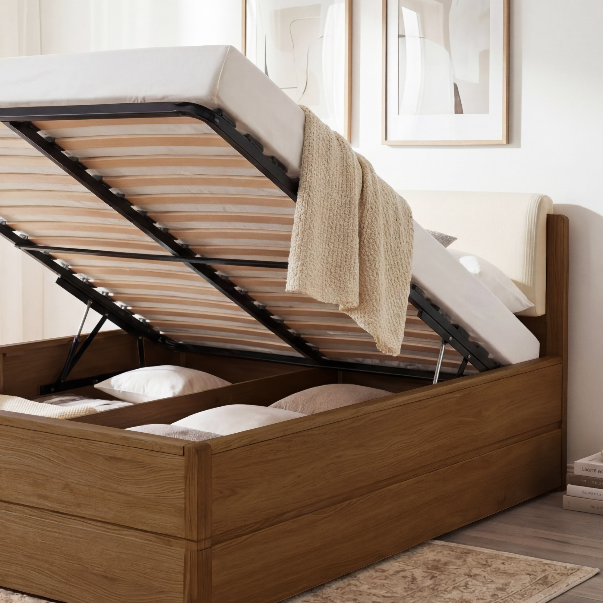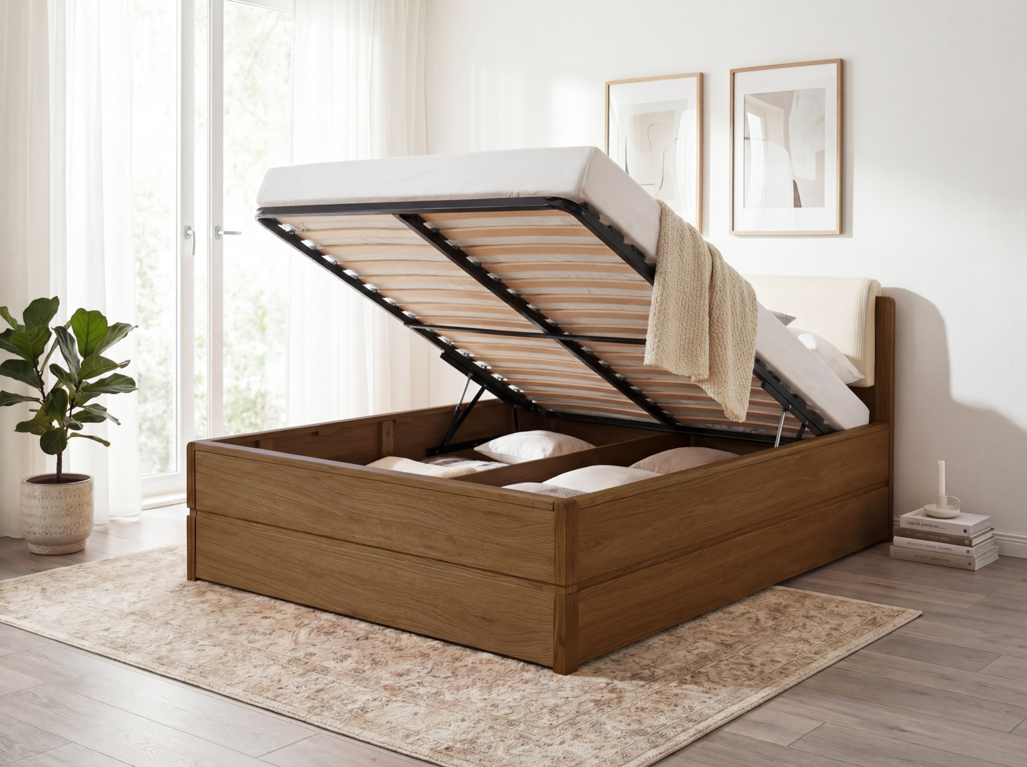 Súčasťou dodávky je kvalitný lamelový rošt s 34 lamelami. Matrac si môžete dokúpiť zvlášť podľa vašich preferencií a potrieb. - Ako funguje úložný priestor?