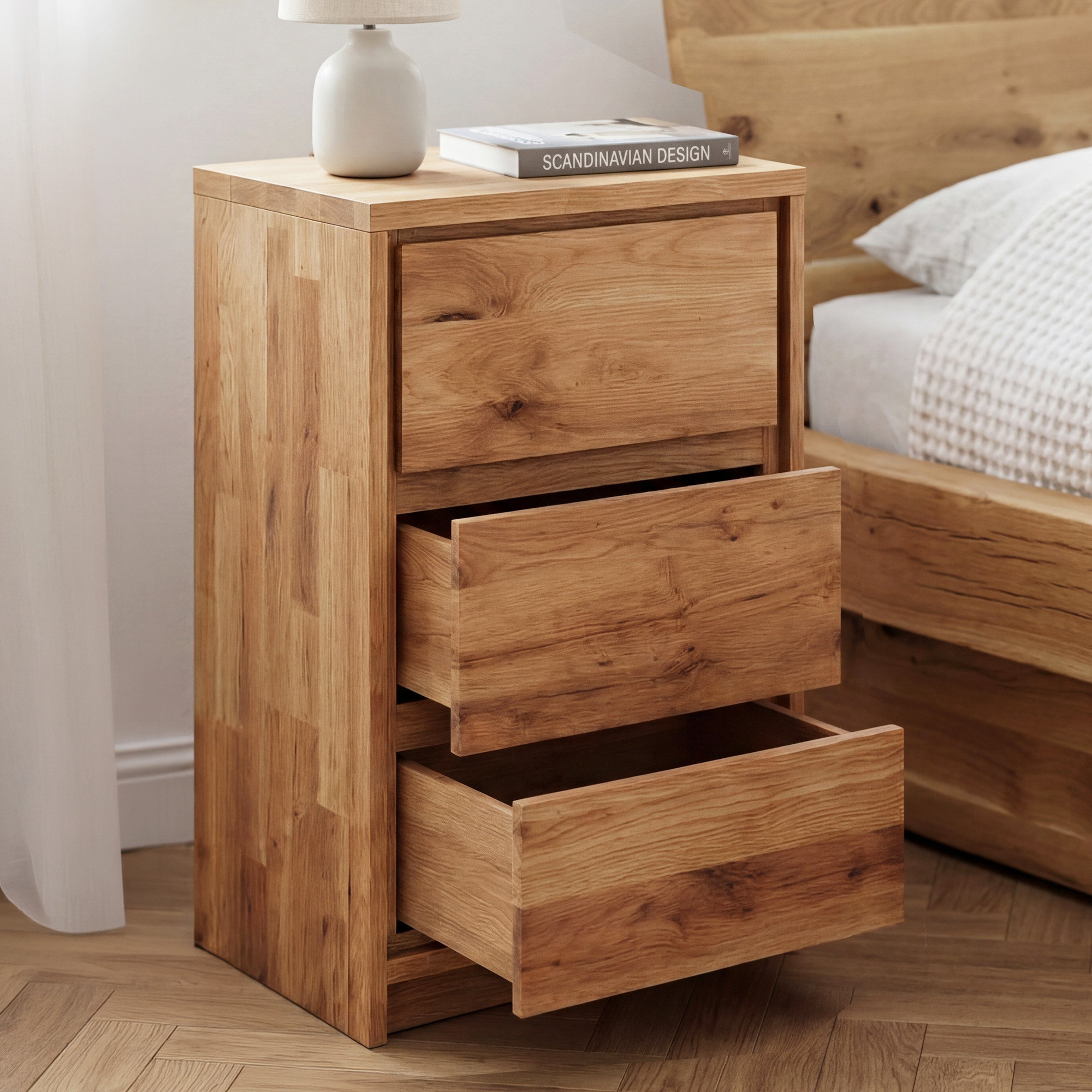 Vyšší nočný stolík Oregon s tromi zásuvkami prináša k vašej posteli nielen odkladaciu plochu, ale aj prekvapivo štedrý úložný priestor. Tri hlboké zásuvky pojmú knihy, nabíjačky, okuliare, lieky i ďalšie veci, ktoré chcete mať v noci poruke. Stolík je celý vyrobený z masívneho divokého dubu s typickými výraznými sukami a dekoratívnymi trhlinami, vďaka ktorým je každý kus úplným originálom. Všetky tri zásuvky sú vybavené systémom soft-close, takže ani nočné otváranie či zatváranie nenaruší pokojný spánok vášho partnera.