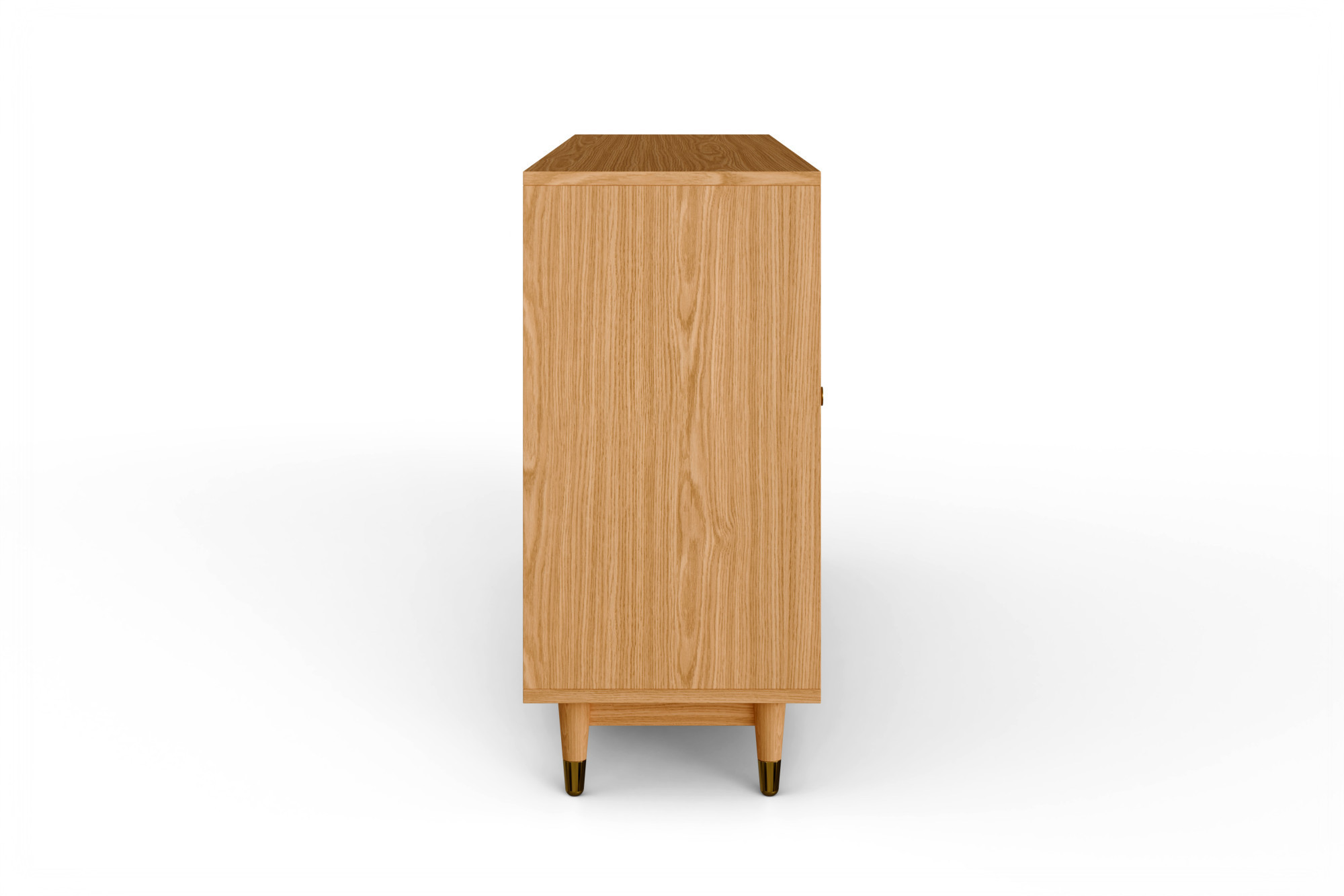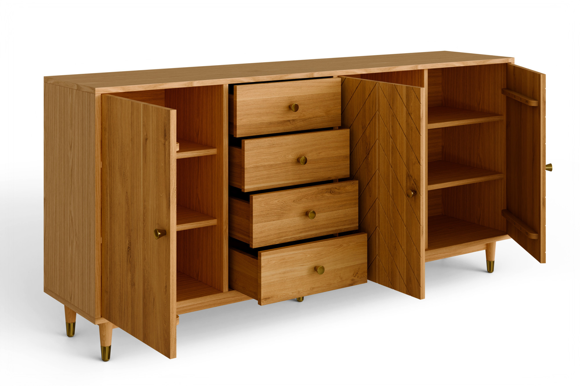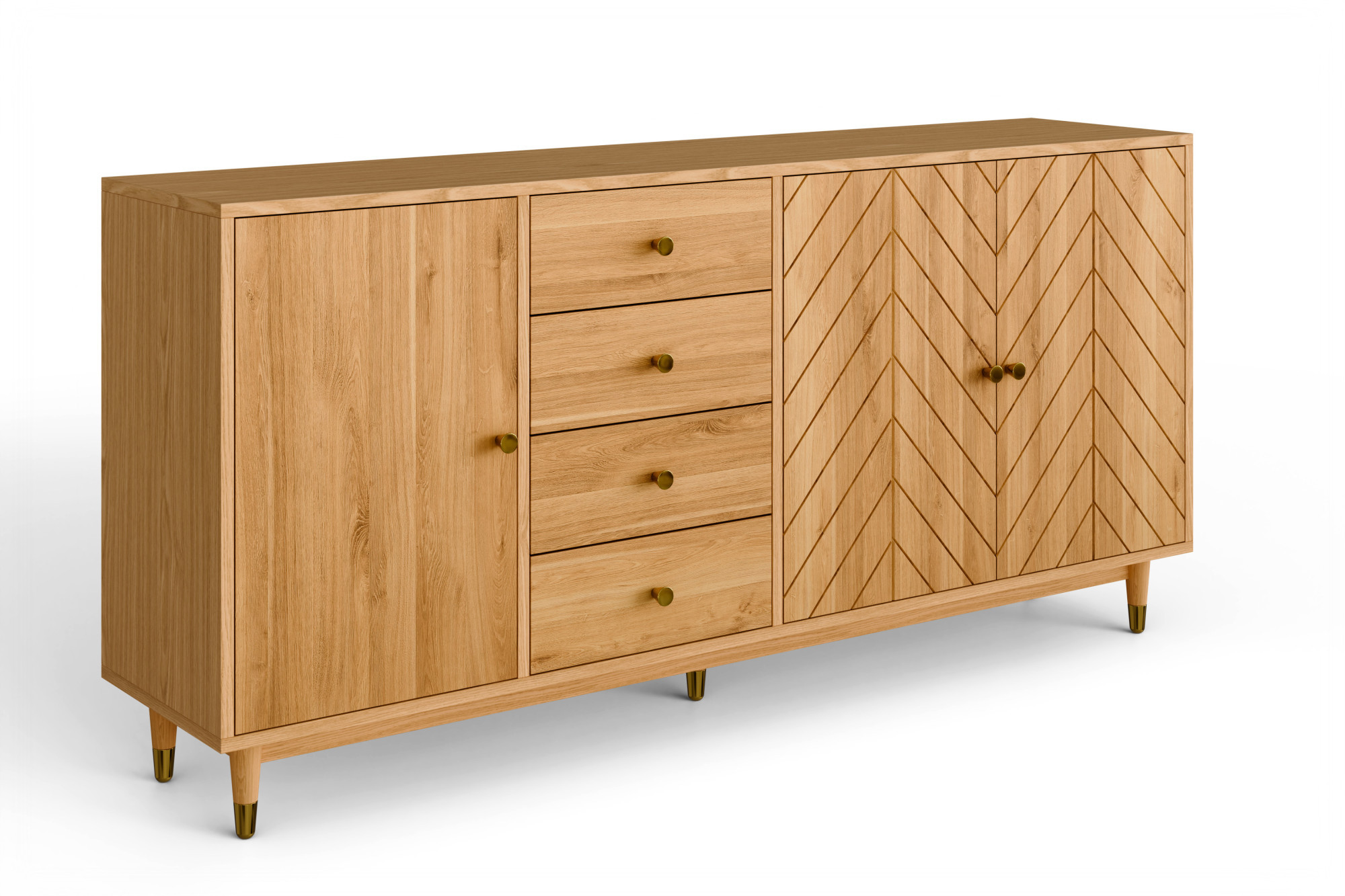 Hľadáte masívnu dubovú komodu, ktorá spojí prírodné materiály, nadčasový dizajn a praktické úložné riešenie? Komoda Jessica so šírkou 190 cm zaujme na prvý pohľad výrazným frézovaným vzorom rybej kosti na pravých dvierkach, ktorý dodáva nábytku luxusný a originálny vzhľad. Predná časť, nohy i oporná lišta sú vyrobené z masívneho dubu, zatiaľ čo horná doska a boky sú potiahnuté dubovou dyhou. Všetky drevené prvky sú ošetrené bezfarebným olejovoskom, ktorý chráni povrch a zároveň necháva vyniknúť prirodzenú kresbu dubového dreva. Vďaka svojmu prevedeniu sa táto dubová komoda do obývacej izby hodí do moderných, škandinávskych i elegantných interiérov.