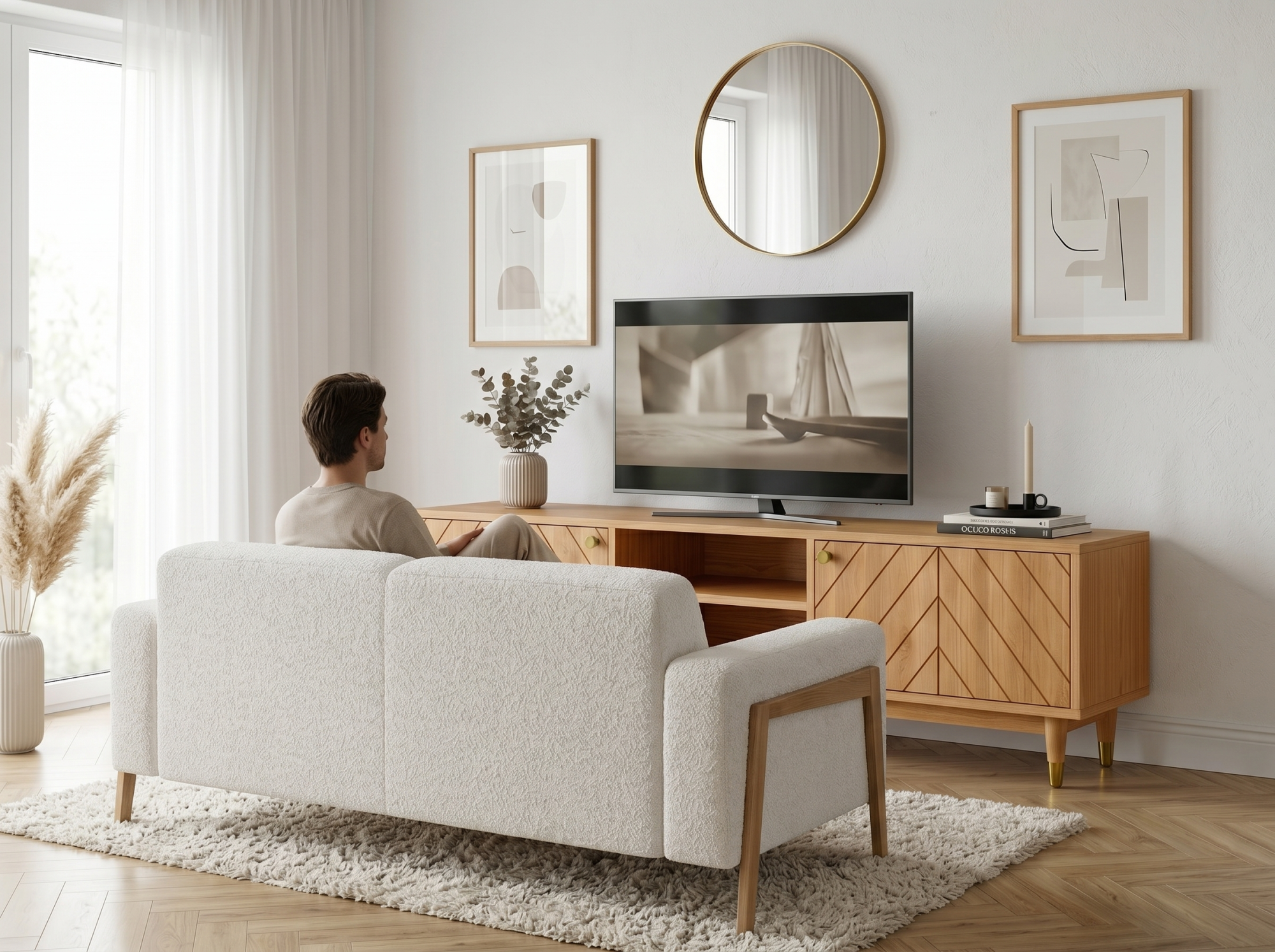 Pre bežnú údržbu odporúčame nábytok utierať suchou mäkkou handričkou. Približne 1–2x ročne je vhodné povrch ošetriť olejom určeným na drevený nábytok. Podrobný návod nájdete tu. - Má komoda dostatok priestoru pre elektroniku a príslušenstvo?