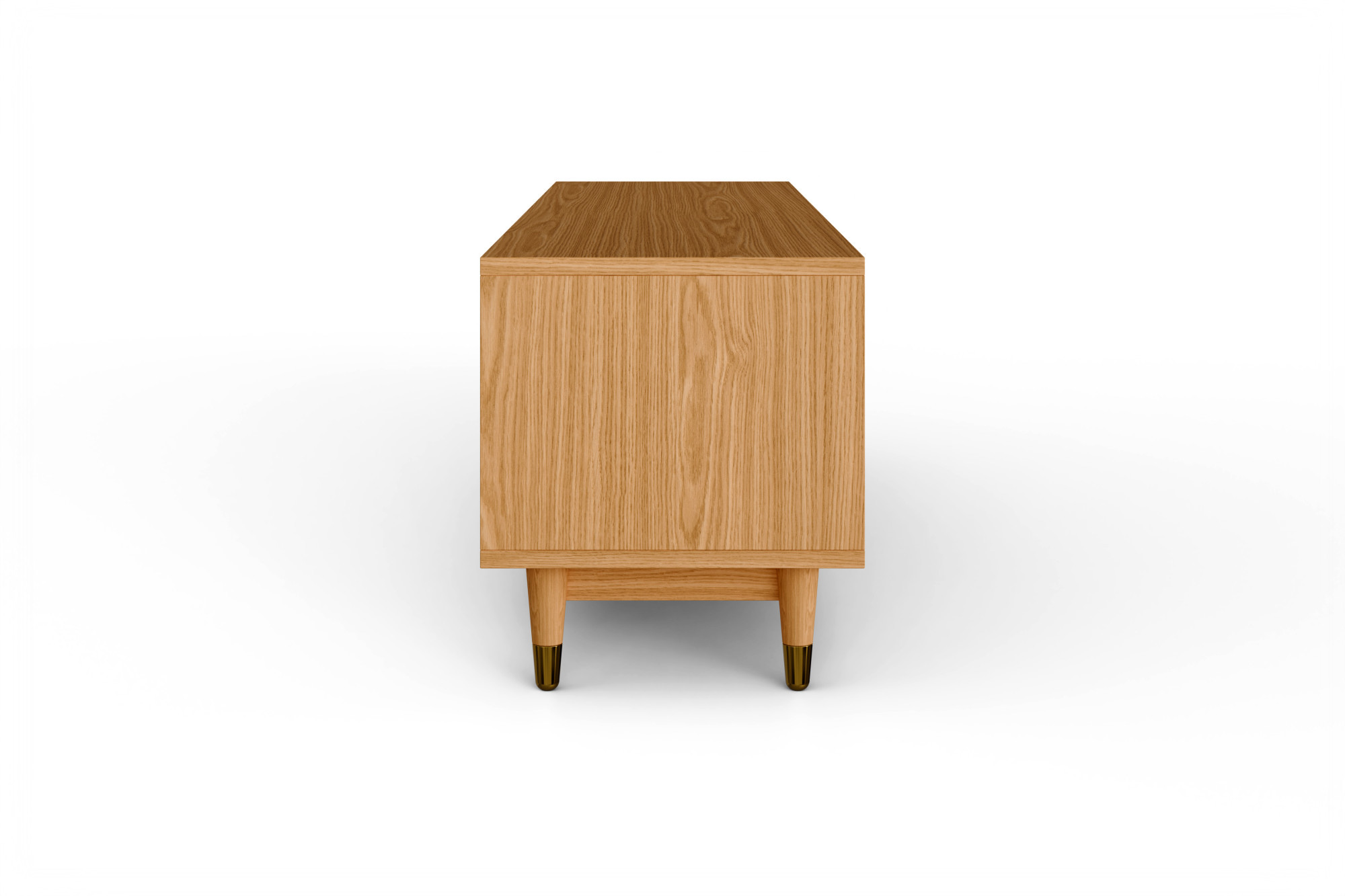 Hľadáte elegantnú a praktickú TV komodu z prírodného dreva, ktorá zaujme dizajnom aj kvalitou spracovania? Masívna TV komoda Jessica o šírke 179 cm je ideálnou voľbou do obývacej izby, kde vynikne jej frézovaný vzor rybej kosti na dvierkach i elegantné zlaté detaily. Čelá, nohy a podporná lišta sú vyrobené z masívneho dubu, zatiaľ čo viditeľná polica, horná doska a boky sú pokryté kvalitnou dyhou. Vďaka tomu získavate dubovú TV komodu, ktorá spája prírodný vzhľad, pevnosť a priaznivejšiu cenu priamo od výrobcu. Bezfarebný olejovosk navyše zvýrazňuje kresbu dreva a chráni povrch pri každodennom používaní.
