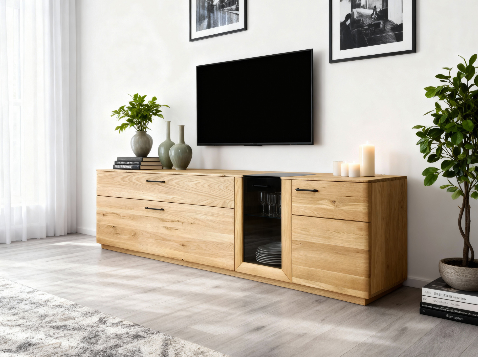 Televízna komoda je vybavená dvomi dvierkami, zásuvkou a výklopnými dvierkami s presklenou časťou, čo zaručuje dostatočný úložný priestor pre všetko príslušenstvo. Nástenný panel so stredovou časťou a dvomi policami ideálne dopĺňa zostavu a poskytuje miesto pre dekorácie, knihy či fotografie. Kolekcia Bosco prináša moderný nábytok z masívneho dubu s typickými jemne zaoblenými hranami, vďaka ktorým pôsobí luxusne a elegantne. Všetky kúsky sú dodávané plne zmontované. Povrch je ošetrený olejom v odtieni dub natural, ktorý zvýrazňuje prirodzenú kresbu dreva.