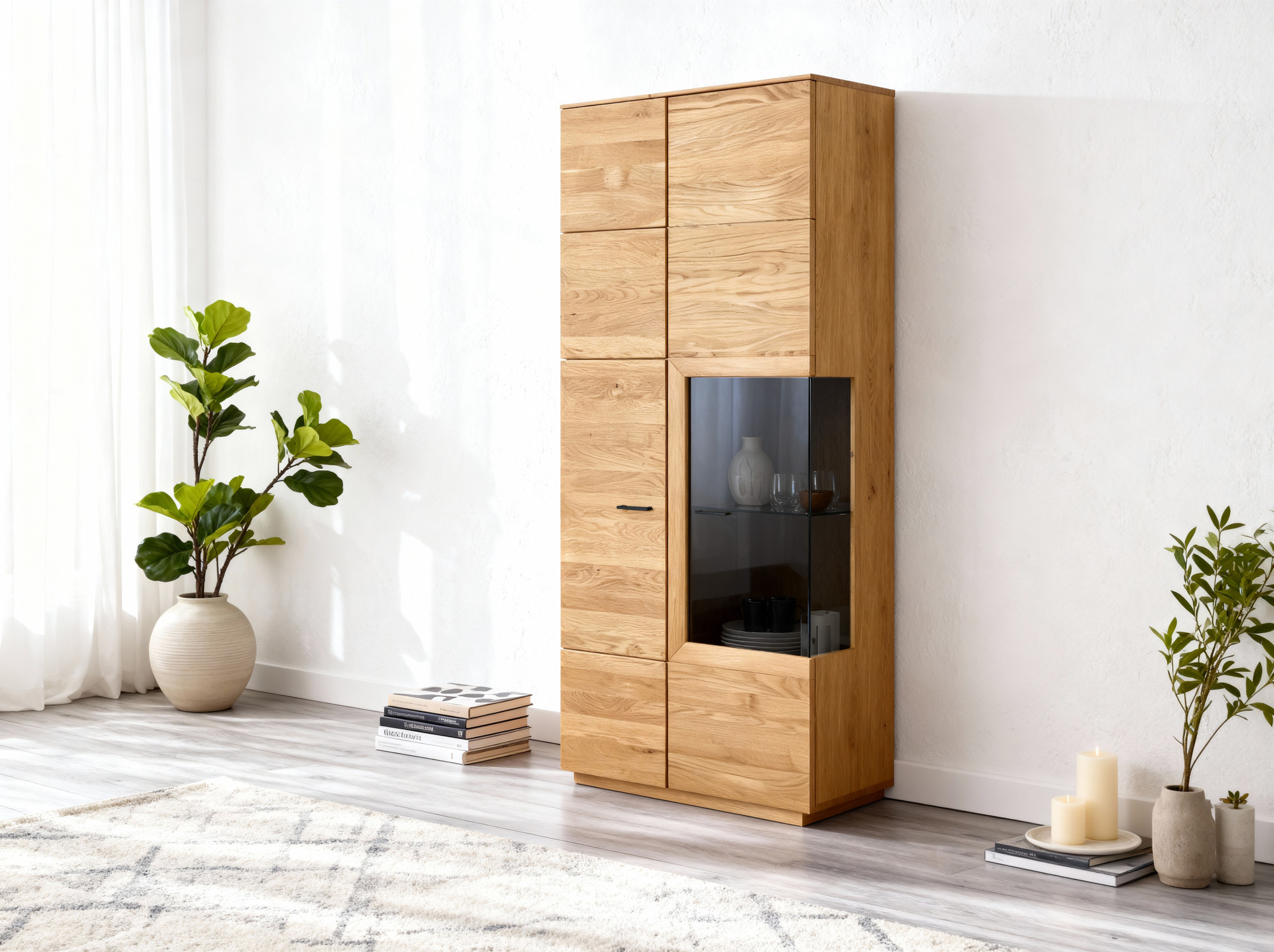 - Vitrína: výška 211 cm, šírka 91 cm – 2 dvierka (1× presklené), sklenená + drevené police