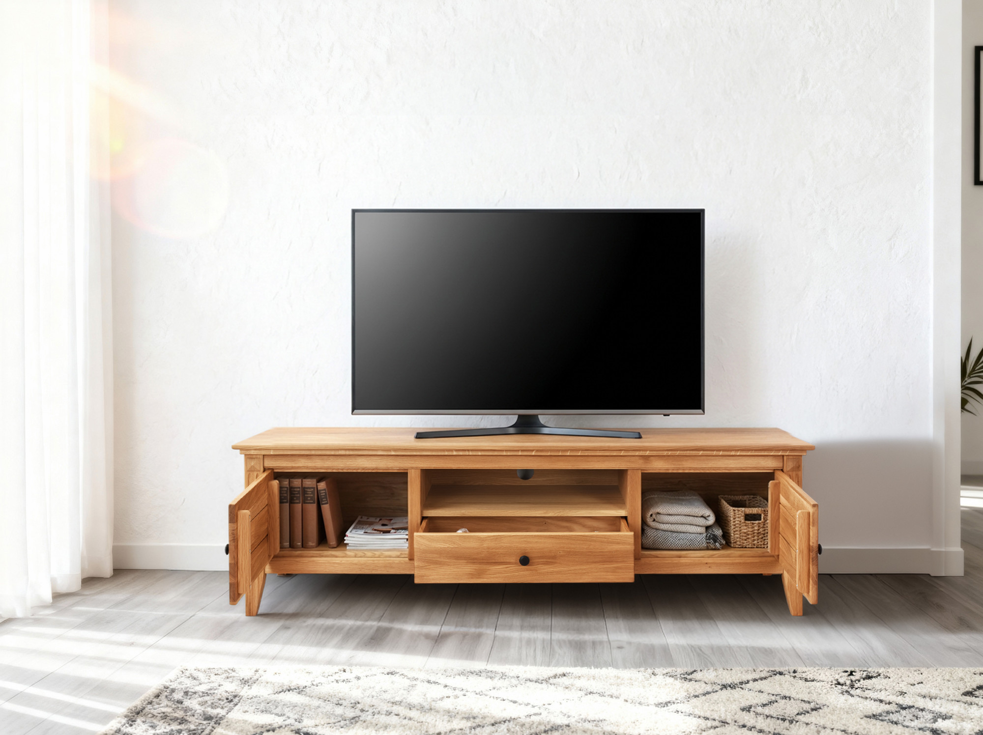 - Rozmery TV komody: 160 × 55 × 47 cm (š × v × h) – 2 dvierka, 1 zásuvka, otvorený priestor