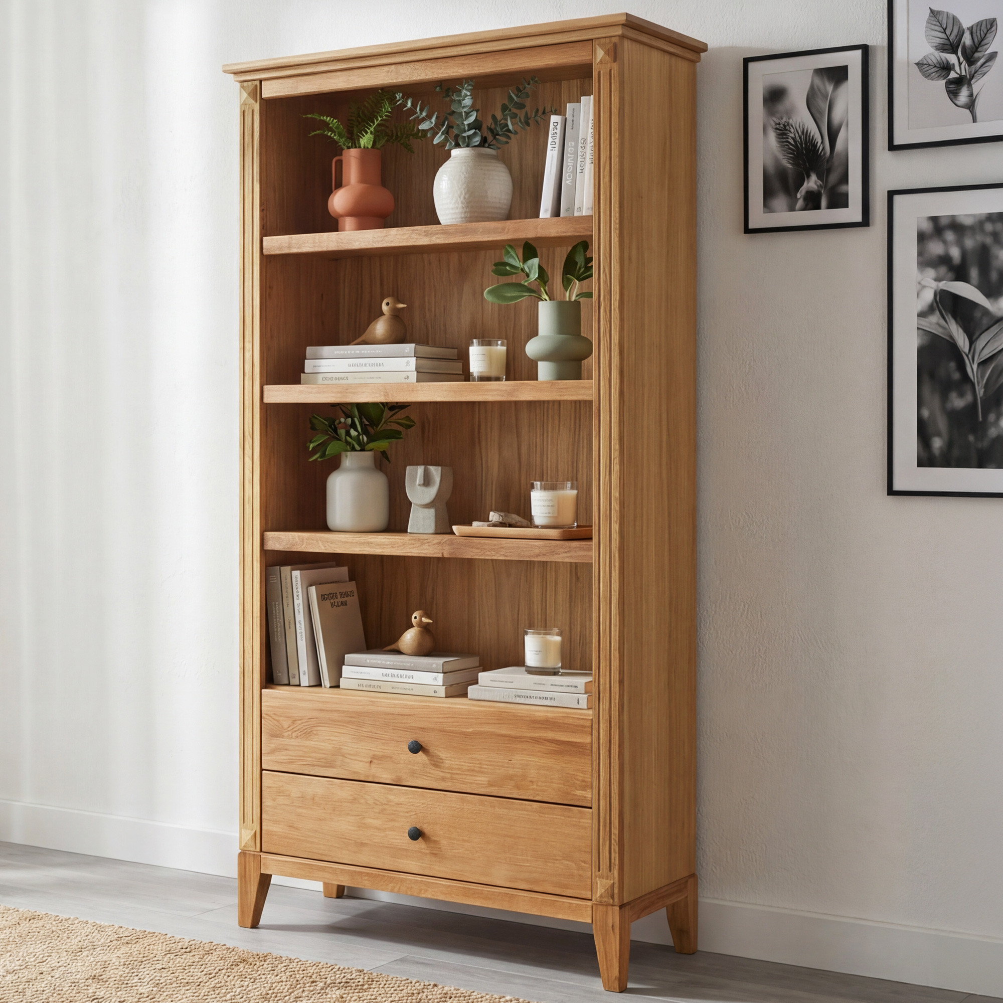 Dubový regál z kolekcie Gaja so rovnakými impozantnými rozmermi 100 × 195 × 42 cm ponúka 3 otvorené police na knihy, dekorácie či rastliny a 2 praktické zásuvky na veci, ktoré chcete mať skryté. Celá sústava nábytku do obývacej izby je vyrobená z masívneho dubového dreva (predné dvierka, vrchné dosky, nožičky) a kvalitnej dubovej dyhy (boky, korpus). Povrch je ošetrený dánskym olejom Livos pre dlhú životnosť. Jemné frézovanie na čelnej strane dotvára rustikálny severský dizajn v čistých líniách. Nábytok je vybavený systémom soft-close pre tiché zatváranie.