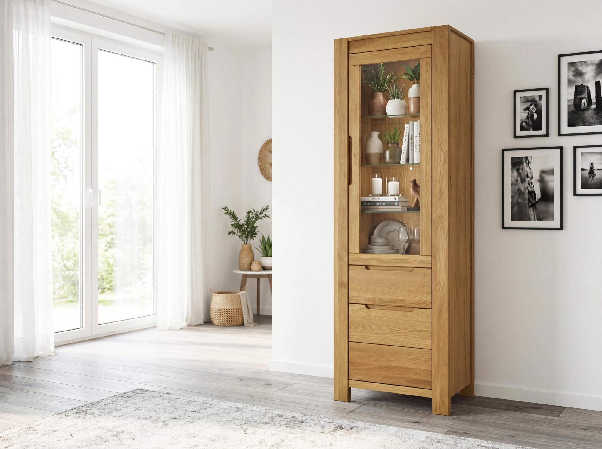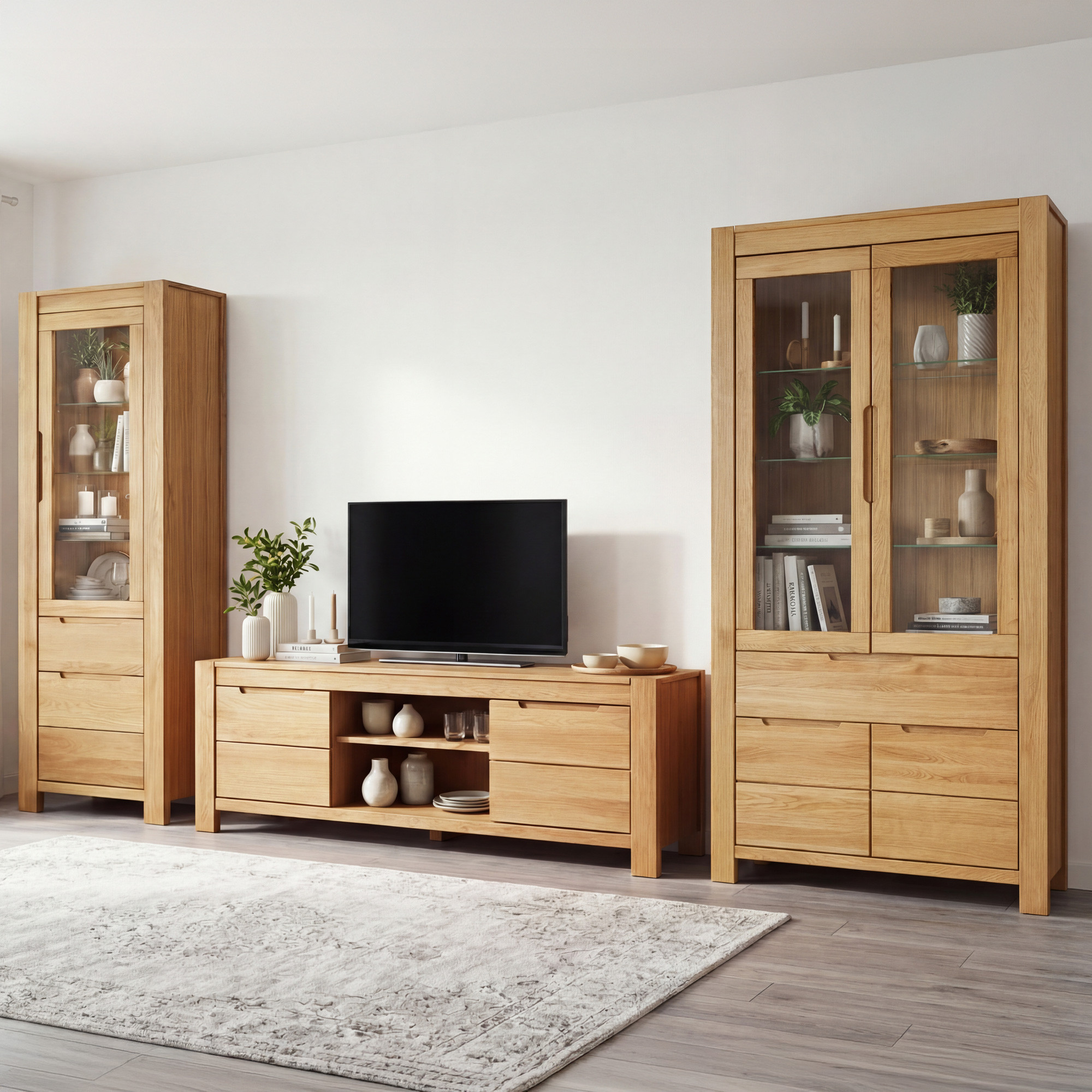 Jednodverová vitrína (š. 60 × v. 190 × h. 40 cm) disponuje hornou presklenou časťou s vnútornou sklenenou poličkou pre vystavenie krištáľu či keramiky; spodnú časť tvoria plné drevené dvierka s úložným priestorom. Dvojkrídlová vitrína (š. 104 × v. 190 × h. 40 cm) ponúka priestrannú presklenú sekciu so tromi sklenenými poličkami, praktický stredový šuplík a spodný dvojdverový úložný priestor s vnútornou poličkou. TV komoda (š. 160 × v. 58 × h. 40 cm) kombinuje dva uzavreté oddiely s otvorenou poličkou pre soundbar či dekorácie. Zabudované úchytky nerušia čisté línie, soft-close na všetkých dvierkach i zásuvkách zabezpečuje tiché dovieranie. Použité drevo má FSC certifikát. Všetky kusy dodávame v demonte s prehľadným návodom – montáž zvládnete pohodlne doma.