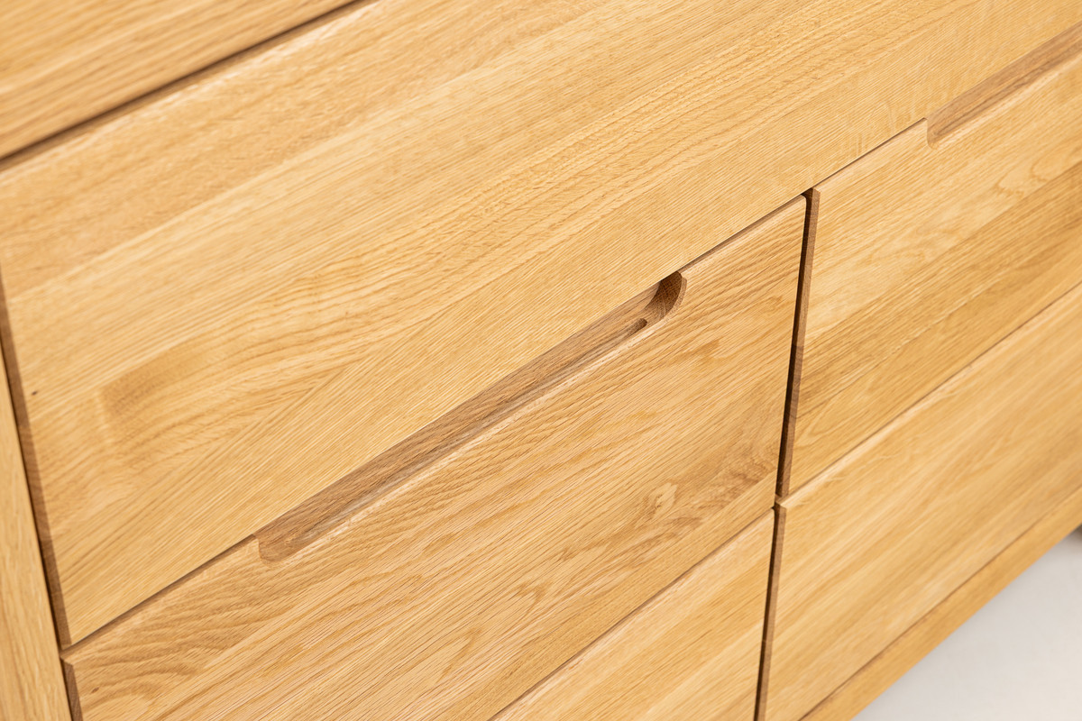 - Masívny dub (čelá, horné dosky, nohy) + kvalitná dubová dyha vo vnútri a na bokoch