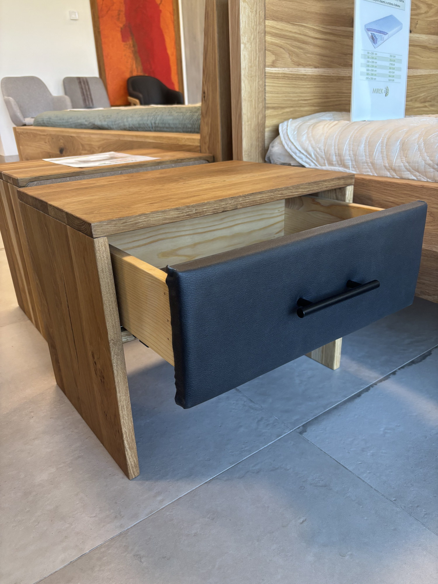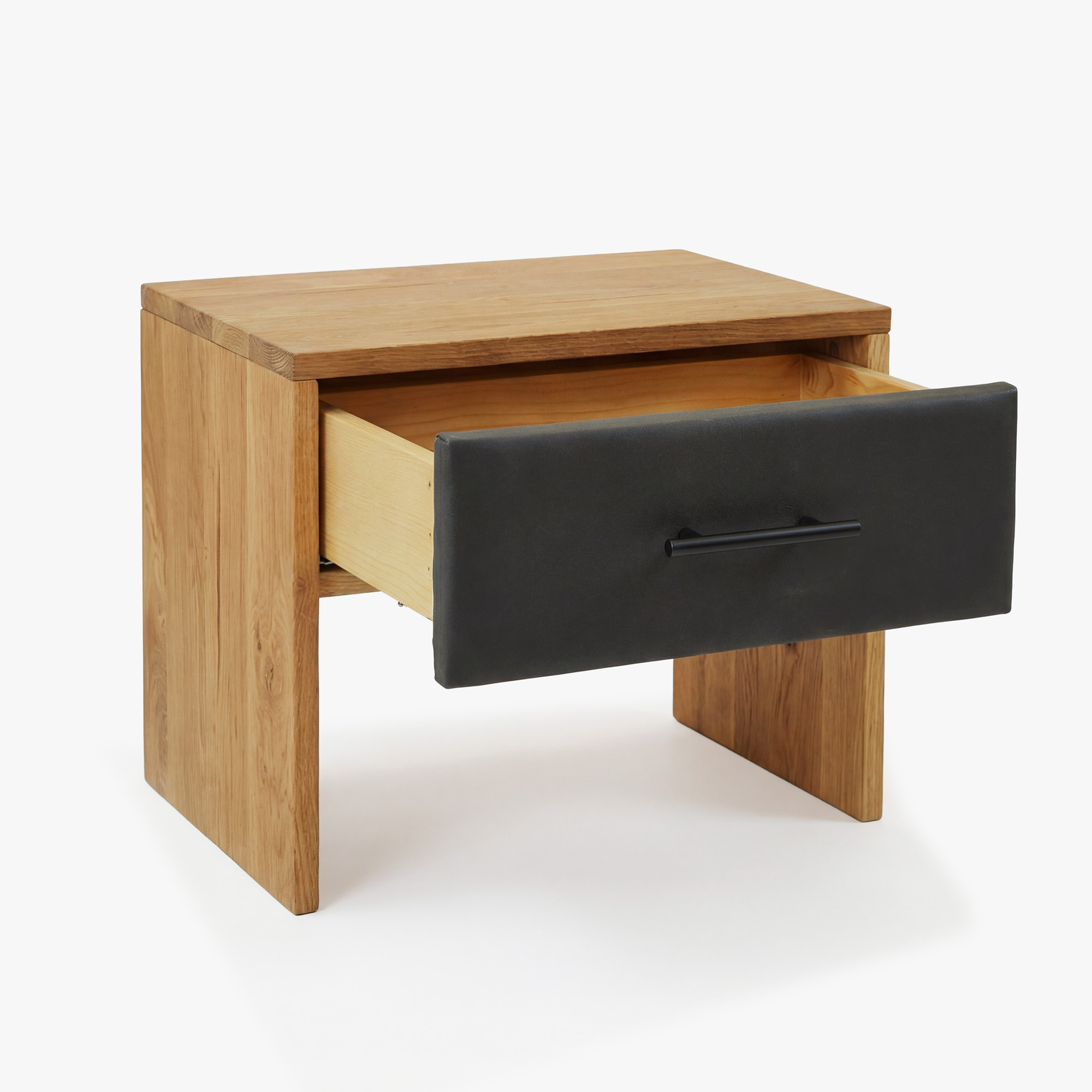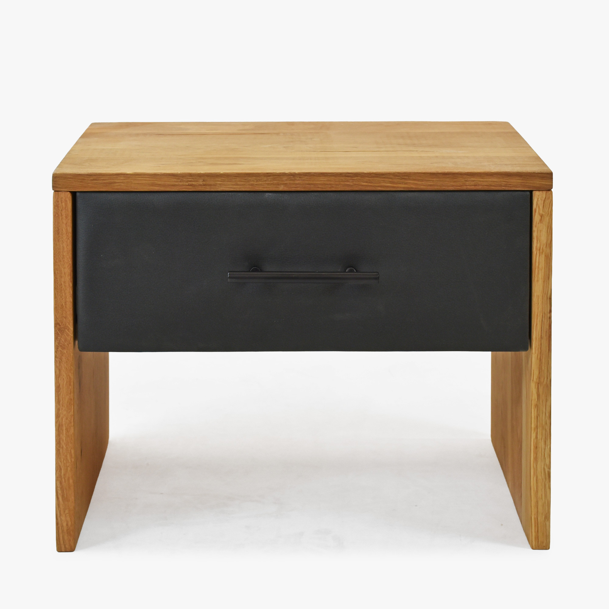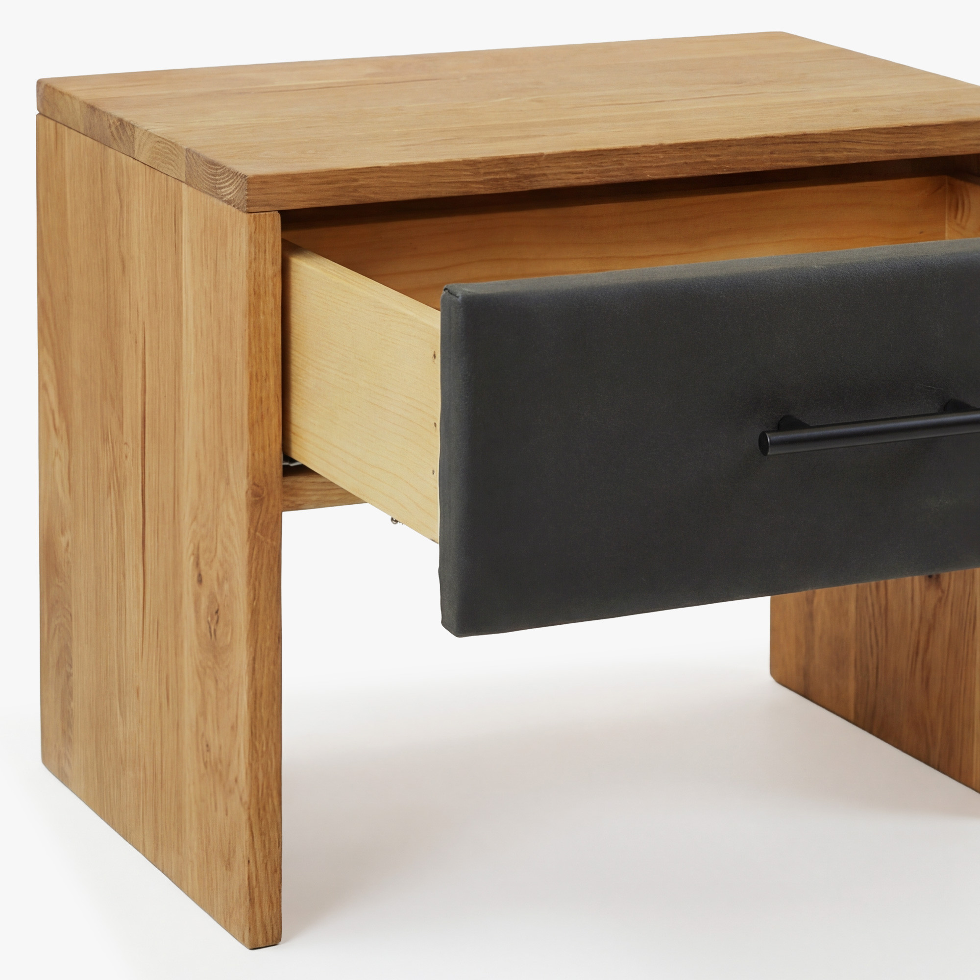 Nočný stolík je vybavený jednou zásuvkou so systémom soft-close, takže zatváranie je tiché, plynulé a komfortné pri každodennom používaní. Predná časť zásuvky je potiahnutá tmavou látkou s vzhľadom kože, ktorá dodáva stolíku modernejší a elegantný výraz. Praktické čierne madlo podčiarkuje celkový dizajn a uľahčuje pohodlné otváranie.