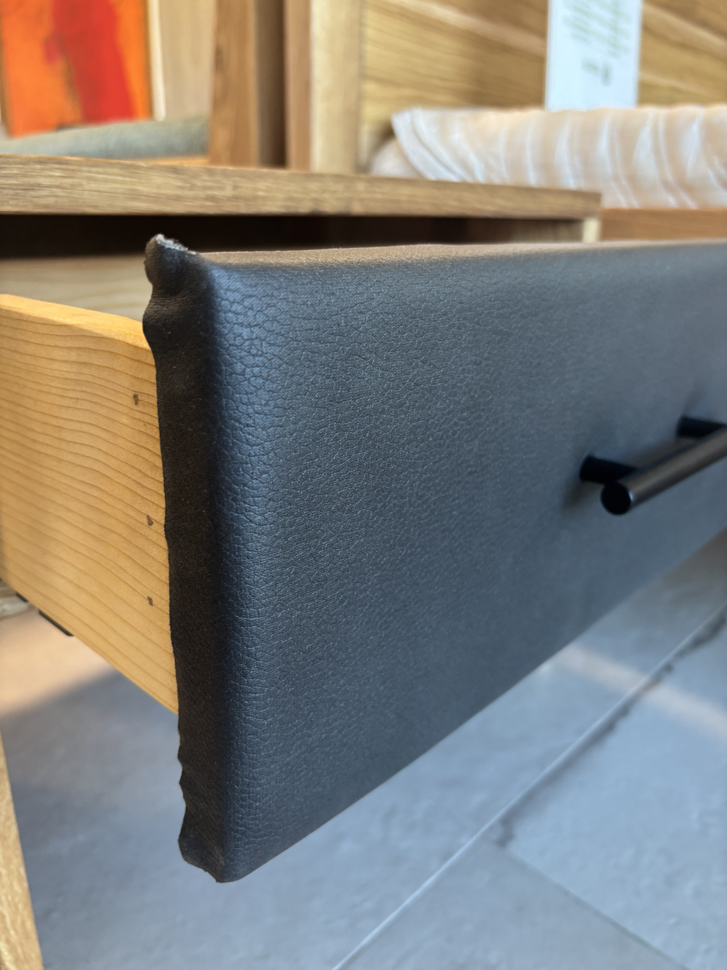 - Čelo zásuvky s tmavou látkou – elegantný detail s efektom kože