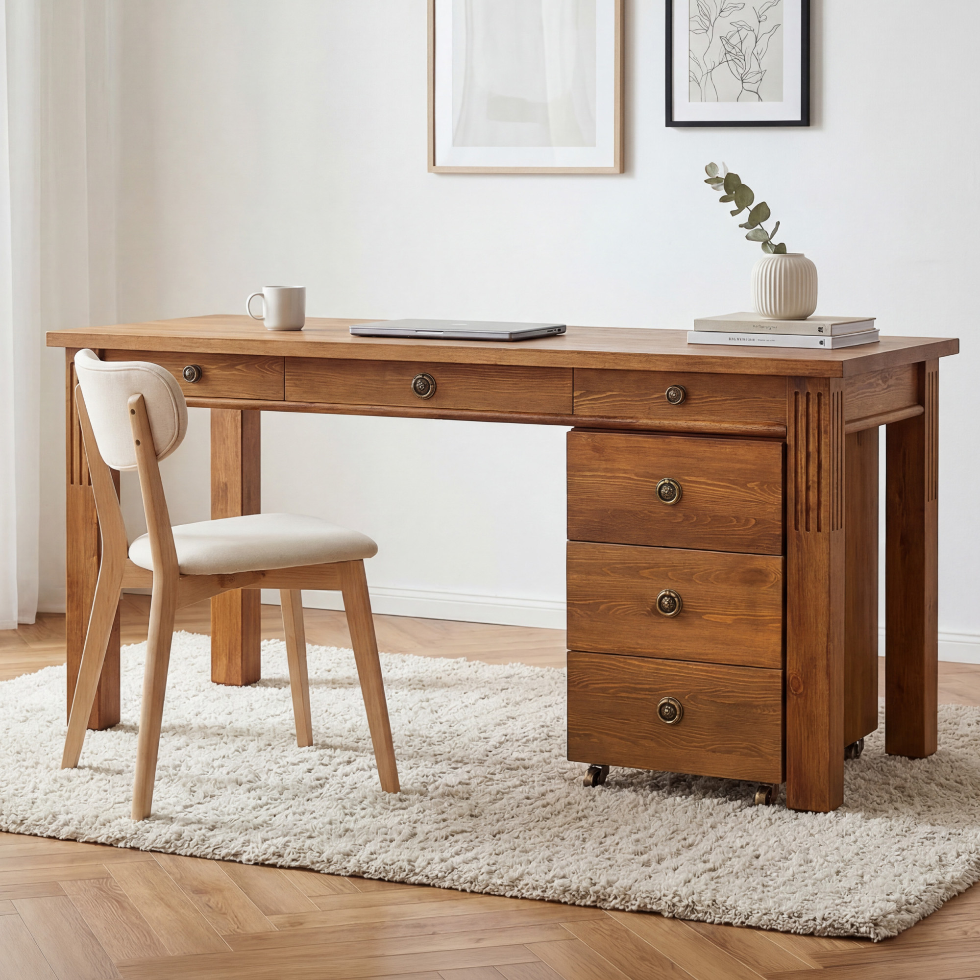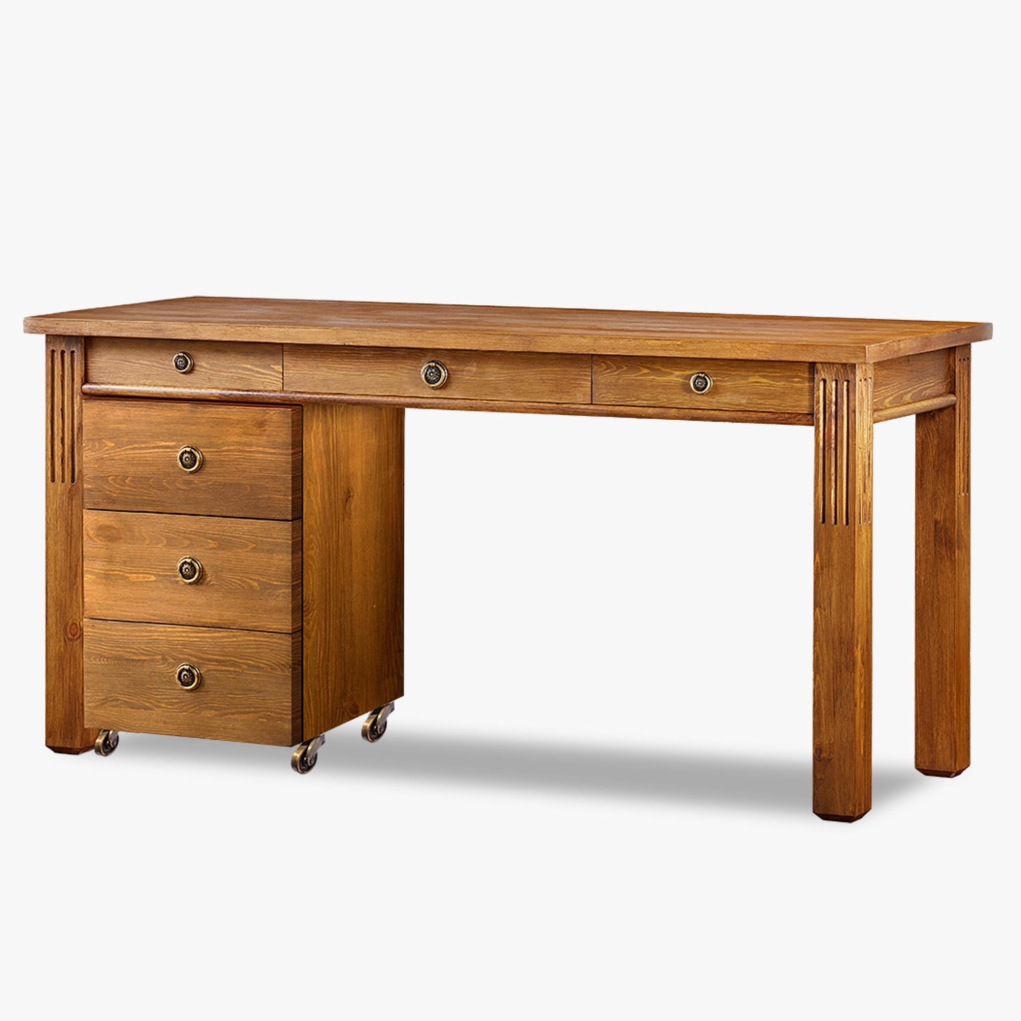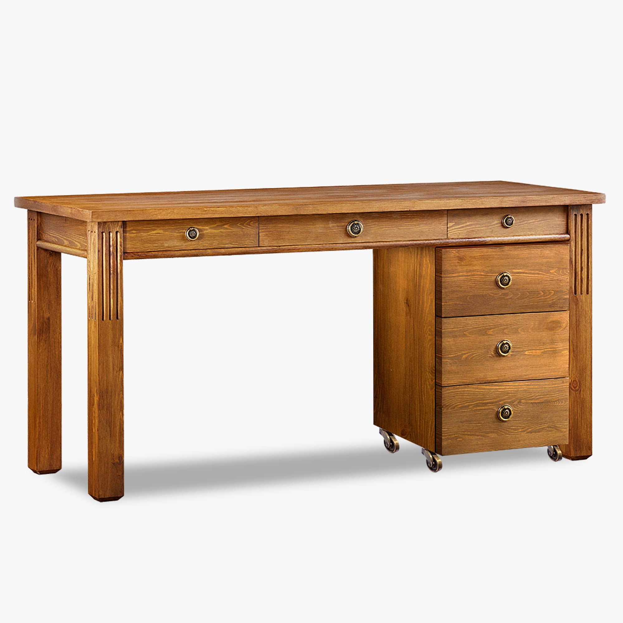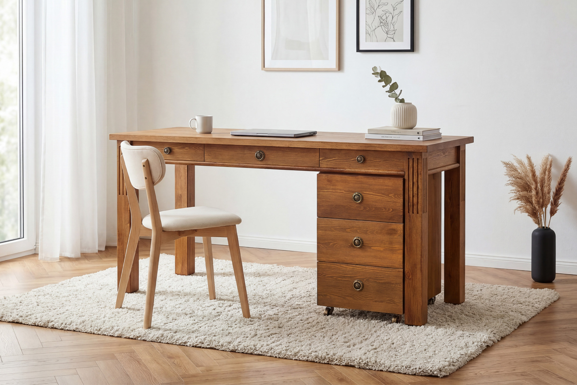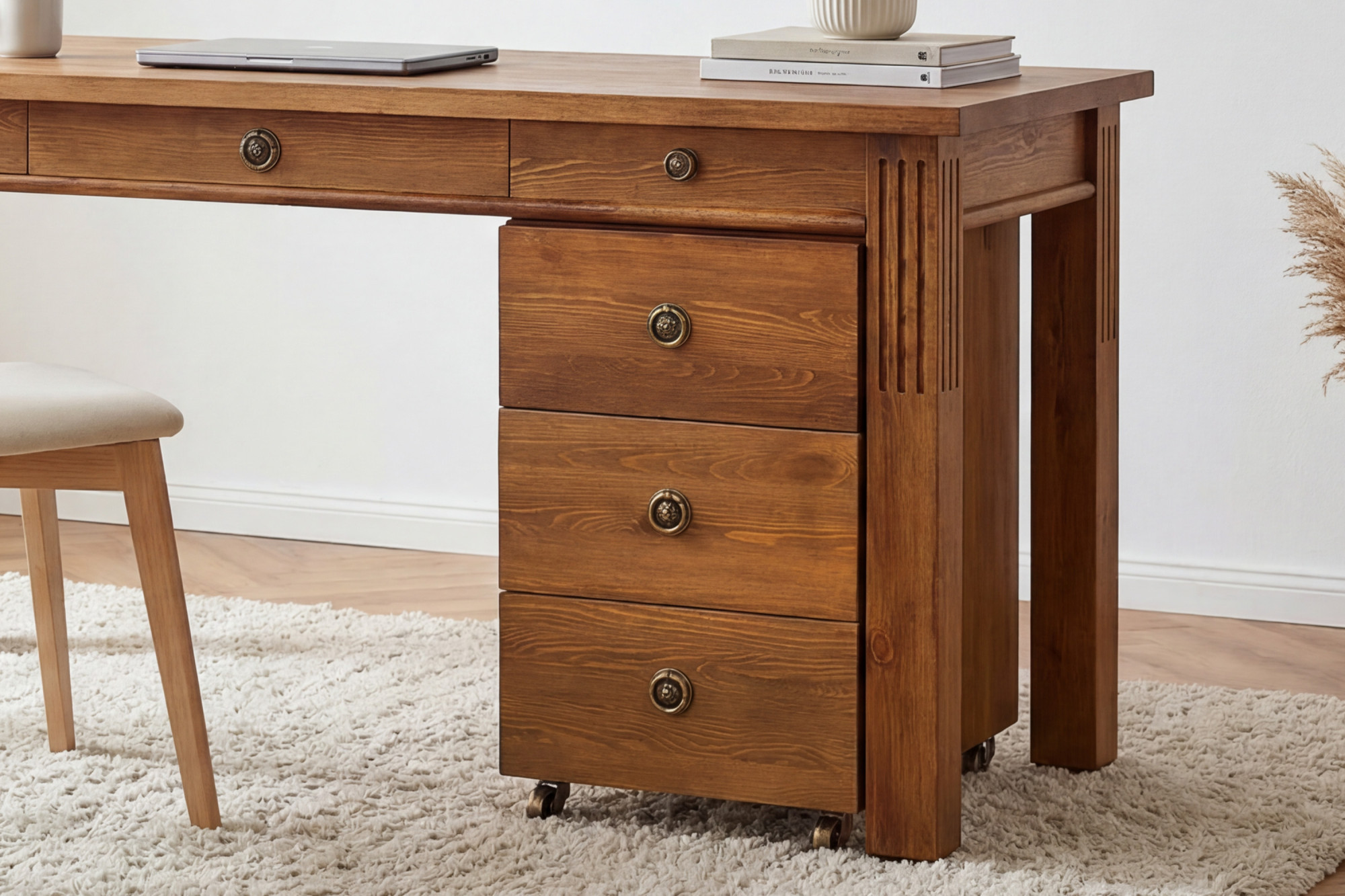 Stôl disponuje priestrannou pracovnou doskou o rozmeroch 160 × 60 cm, ktorá poskytuje dostatok miesta pre monitor, notebook, dokumenty i ďalšie kancelárske vybavenie. Praktickou súčasťou zostavy je aj komoda na kolieskach s troma zásuvkami, ktorú je možné podľa potreby umiestniť na ľavú alebo pravú stranu. Vďaka tomu si ľahko prispôsobíte usporiadanie stola svojmu interiéru i pracovným návykom. Konštrukcia z masívneho dreva zabezpečuje výbornú stabilitu, dlhú životnosť a vysokú odolnosť pri každodennom používaní.