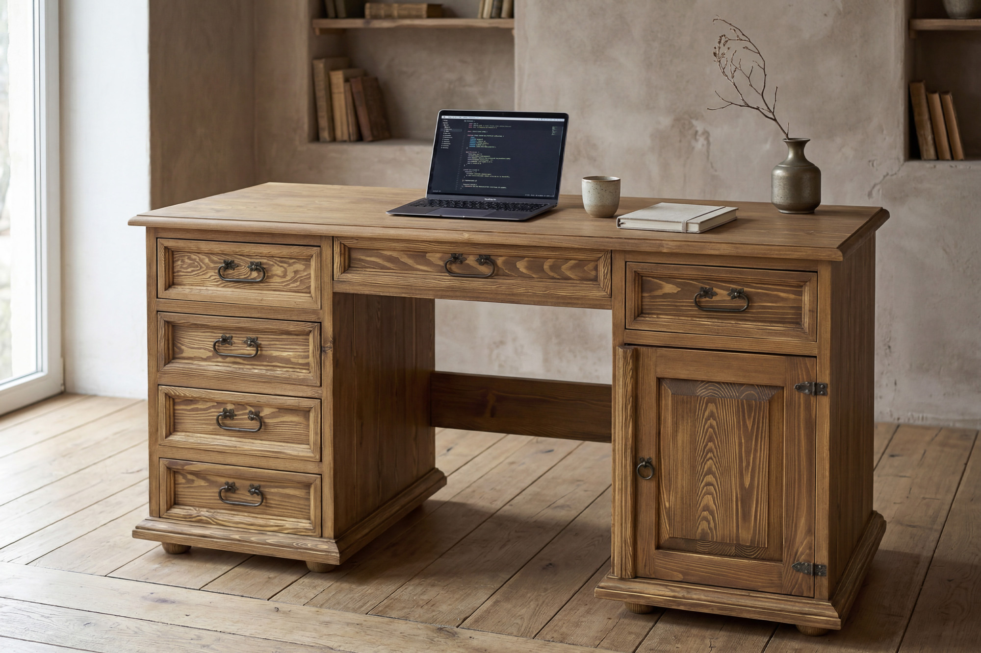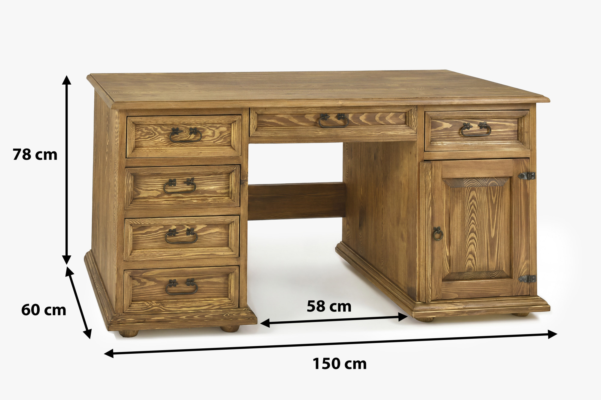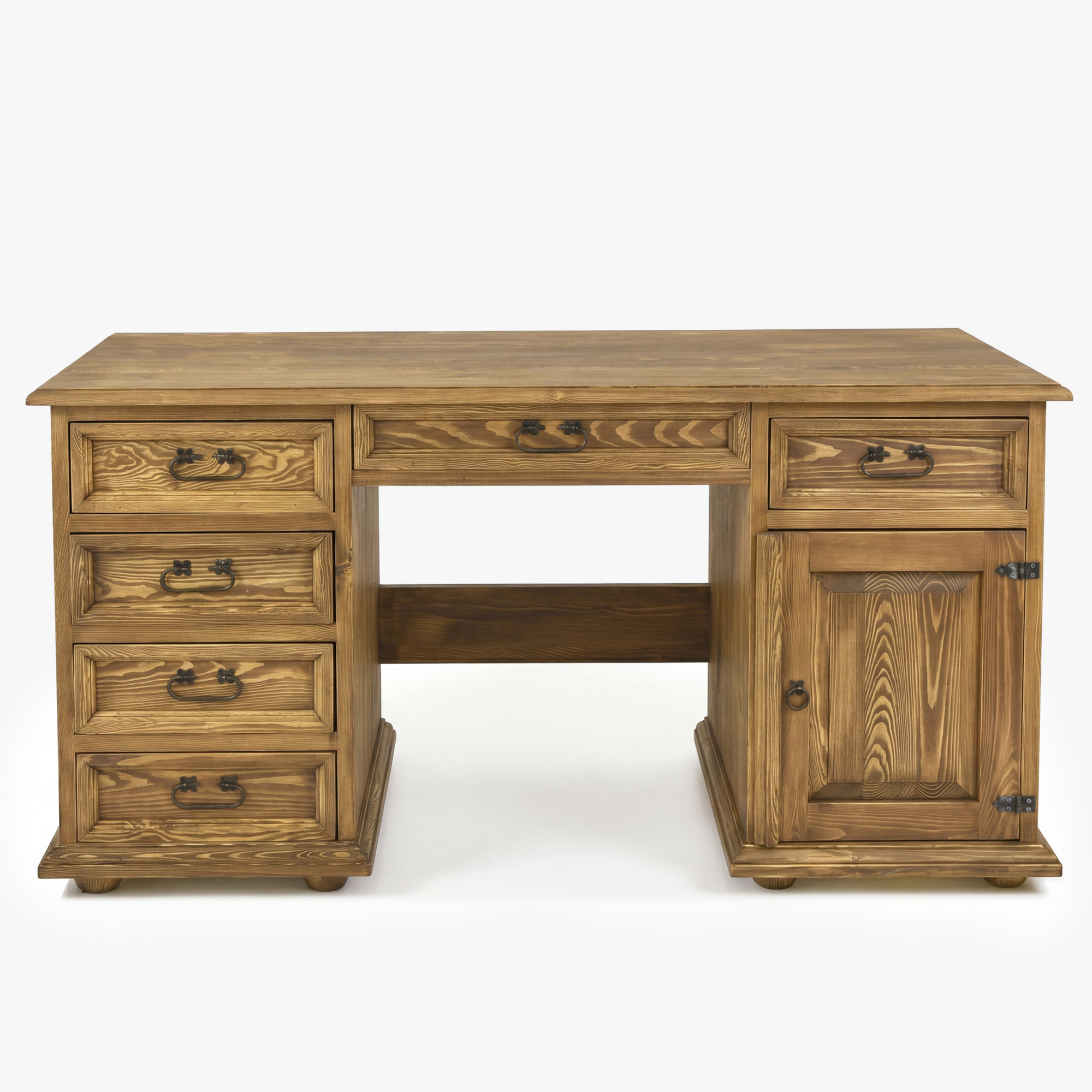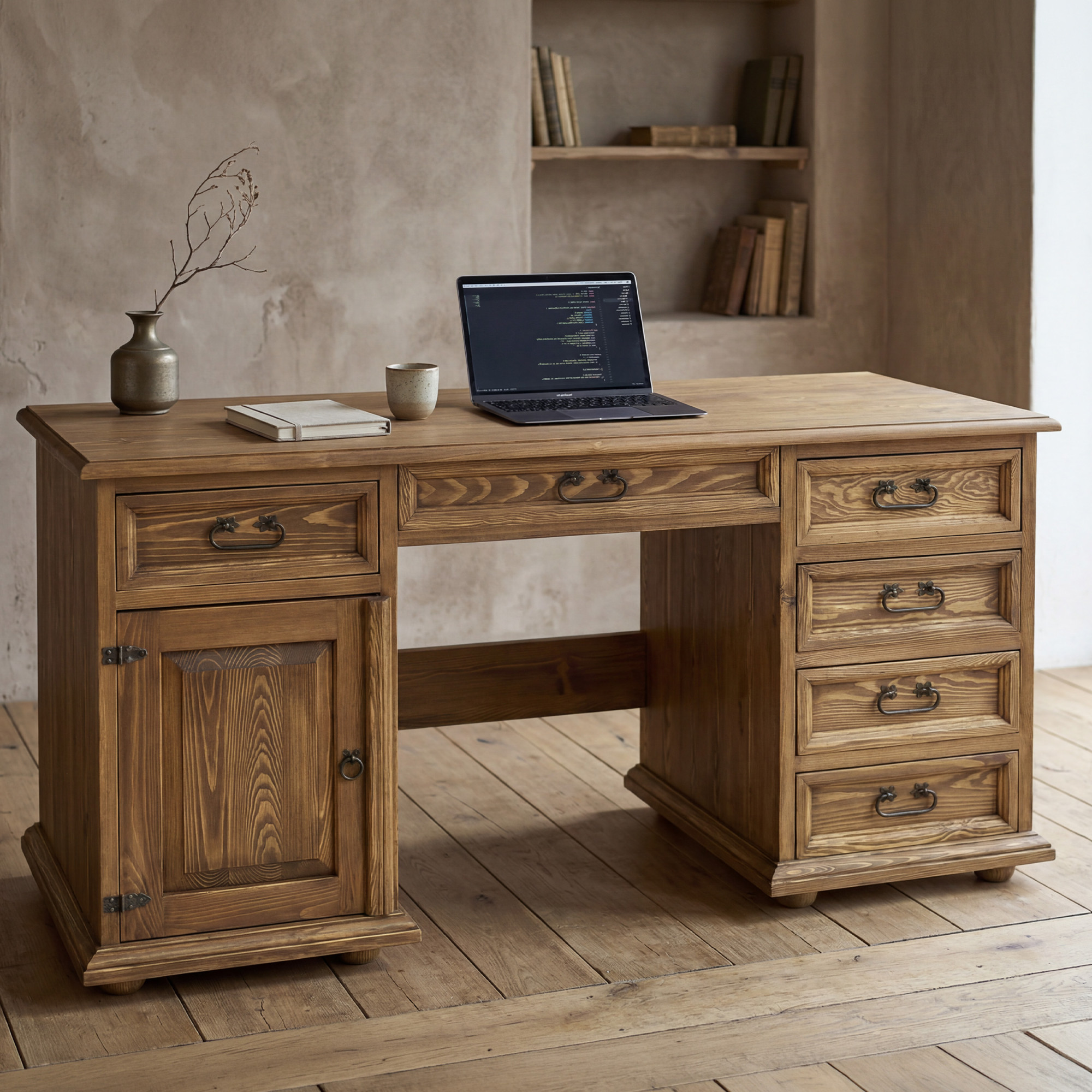 Tento písací stôl z masívu je skvelou voľbou pre každého, kto hľadá spojenie elegancie, poctivého materiálu a funkčnosti. Veľkorysá pracovná doska o šírke 150 cm ponúka dostatok priestoru pre počítač, lampu, písacie potreby i každodennú prácu z domu. Vďaka kombinácii zásuviek, skrinky a stredovej zásuvky budete mať všetko prehľadne usporiadané a stále na dosah. Rustikálne prevedenie s voskovaným povrchom navyše dodáva nábytku autentický charakter a príjemný prírodný vzhľad.