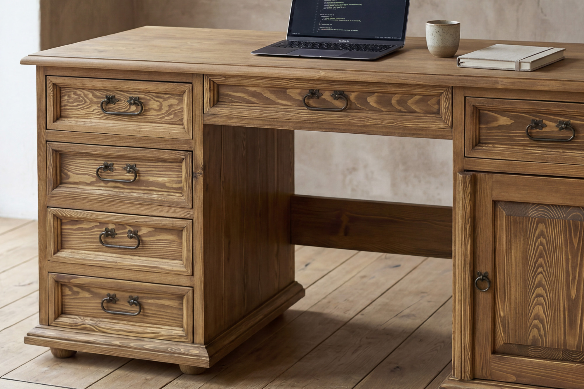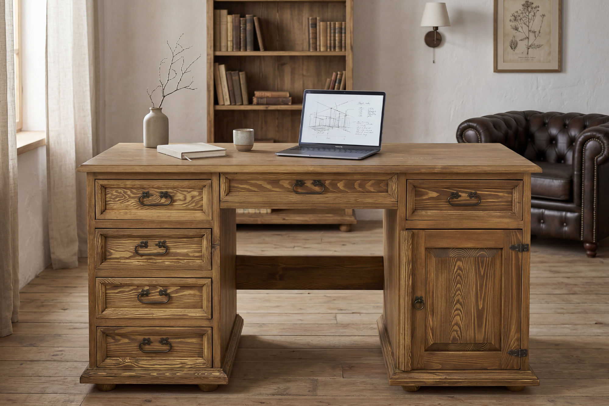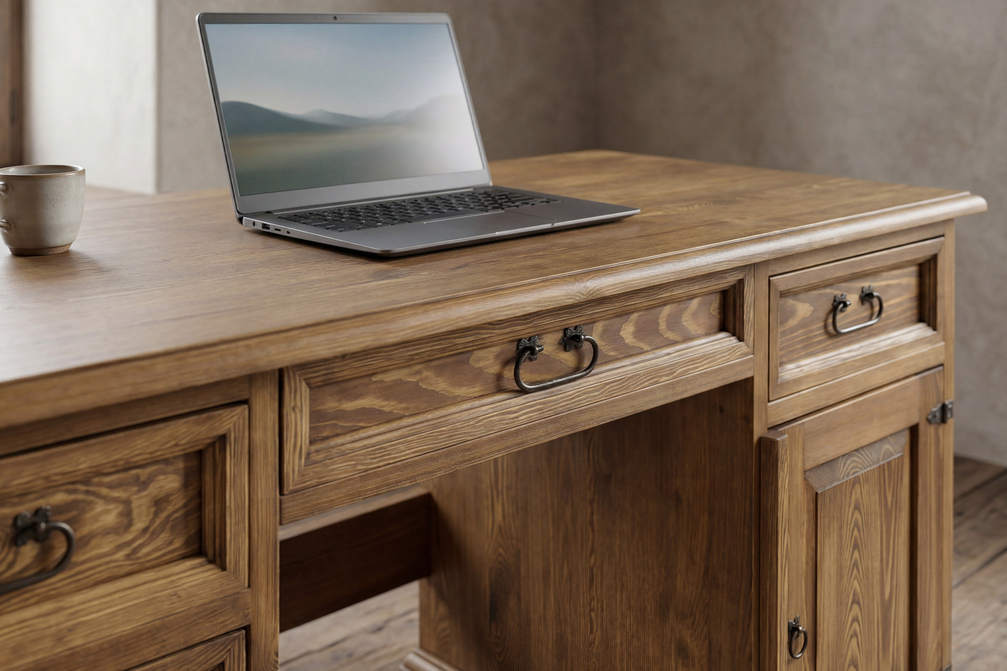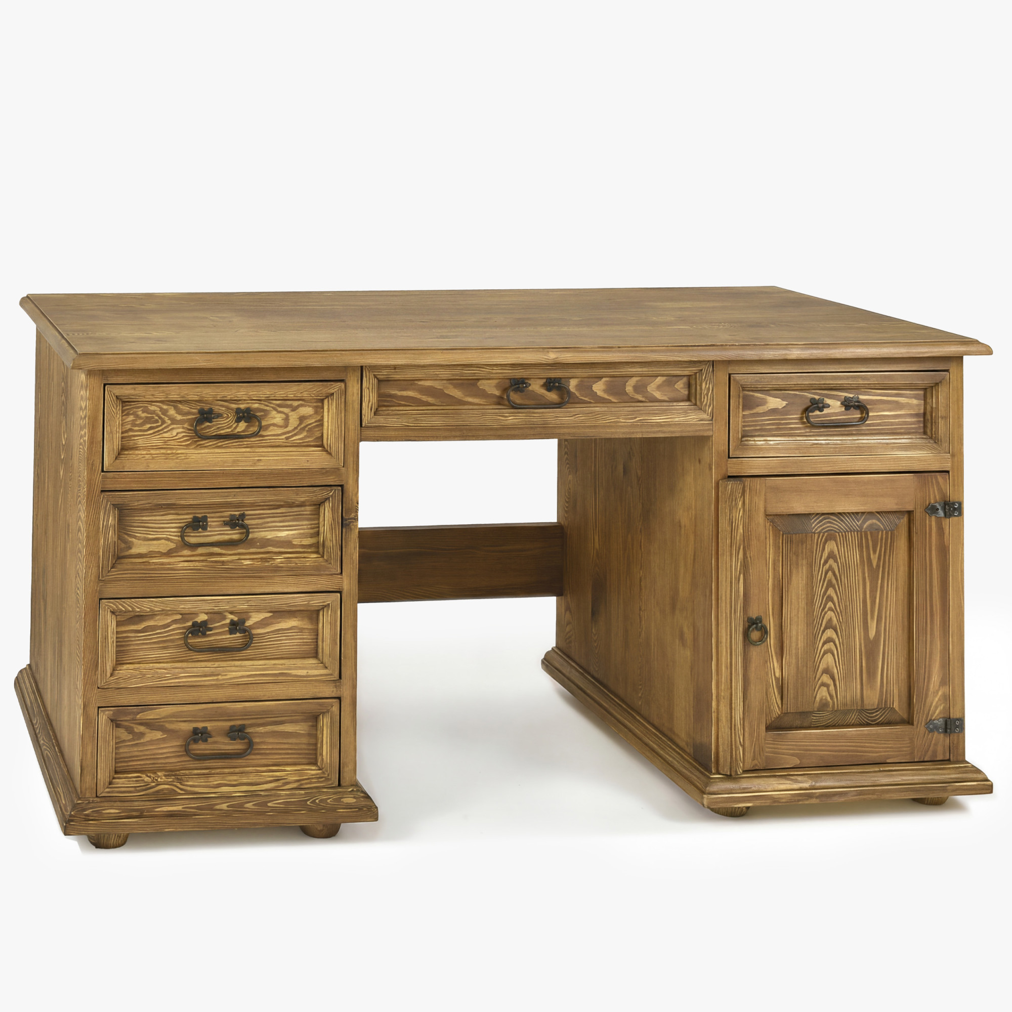 Tento písací stôl z masívu je skvelou voľbou pre každého, kto hľadá spojenie elegancie, poctivého materiálu a funkčnosti. Veľkorysá pracovná doska o šírke 150 cm ponúka dostatok priestoru pre počítač, lampu, písacie potreby i každodennú prácu z domu. Vďaka kombinácii zásuviek, skrinky a stredovej zásuvky budete mať všetko prehľadne usporiadané a stále na dosah. Rustikálne prevedenie s voskovaným povrchom navyše dodáva nábytku autentický charakter a príjemný prírodný vzhľad.