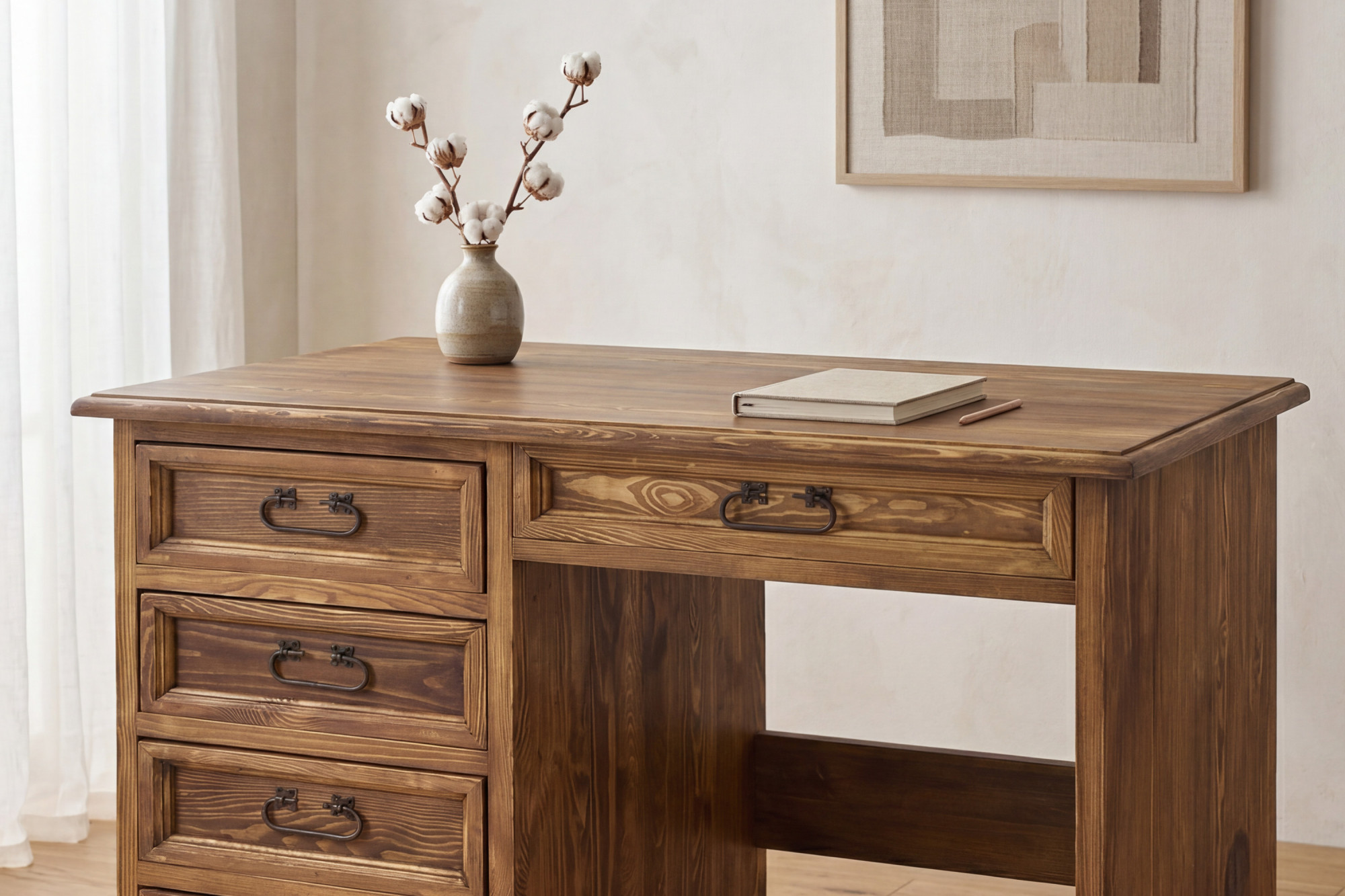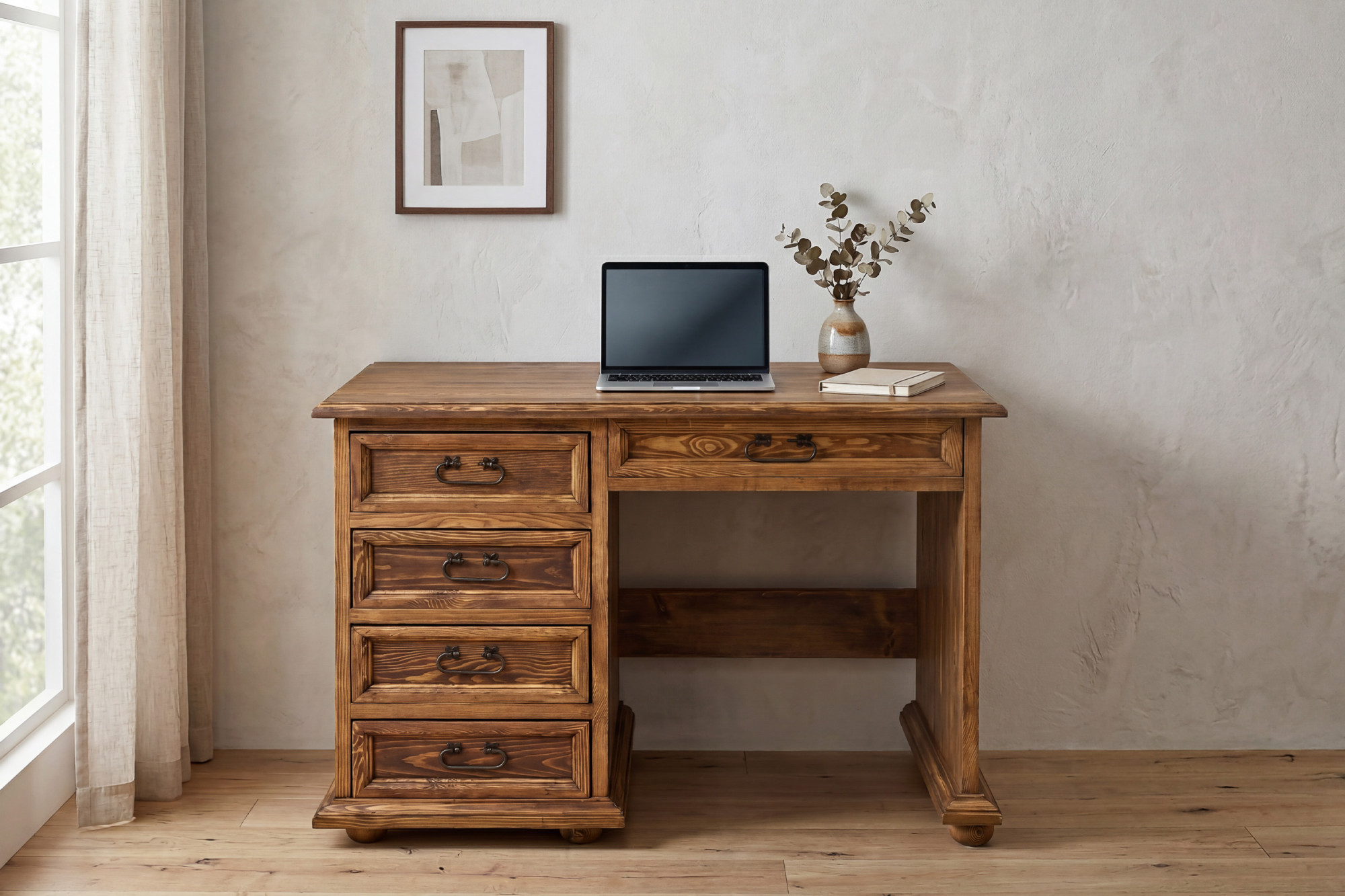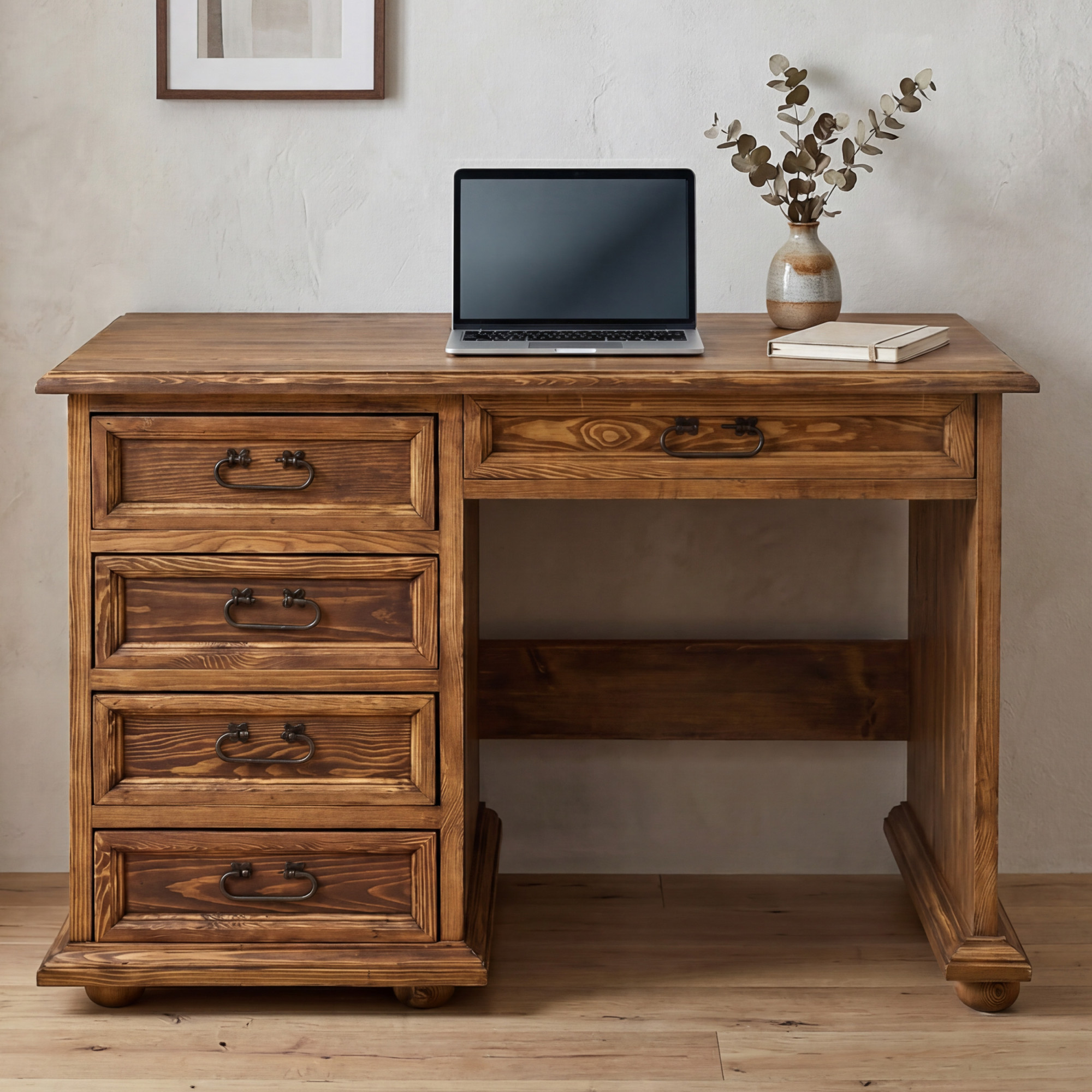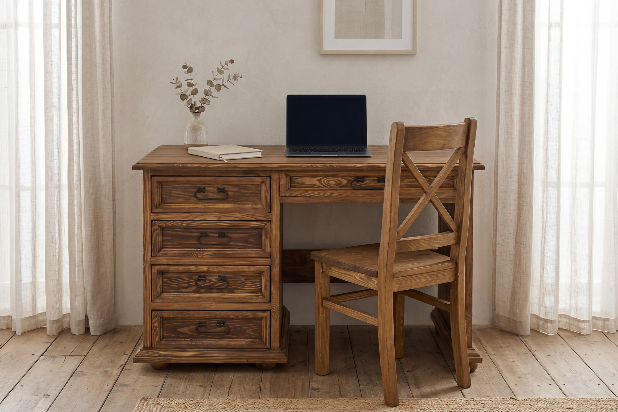 Hľadáte rustikálny pracovný stôl z masívu, ktorý vniesie do interiéru útulnosť, eleganciu a poctivé remeselné spracovanie? Tento pracovný stôl vo francúzskom štýle zo série Venkov je ideálnou voľbou do domácej pracovne, spálne, kancelárie aj štýlovo zariadeného obývacieho priestoru. Stôl zaujme nielen svojim romantickým vzhľadom inšpirovaným tradičným vidieckym bývaním, ale aj praktickým usporiadaním, vďaka ktorému budete mať všetko dôležité vždy po ruke.