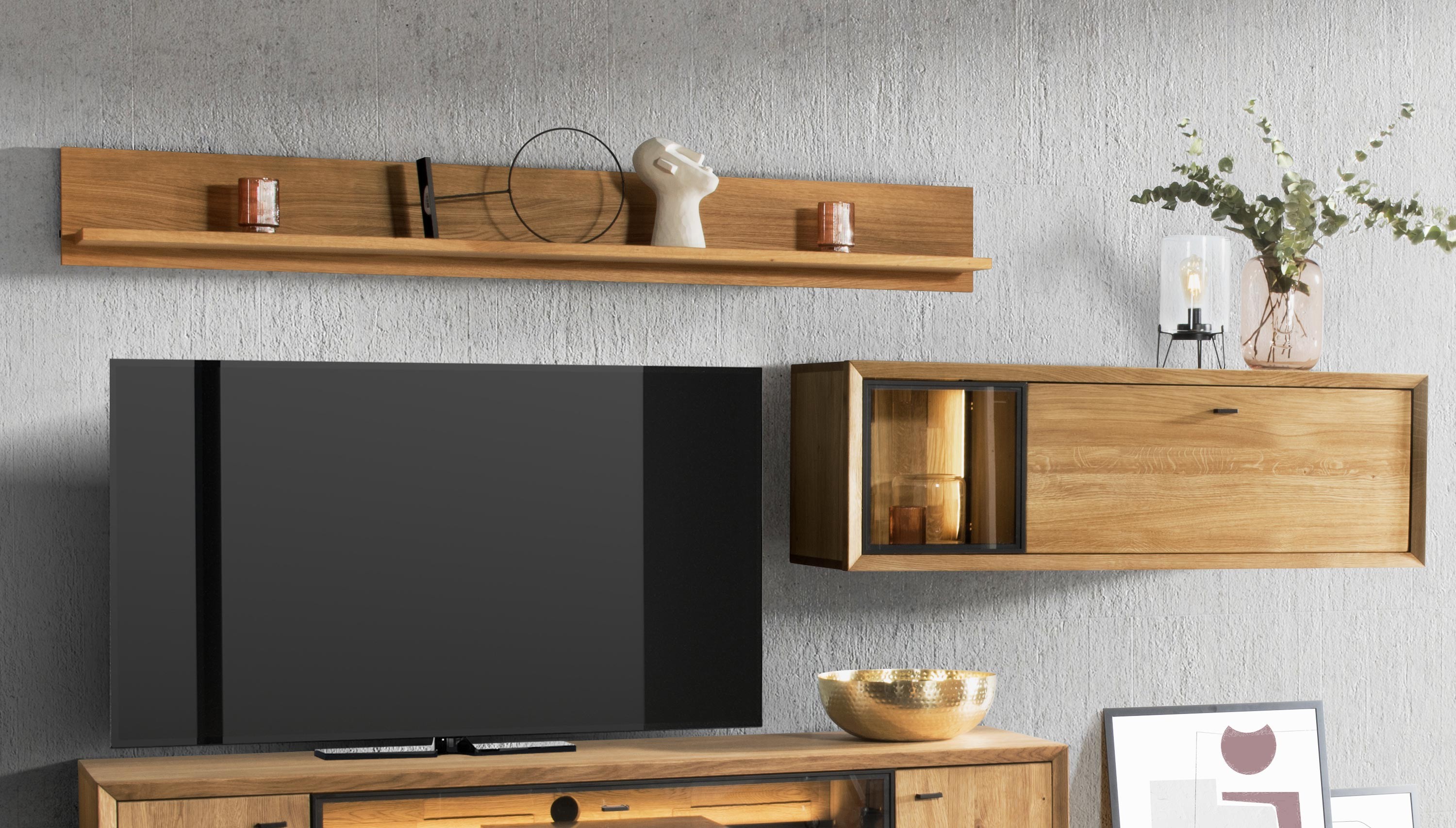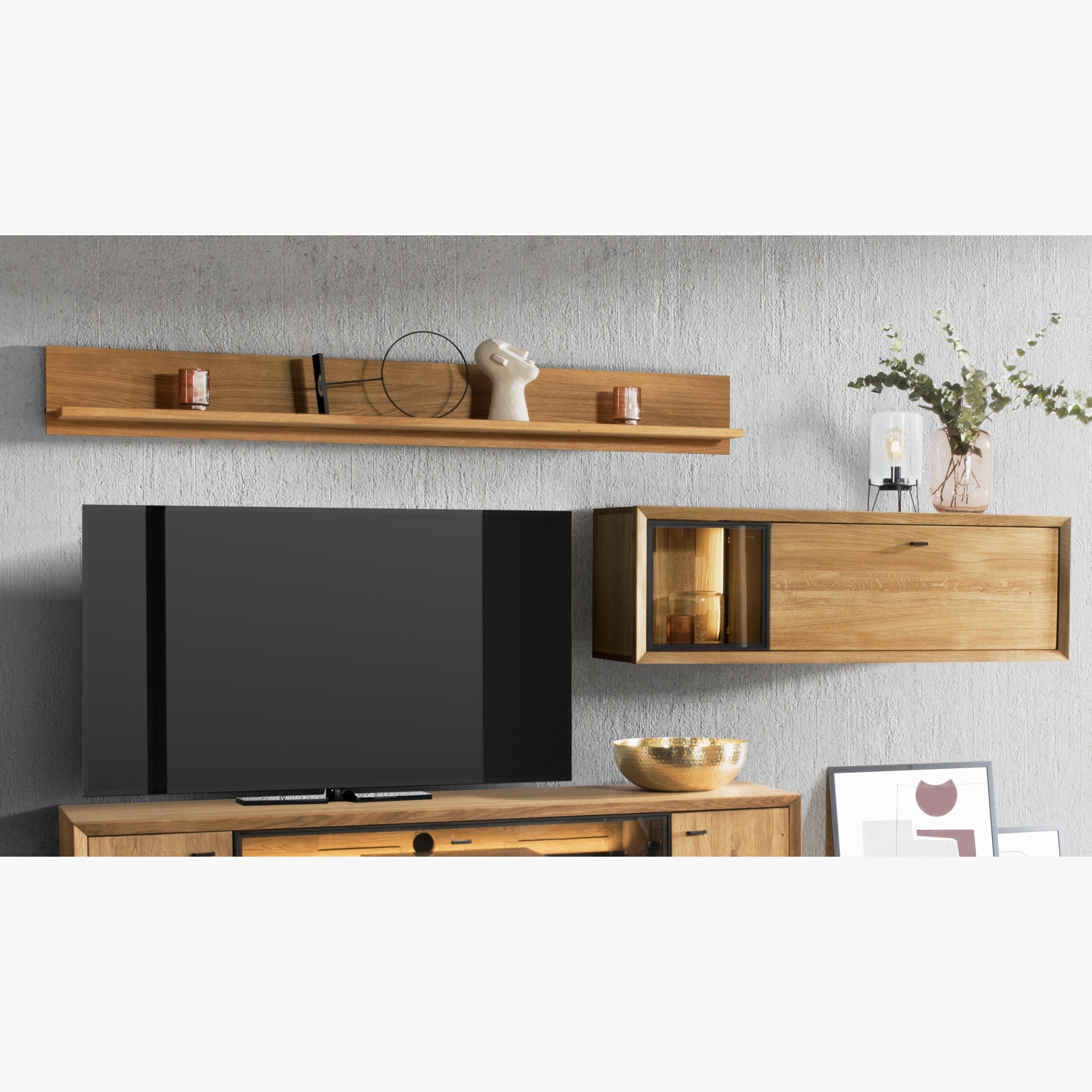 Závesná nástenná polica s policami. polica sa inštaluje priamo na stenu podľa priloženého návodu a je určená na vytvorenie kompletnej obývacej steny. Najlepšie sa kombinuje priamo s televíznou komodou z kolekcie Vilo. Polica je vyrobená v kombinácii dubového dreva a prírodnej dubovej dyhy, dodáva sa v demontovanom stave s jednoduchou montážou.