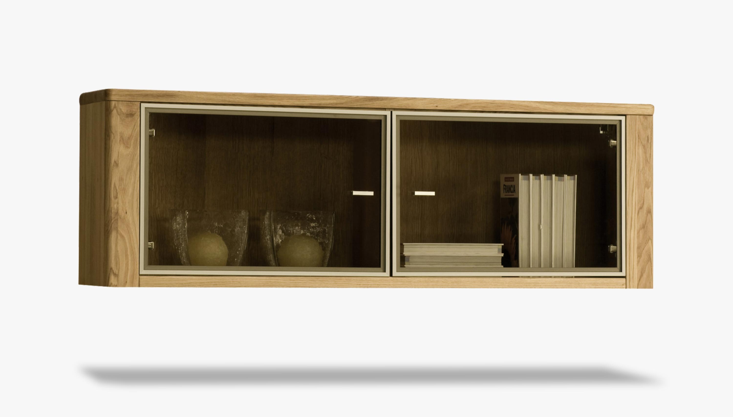 Závesná masívna polica má vnútorný priestor krytý presklenými dvierkami s minimalistickým hliníkovým rámikom a s elegantnými úchytkami. Vertikálnou stenou je skrinka rozdelená na dva rovnako veľké sektory. Samozrejmosťou je tiché samo-zatváranie dvierok soft-stop.